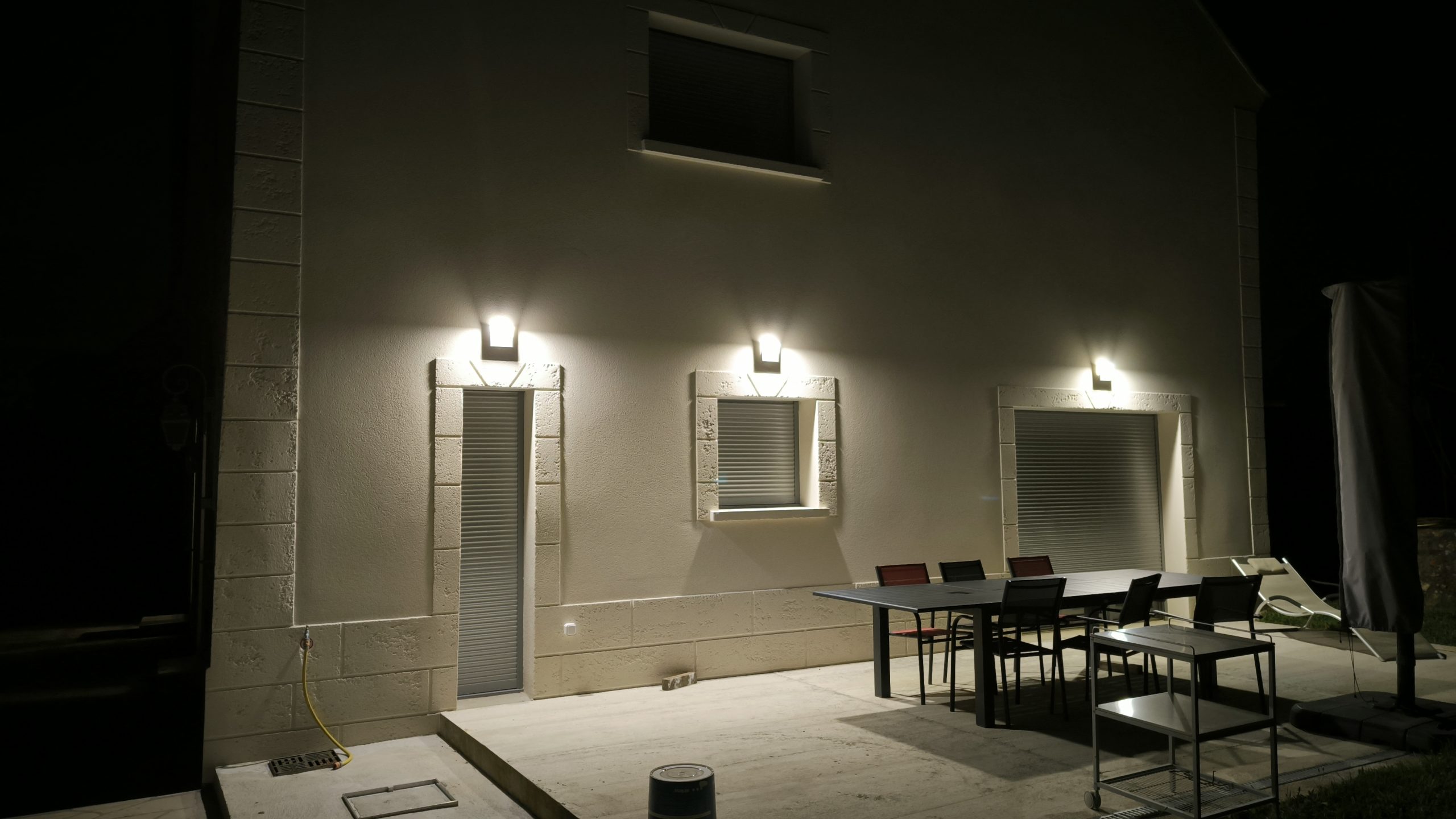 Petite soirée sympa sans pluie : gogo perceuse dehors 🙂 Ce soir j’en profite pour poser les appliques sur le pignon au niveau de la terrasse. 2 trous par luminaire et c’est tout bon.