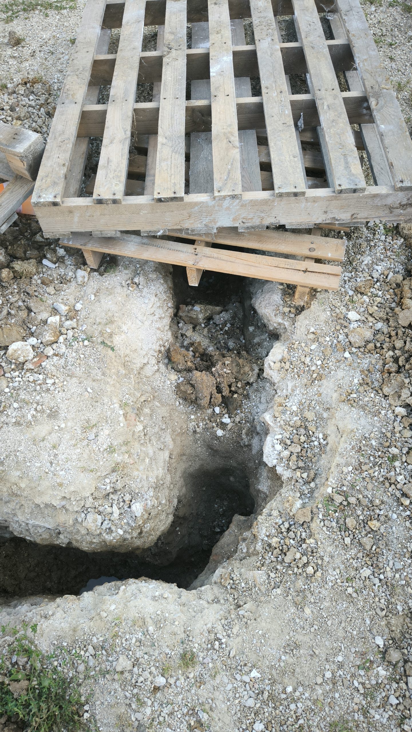 Quand la tranchée a été creusé en 2021 par mon plombier, le bout de la pelle a arraché ce tuyau de drainage et sa protection et ne l’ont pas réparée (pourquoi ???). chose étrange, une grosse pierre était judicieusement posée devant la partie basse de l’évacuation pour éviter que la terre ne rentre dedans… Qui a fait ça et pourquoi boucher sciemment l’évacuation ?