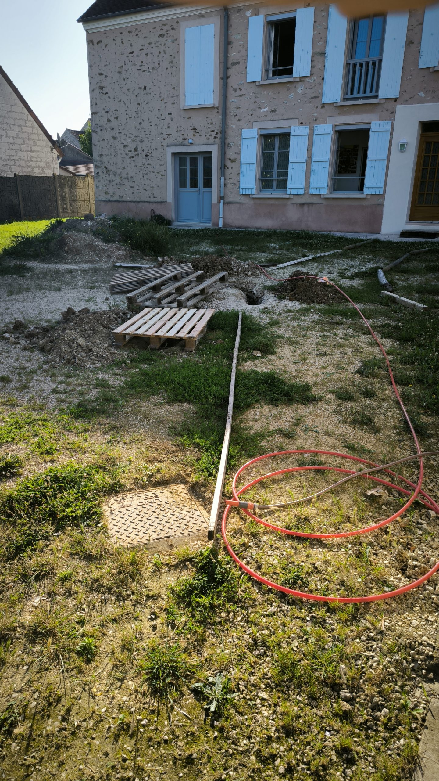 Recherche archéologique dans les photos. J’ai celles de l’article Écoulement et une autre prise de la véranda de l’entrée. Sur ces photos on remarque un bout de tuyau de drainage jaune sur le tas de terre… je me dis que c’est ça qui a été arraché et je commence donc à estimer où était la tranchée. Avec mon fils on tente aussi de passer un per dans l’évacuation de la gouttière : bingo il passe et au bout de 10 bloque…. en retirant le tuyau je trouve du gravier dedans. C’est donc bien bouché et 10m ça correspond à là où est posé le tuyau jaune sur la terre (seconde photo de l’article cité précédemment).