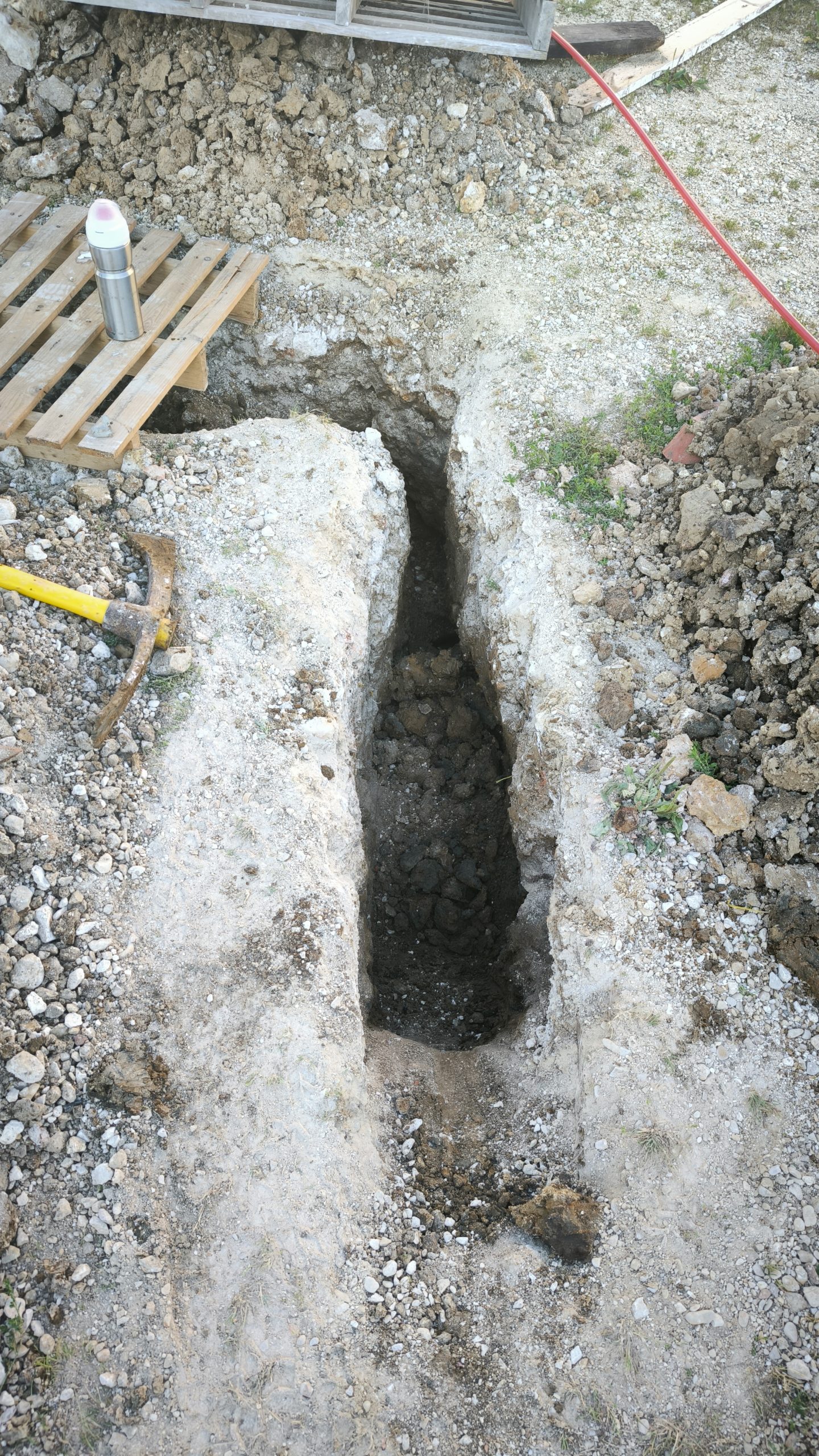Le plombier était revenu faire une seconde tranchée car il s’était trompé d’écoulement et s’était raccordé sur l’eau de pluie au lieu des eaux grises.. parfait, il faut donc que je retrouve l’ancien regard (toujours cf article Écoulement) pour m’y repiquer. Un soir entier et rien que du sol ultra dur plein de cailloux (comme partout dans la cours)… La nuit portant conseil (et n’y voyant plus rien), je laisse là mes avancées.
