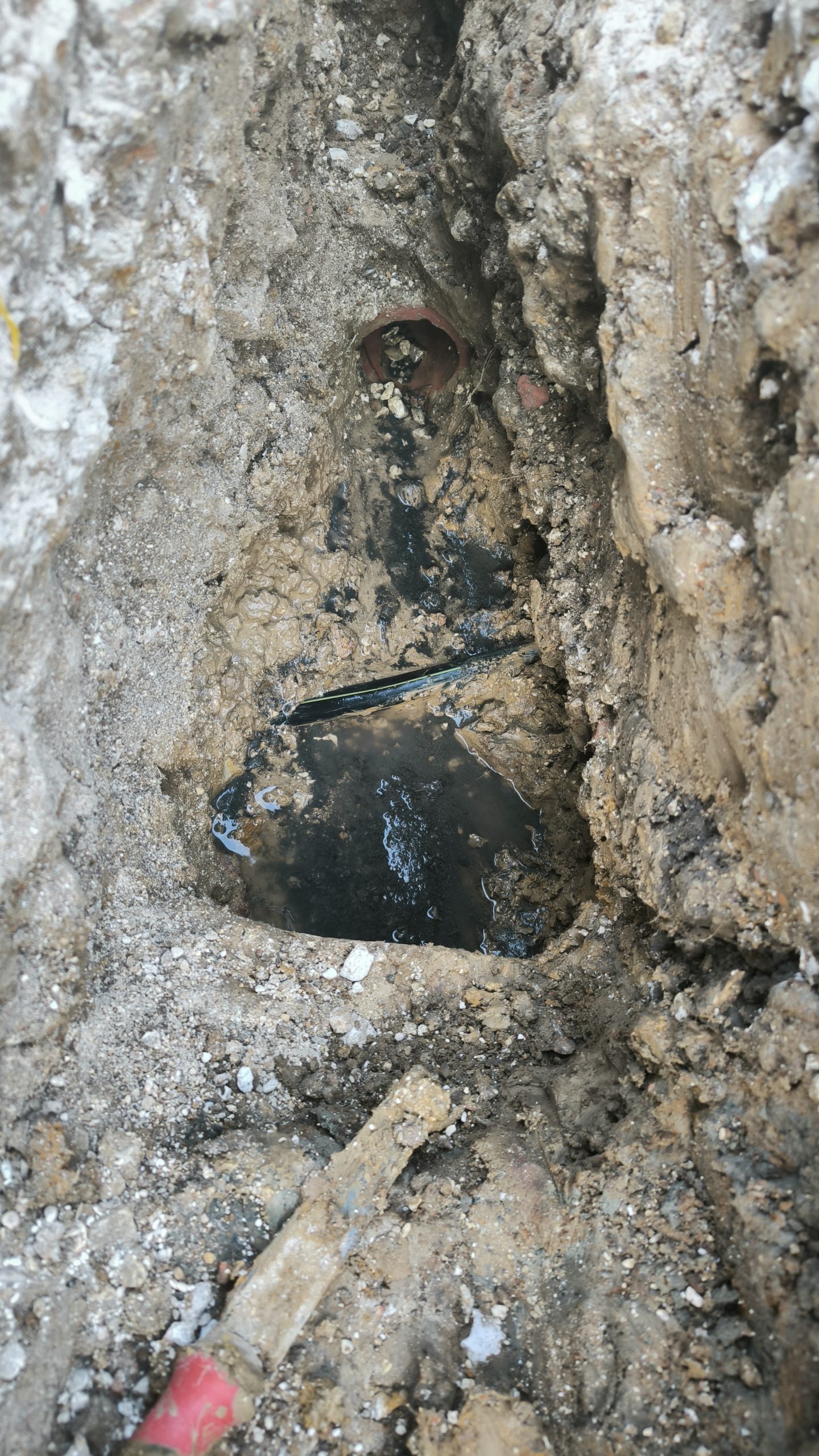 Un peu d’explication. Quand on regarde cette dernière photo on remarque un tuyau noir avec un liserait jaune au milieu : c’est l’ancien tuyau de gaz. Dans l’eau en bas a gauche mais on le voit mal, il y a l’ancienne arrivée d’eau en plomb. Mon analyse est la suivante : Dans les années 2020 quand l’entreprise est venue raccorder la maison au gaz, les ouvriers ont cassé la conduite en terre cuite. Ils l’ont remplacée par un tuyau de drainage jaune (simplement emboitée dans les tuyaux de terre cuite) et ont reposé dessus la protection en terre cuite/béton.