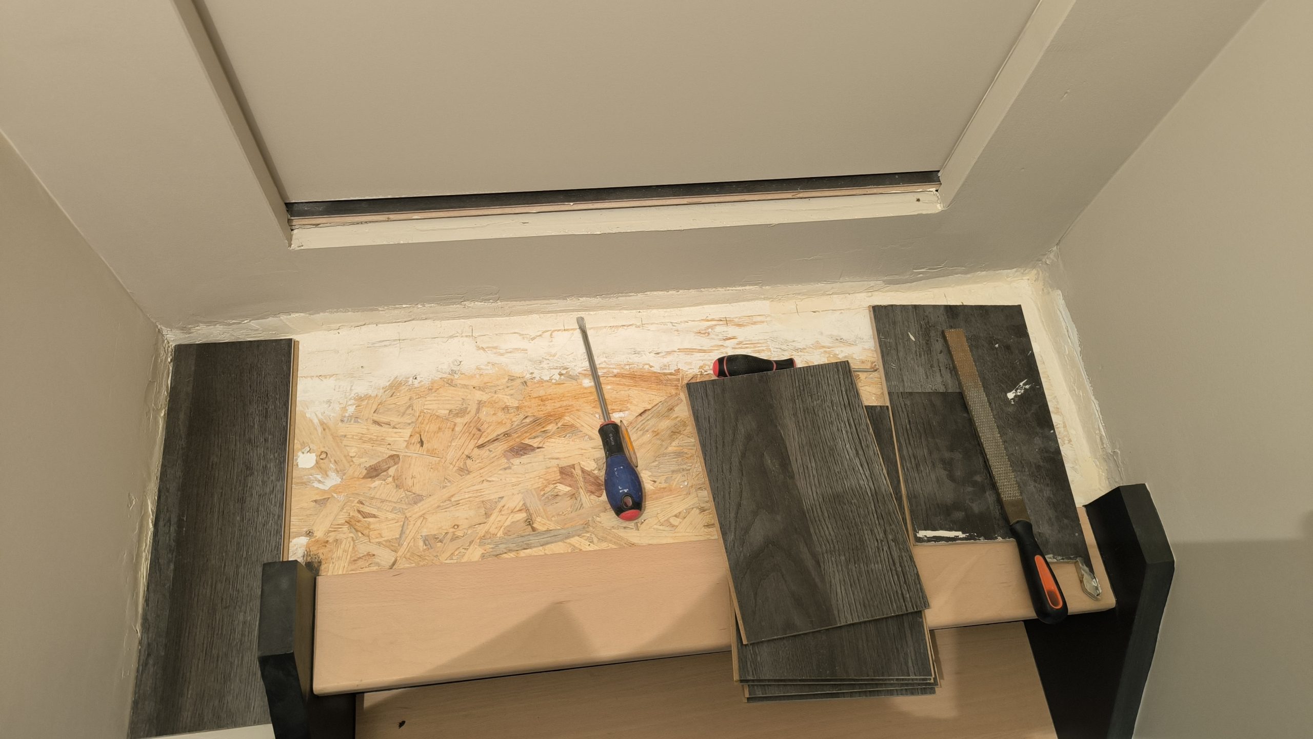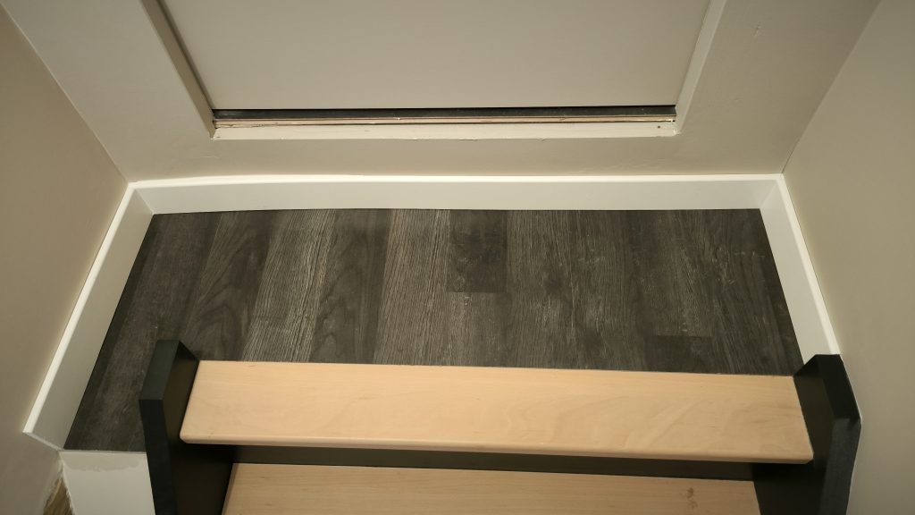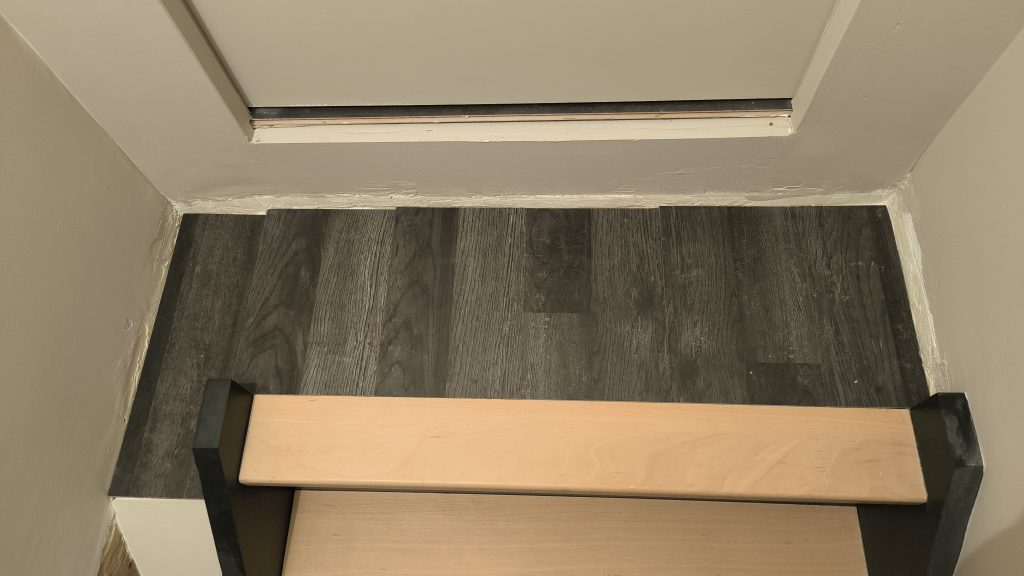 Pendant que le peintre s’occupe de peindre en blanc toutes les plinthes du premier que j’ai tout juste fini de poser, je m’occupe du palier devant la porte du grenier en haut de l’escalier. Rien de bien compliqué. J’ai réutilisé le parquet flottant qui était dans la chambre du bas avant les travaux. Quelques coups de scie radiale, un collage de plinthe et du joint acrylique et le tour est joué. manque peut être une barre de seuil, à voir.