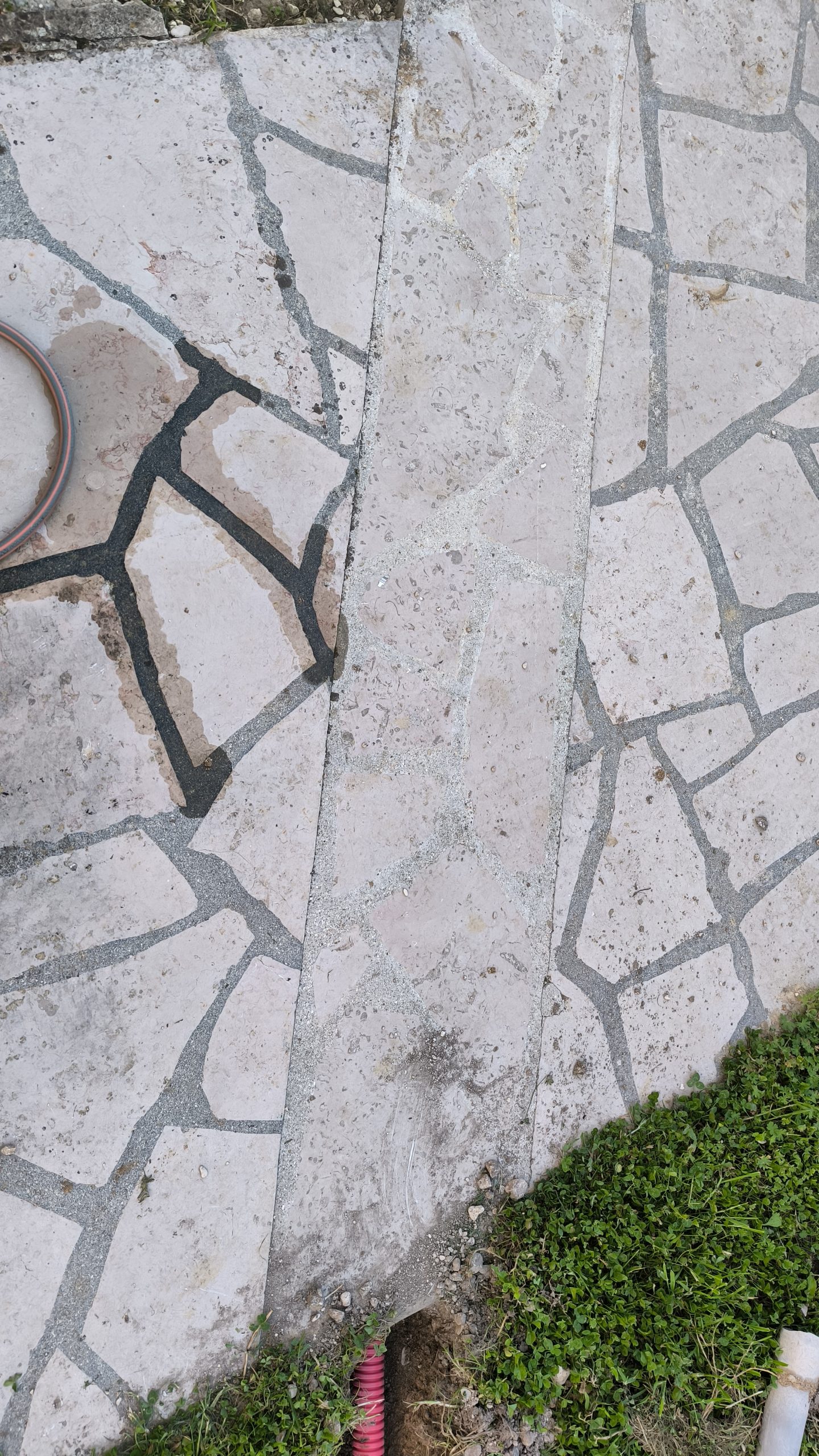 Je creuse donc un trou en longueur côté jardin et j’utilise un tuyau d’évacuation en diamètre 50mm (le même que le fourreau) pour creuser dans le mélange sable/cailloux. ça marche pas mal en ébréchant le bout du tuyau et en tournant… et ça marche encore mieux quand je suis allé prendre la grosse masse 🙂