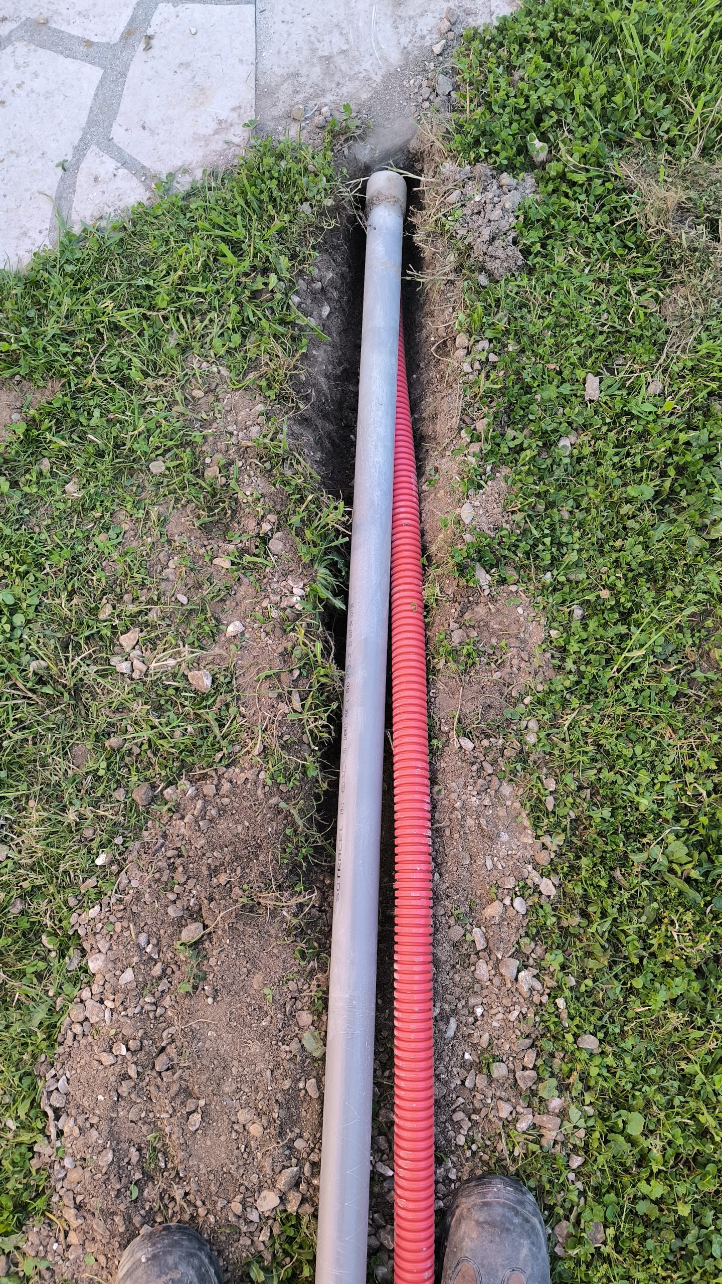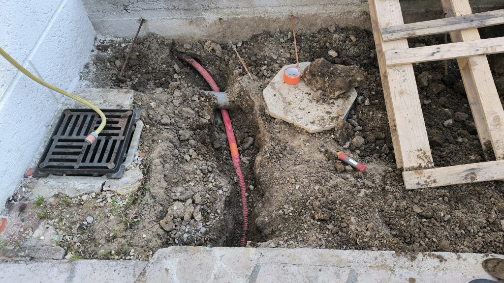 Lors des travaux dans la cuisine, j’avais laissé un fourreau aller dehors pour un éventuel éclairage de la terrasse. J’avais aussi laissé un fourreau du côté de la salle à manger pour aller au puits, à l’arrière de la maison ou ou pour la terrasse. J’ai aussi fait passer un fourreau vers l’abri de jardin.. Ça en fait un peu trop pour la terrasse.