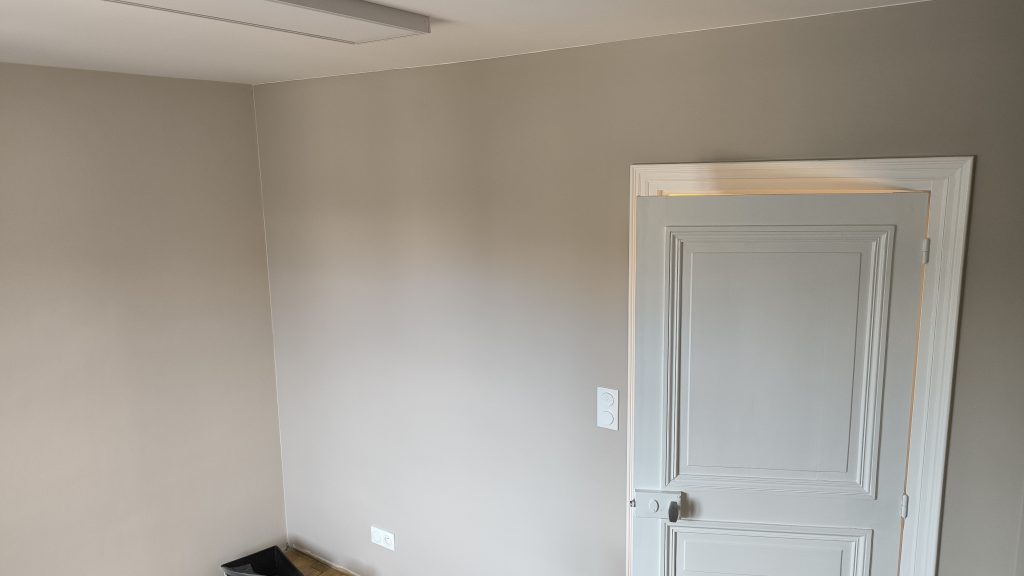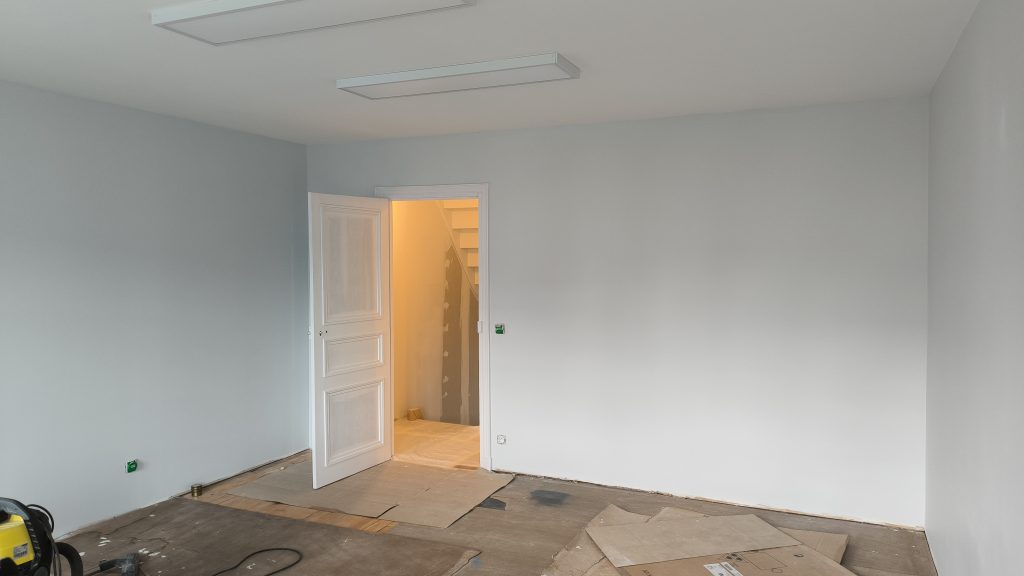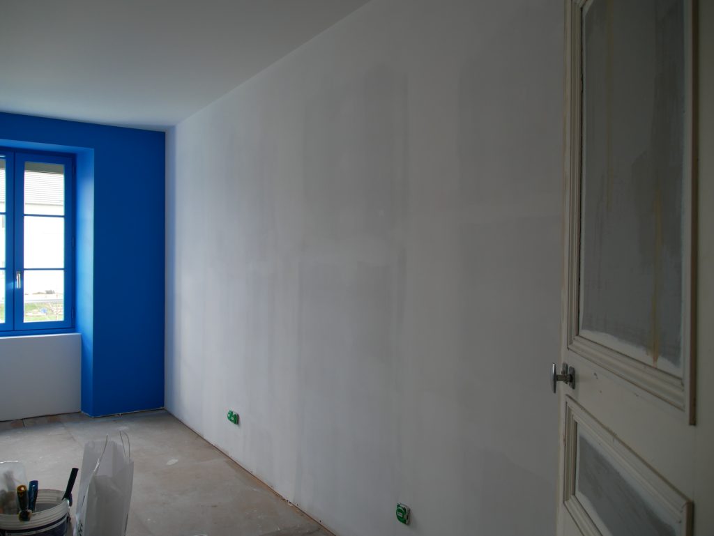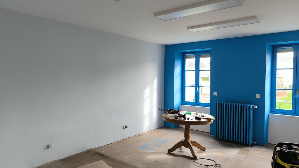 Après plusieurs semaines de présence le peintre vient de finir les peintures dans la travée 3 : celle des bureaux. Il a aussi préparé le plafond et les murs du couloir.
