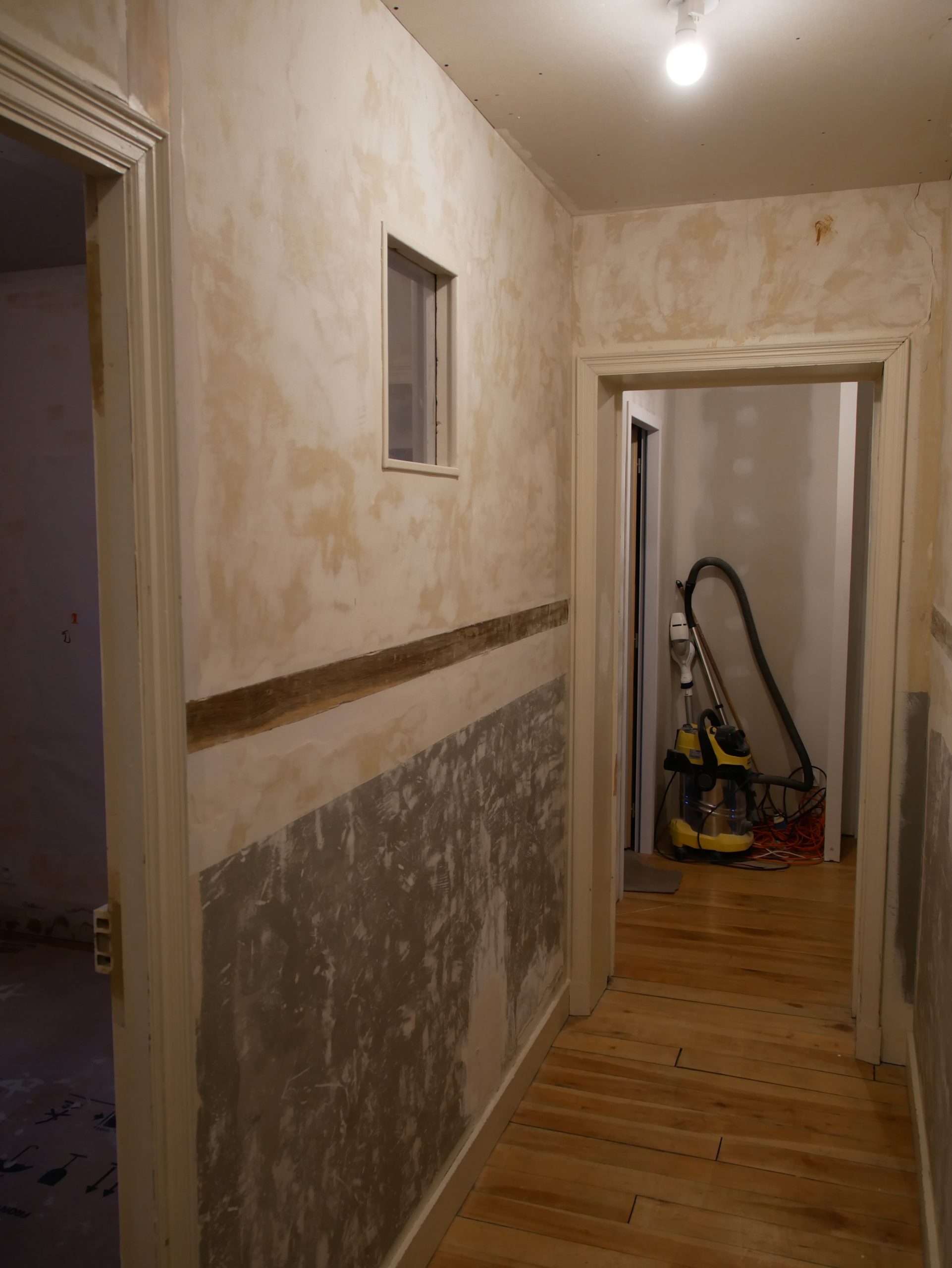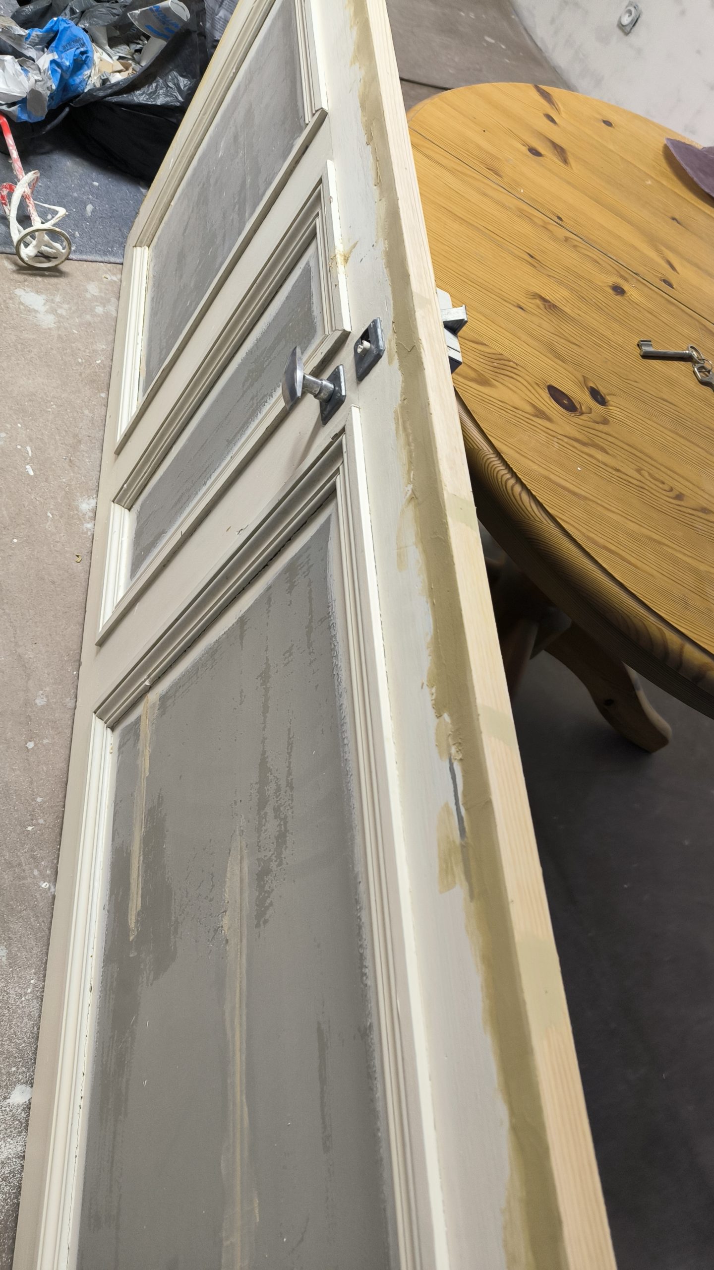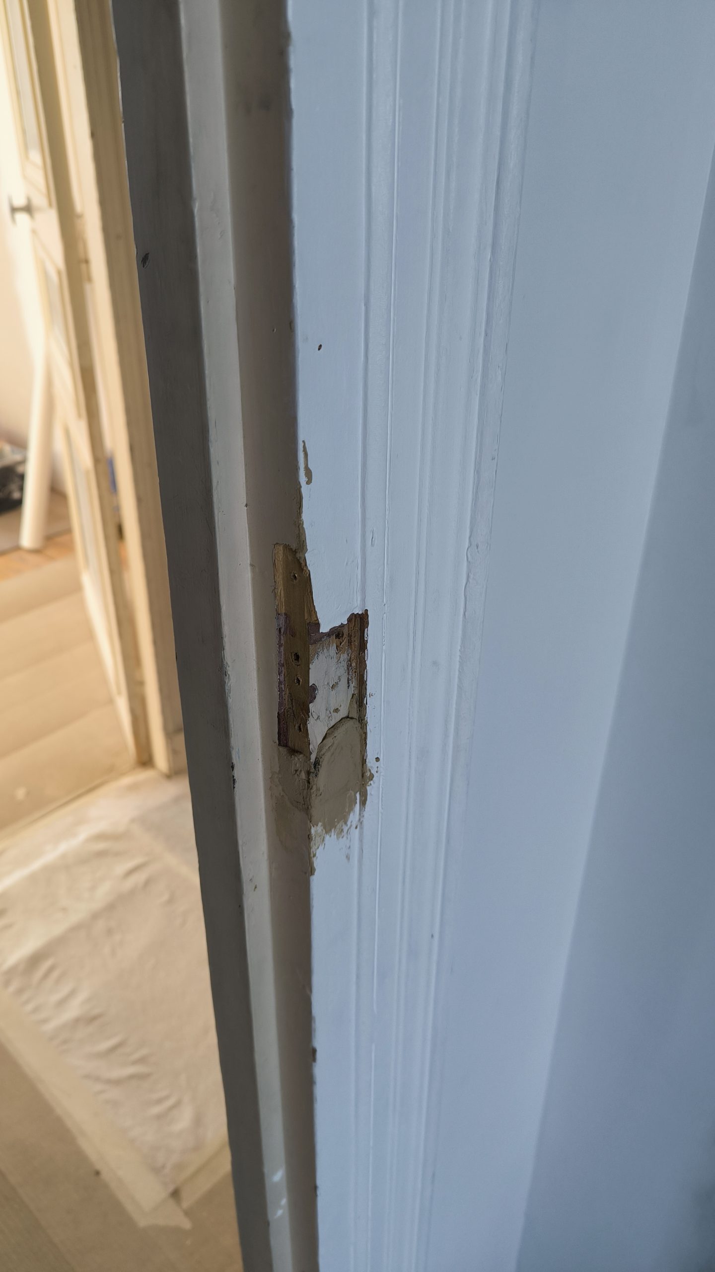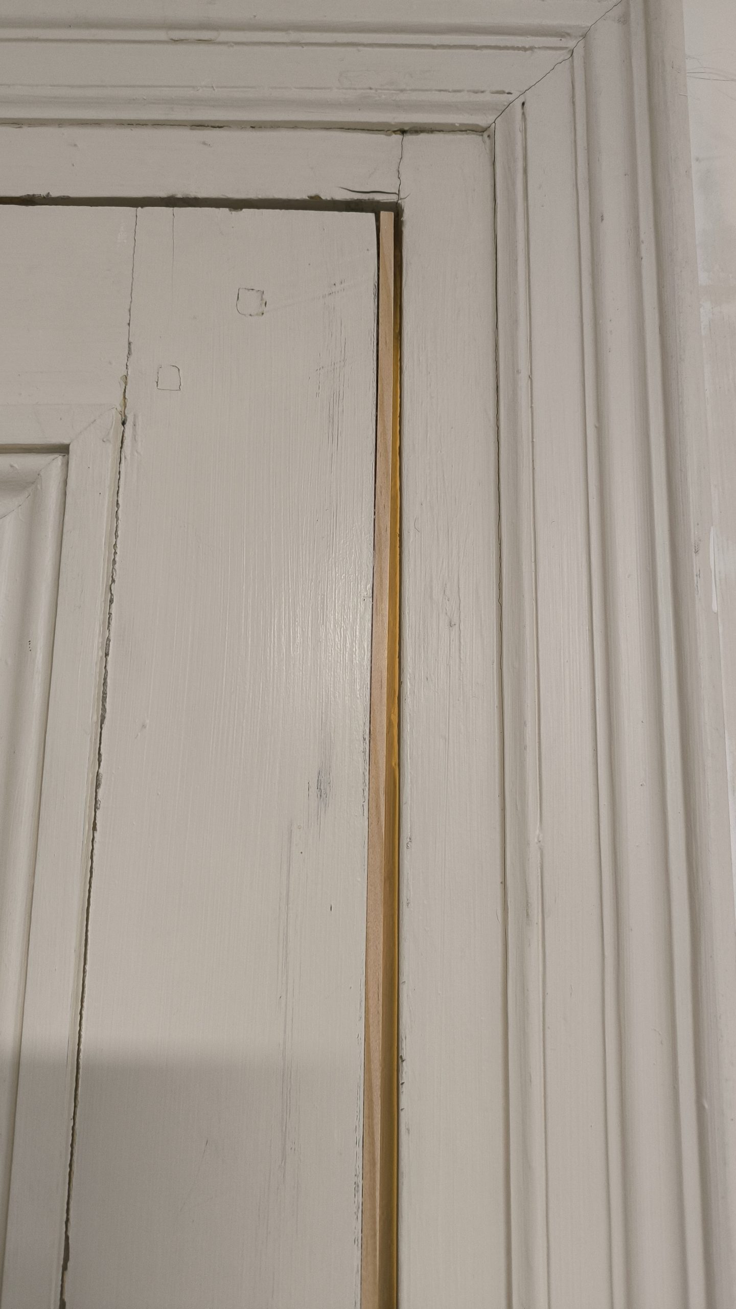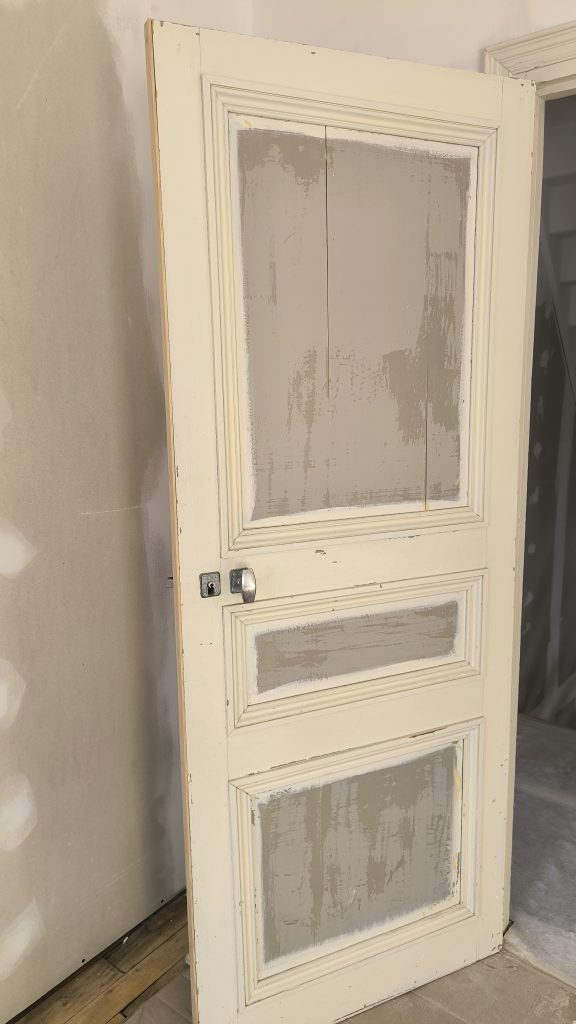 Avant qu’il ne peigne les portes, j’ai dû faire quelques réparations et notamment leur rajouter 5mm de largeur. Avant cette opération elles touchaient tout juste le chambranle. Et j’ai aussi rectifié quelques trous disgracieux… :