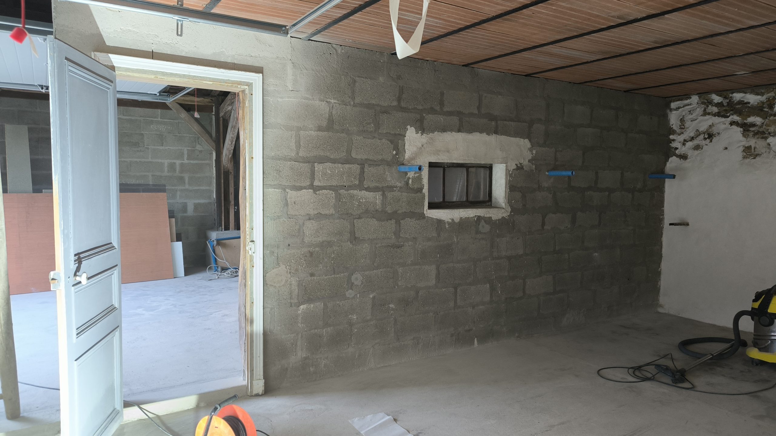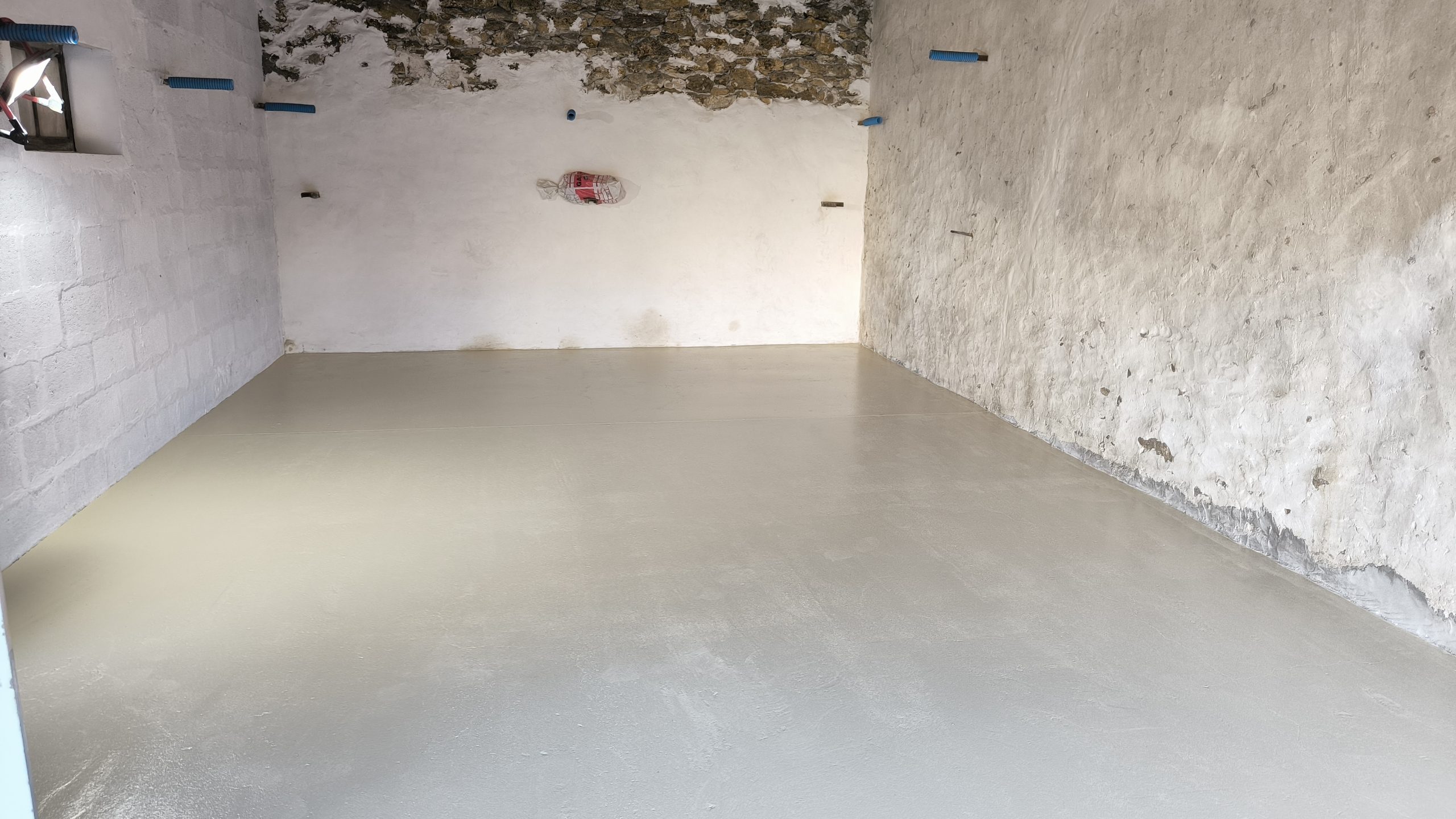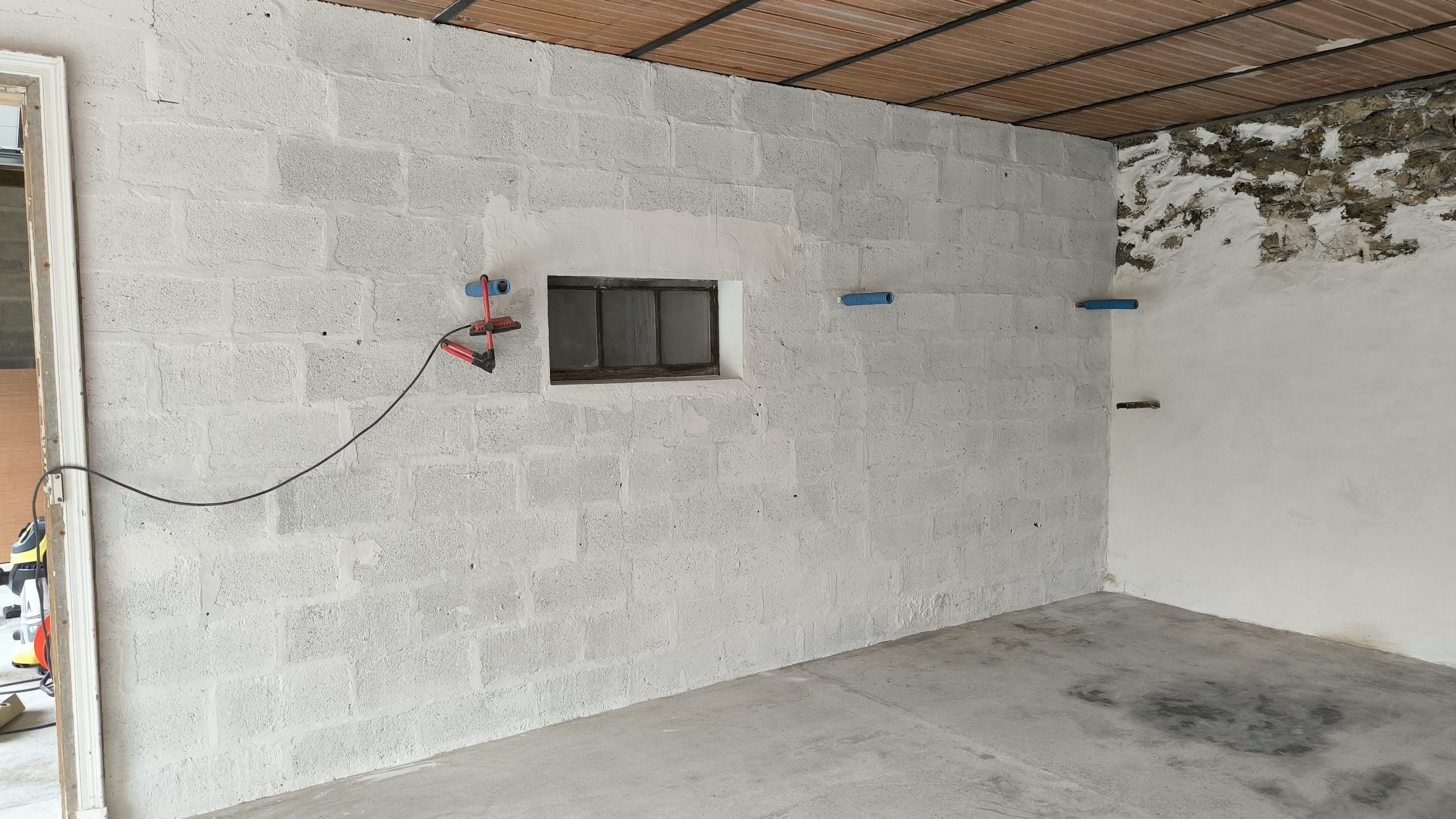 Suite du chantier avec la mise en peinture des murs parpaings de l’atelier avec tous les restes de pot de peinture blanche que j’ai pu trouver. Le sol est réalisé avec une peinture spéciale sol en 3 couches. Astuce : fixer le rouleau au bout d’un manche à balai. C’est bien pratique !