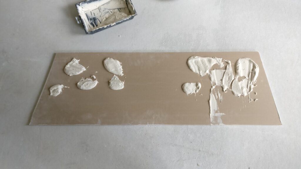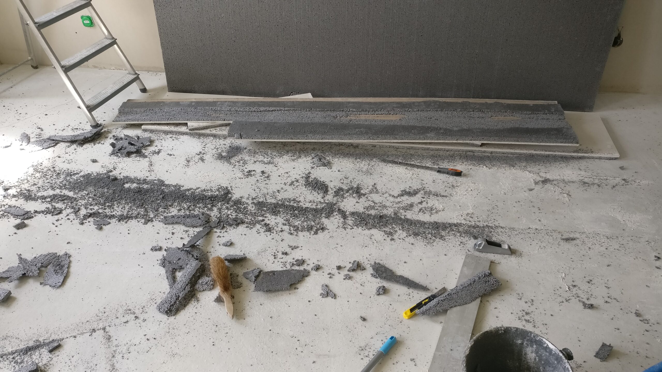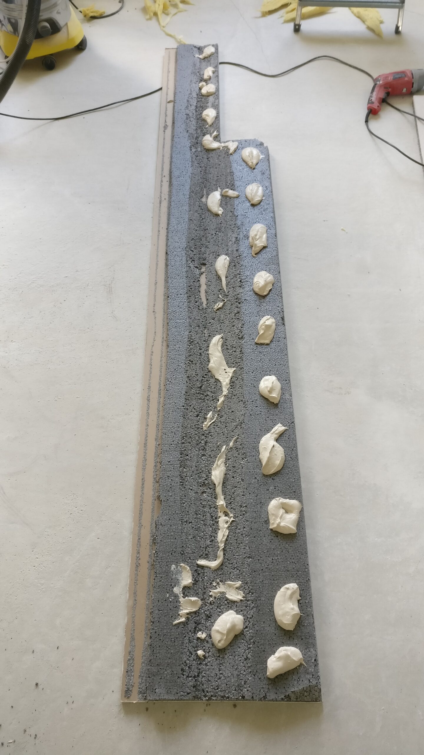 La première consiste à façonner la plaque de plate qui va au dessus de la fenêtre. Dans mon cas la plate sera collée au MAP sur l’ancien mur et vissée dans le rail métallique j’ai placé à la bonne hauteur quand j’ai fait le mur. J’avais laissé un petit centimètre de vide, comblé par la colle.