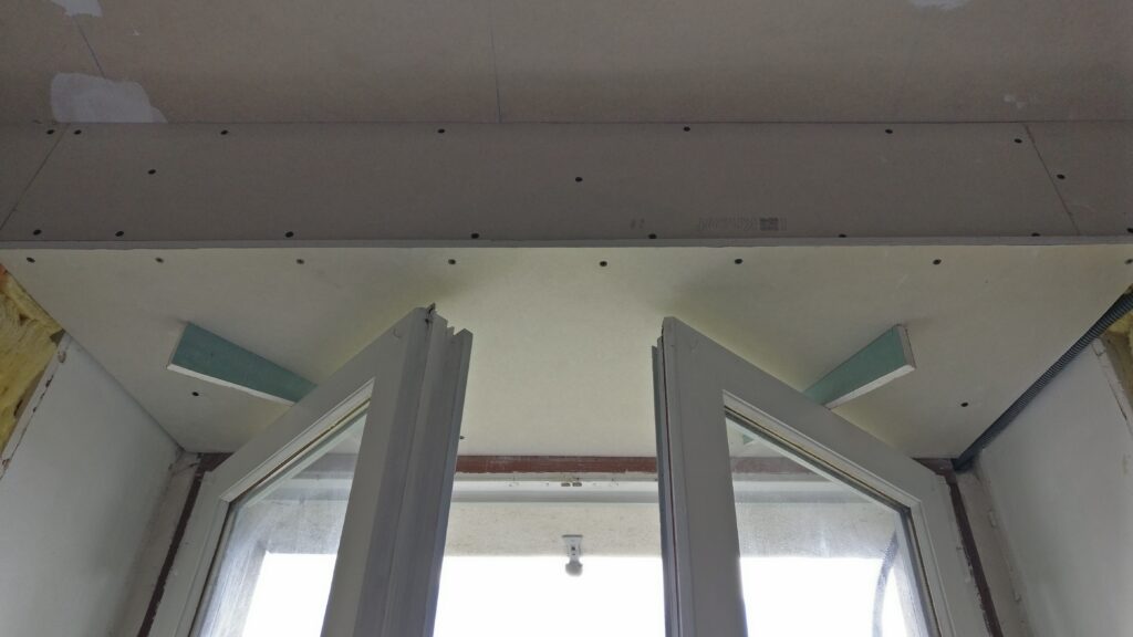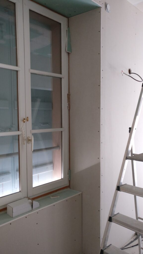 Sur la première photo on voit le cable de l’alarme qui passe, j’ai bien pris soin de ne pas mettre de colle à cet endroit (on ne sait jamais si j’ai besoin d’un peu de mou de câble je pourrai toujours tirer un peu. J’ai utilisé du BA13 (hydro ou non en fonction de la chute utilisée). La planéité est réalisée avec une règle de 60cm et l’alignement est fait en mesurant l’écart avec le haut de l’huisserie.