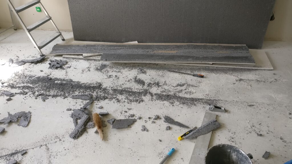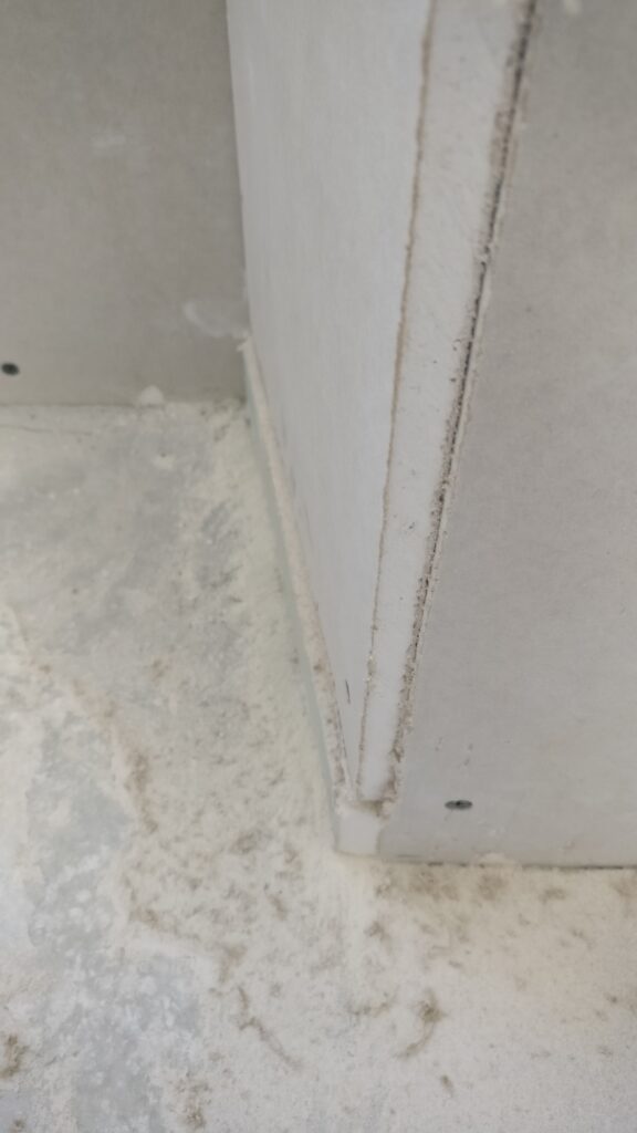 Un autre point que je n’avais pas anticipé est que pour réaliser le plancher chauffant j’avais mis un bout de placo… BA13… et j’ai posé du…BA10.. ce qui fait une belle marche de 3mm au niveau de la plinthe… il ne reste qu’à poncer/découper et remplacer ça.