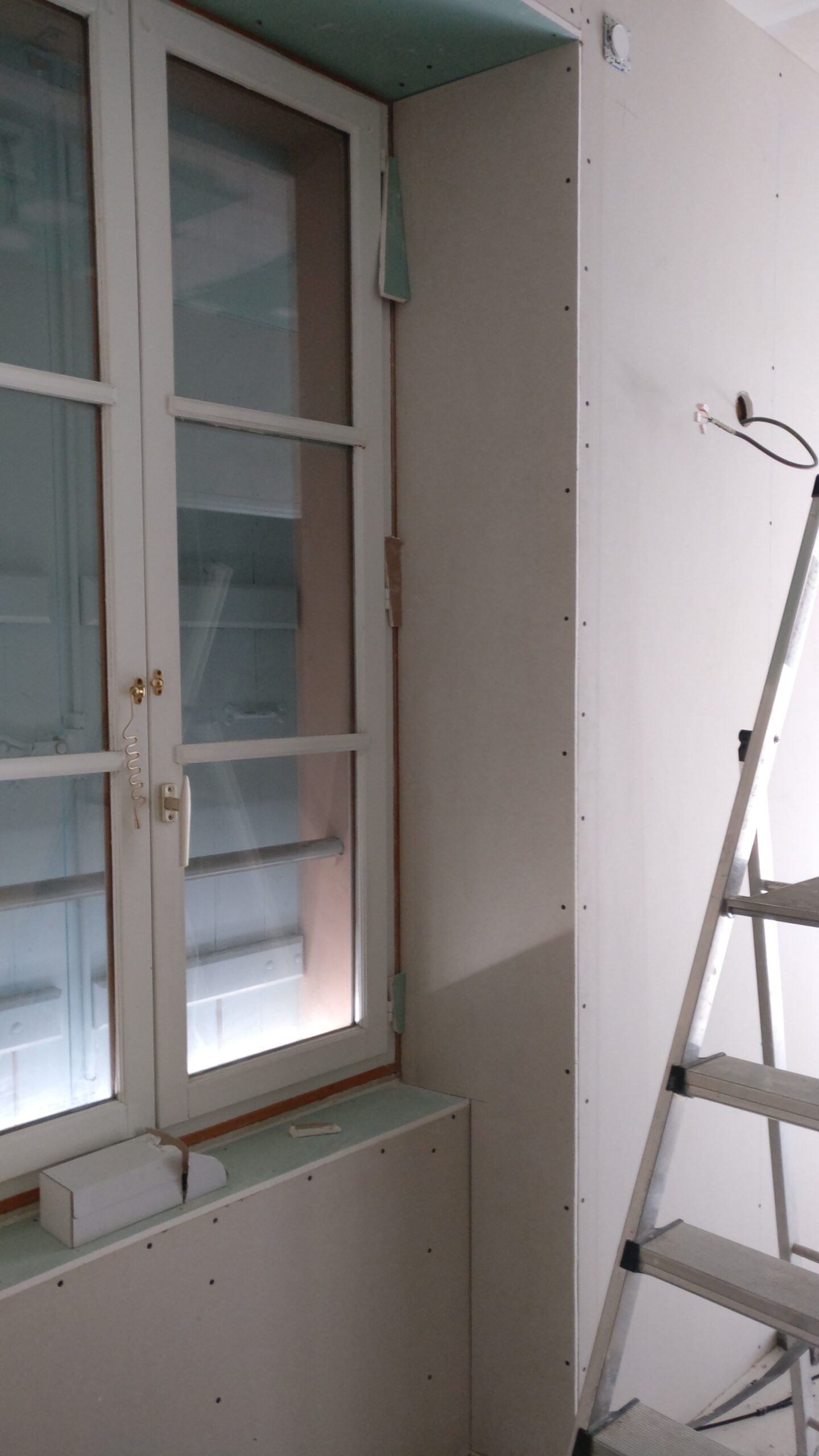 Ce que je n’ai pas anticipé est la surépaisseur du polystyrène…. au niveau de la fenêtre pas de soucis, les huisseries sont entourée de 2cm de plâtre j’ai de la marge… par contre pour mon doublage de mur j’avais prévu un simple placo et j’avais fait en sorte d’avoir des tableaux le plus ouvert possible. Pour que la luminosité soit la plus grande. Au lieu de faire des tableaux à 90°, il sont plus à 110°. Le soucis est que l’isolant touche le mur à mis parcourt.. et je suis obligé de le retirer pour visser sur le rail de mon doublage. 3 jours de galère pour 4 fenêtres…