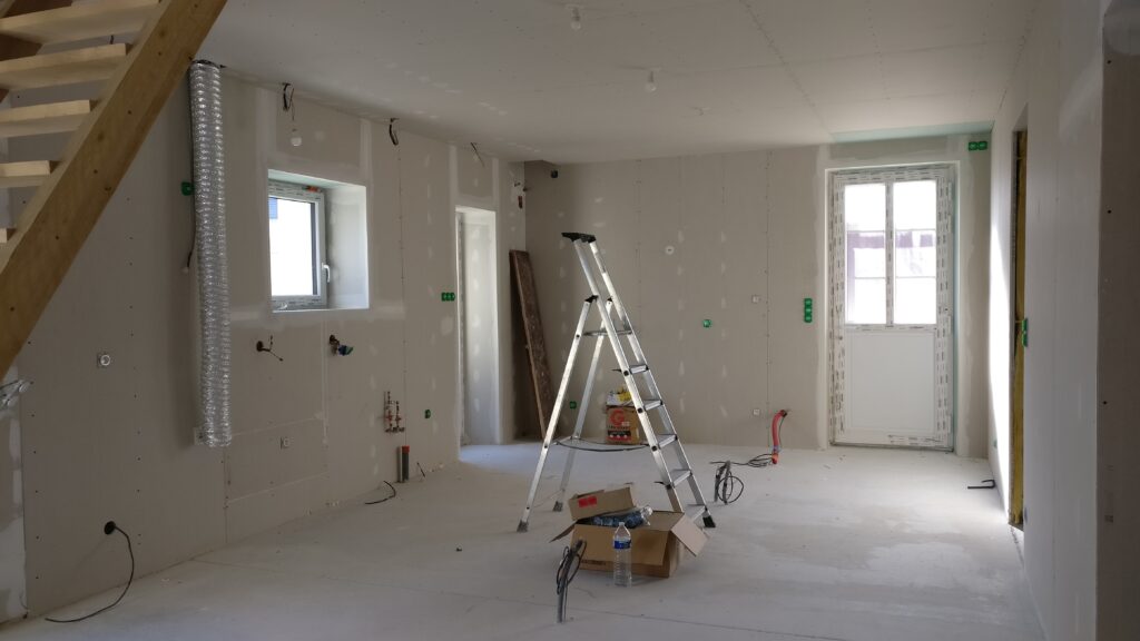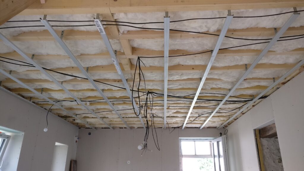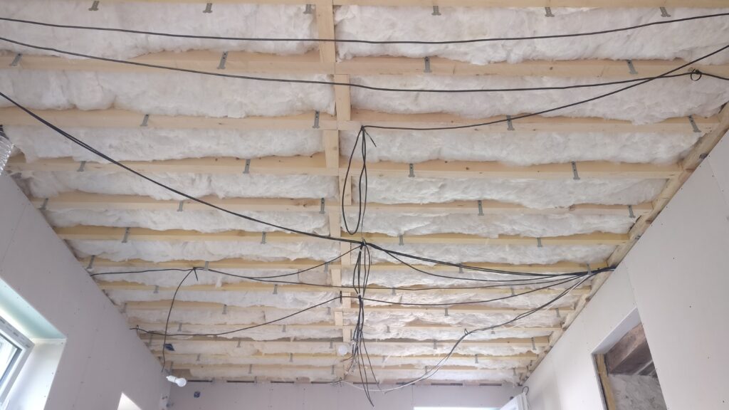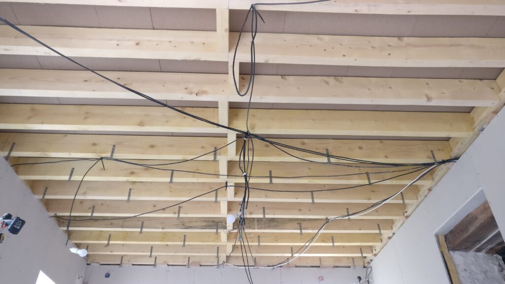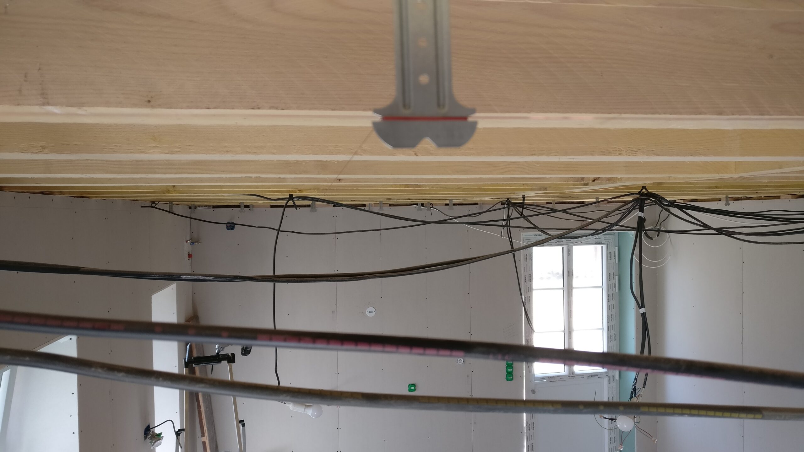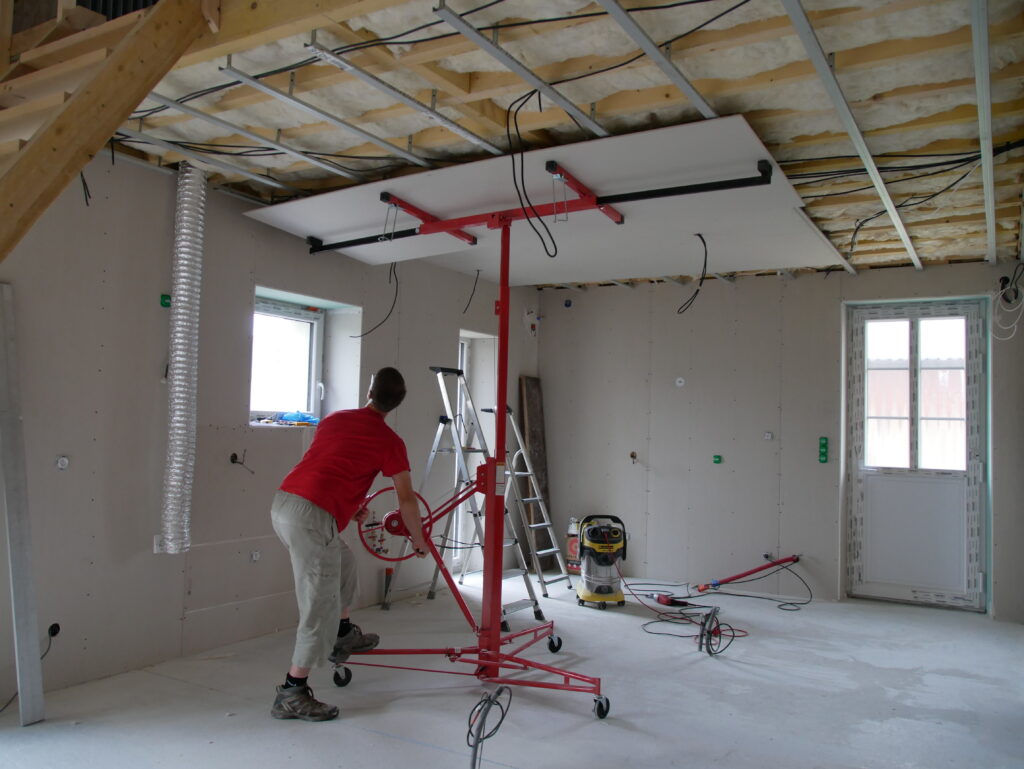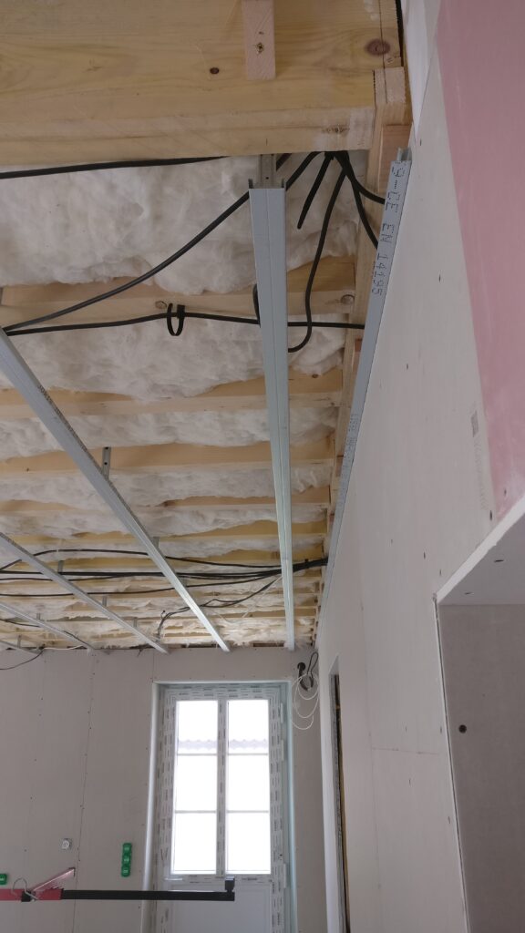 Au tour du plafond de la cuisine de recevoir sa couche de placo. Comme ça le peintre pourra commencer à faire les bandes puis l’enduit pour laisser la place au carreleur qui va intervenir dans la suite parentale.