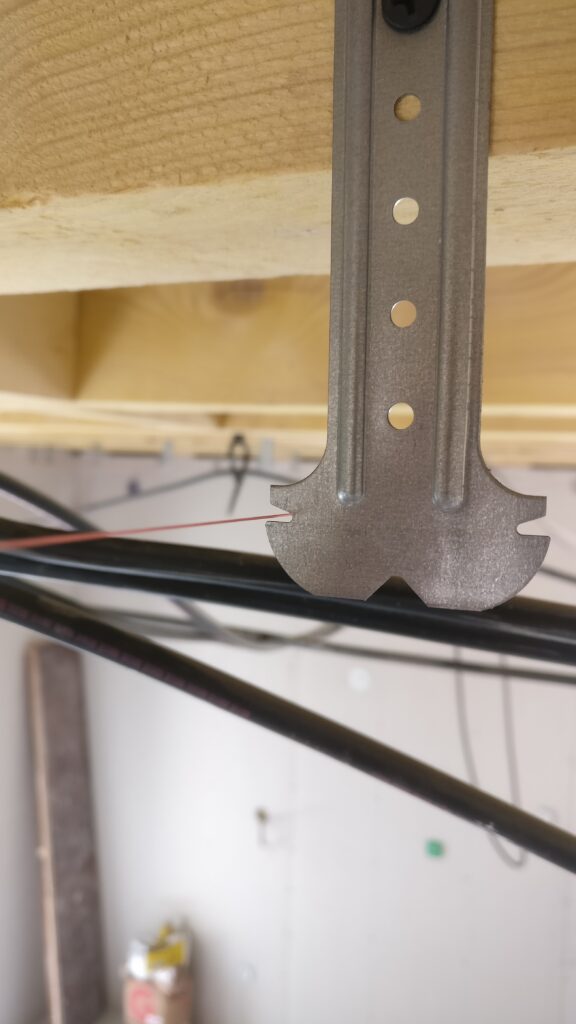 • Positionner les suspentes sur la première et la dernière solive. Il faut choisir un mur à partir duquel on posera les plaques de placo à 90° et on met la première suspente à 10cm, la seconde à 50cm puis les autres toutes les 50cm. Comme une plaque fait 2.50m on tombera sur une fourrure. Les miennes font 3m, c’est donc OK aussi. Pour la hauteur, il faut le faire au laser. J’ai choisi de laisser 7cm sous les solives, ce qui me permet d’y caser un spot.