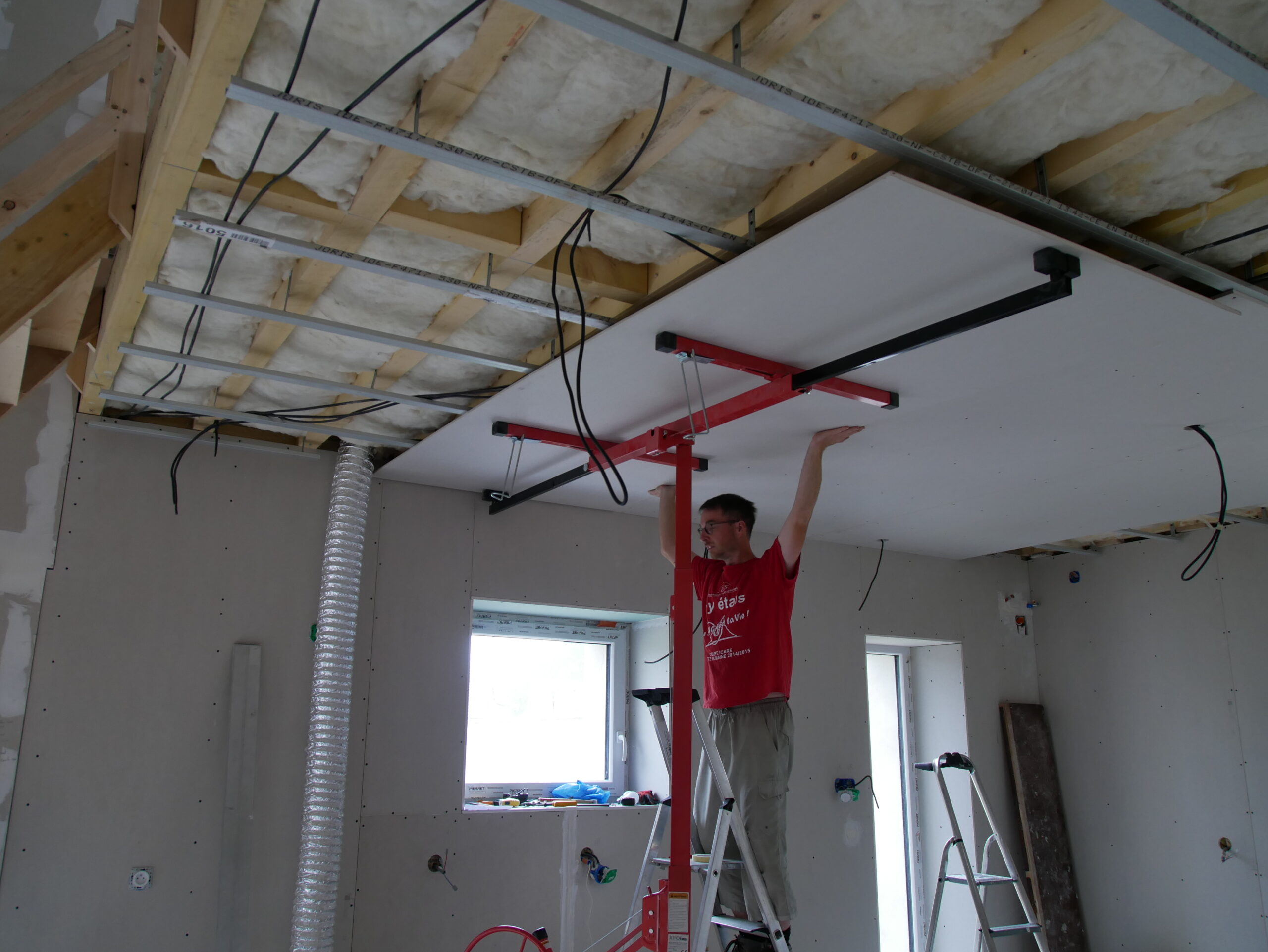 • Ensuite au lève plaque ça se fait tout seul. Chaque plaque posée est vissée tous les 20cm et les trous pour les éclaires sont fait en allant.