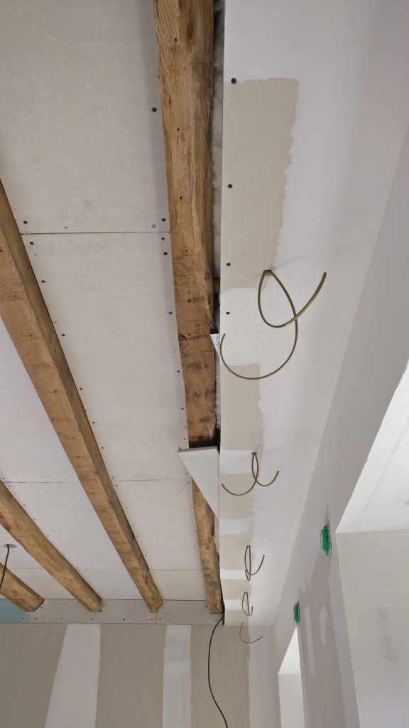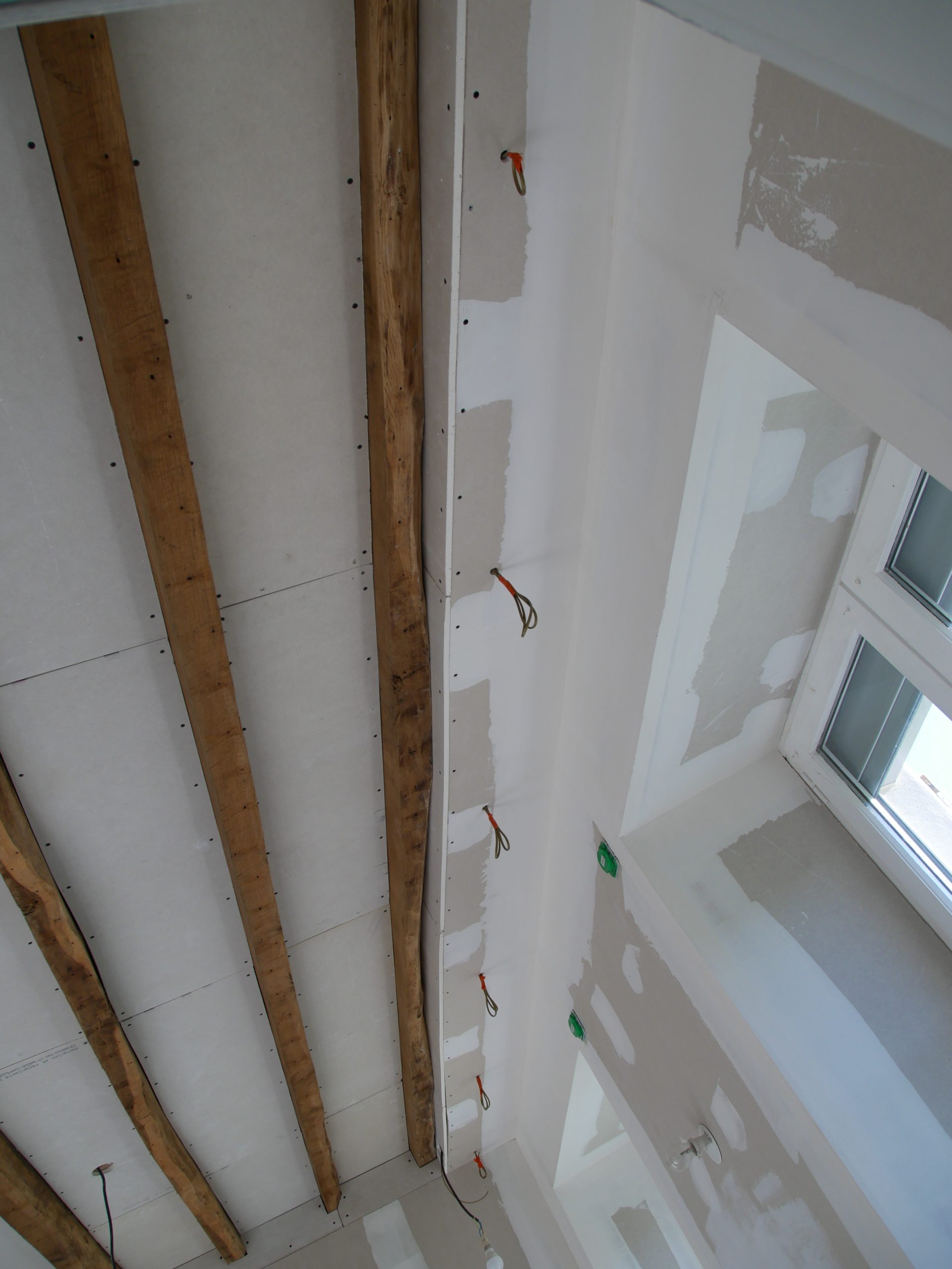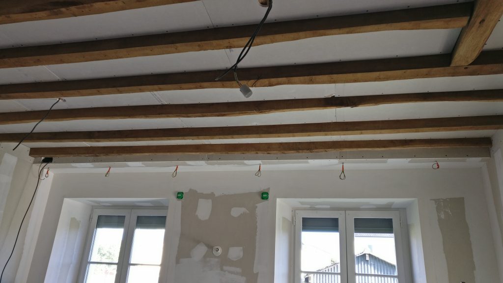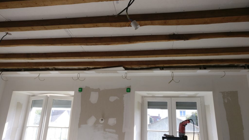 Le carreleur devait arriver demain mardi pour poser le carrelage sur le reste du rez-de-chaussée (salon, entrée et couloir), mais je viens d’apprendre qu’il ne pourra peut-être pas venir cette semaine (problème de santé). Je venais tout juste de finir de poser les placos dans le salon. Pas grave, ce qui est fait n’est plus à faire. Voici ce qui j’ai fait vendredi dernier et samedi :