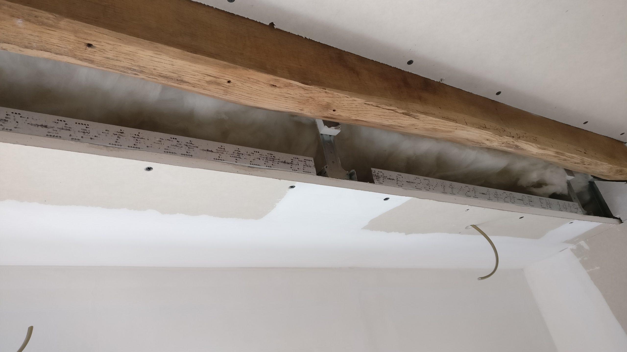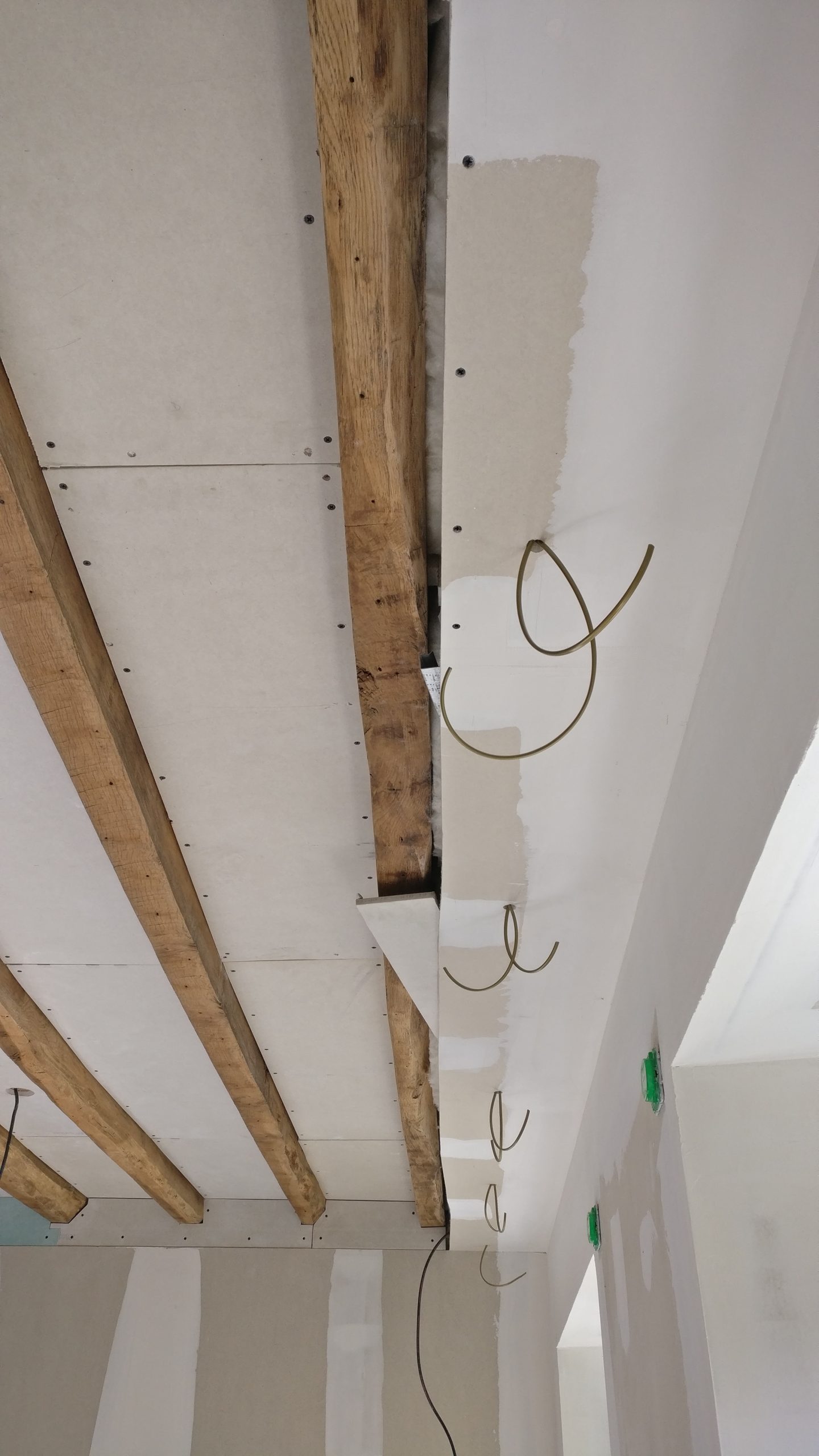 Il y a quelques mois j’avais fait un retour en placo au dessus des fenêtres destiné à recevoir un éclairage diffus (style lampe de la taille d’une pièce de 2 euros). Il me restait à mettre les lampes et refermer le placo… avec une grosse question : où mettre le transfo ?