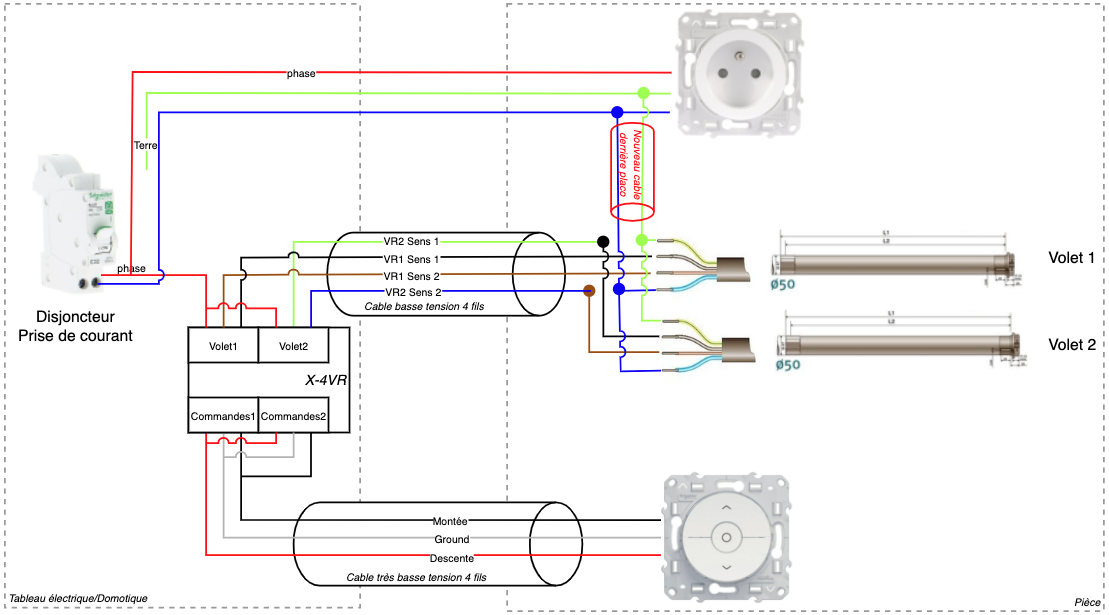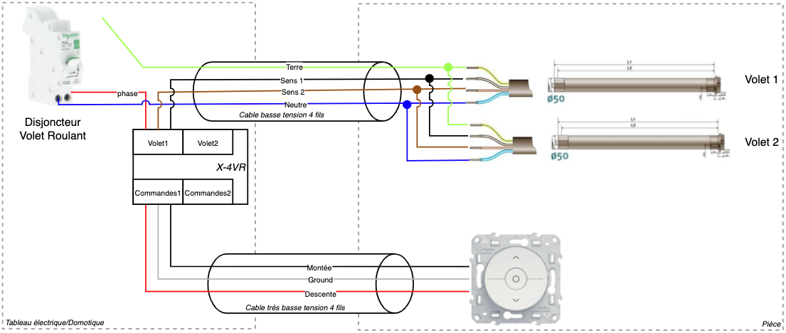 Sur ce schéma on a en bas le bouton qui commande l’X-4VR. J’ai donc un câble électrique 4 fils qui va de l’interrupteur dans la pièce vers le tableau domotique qui est dans le cellier (tension 12Volt).