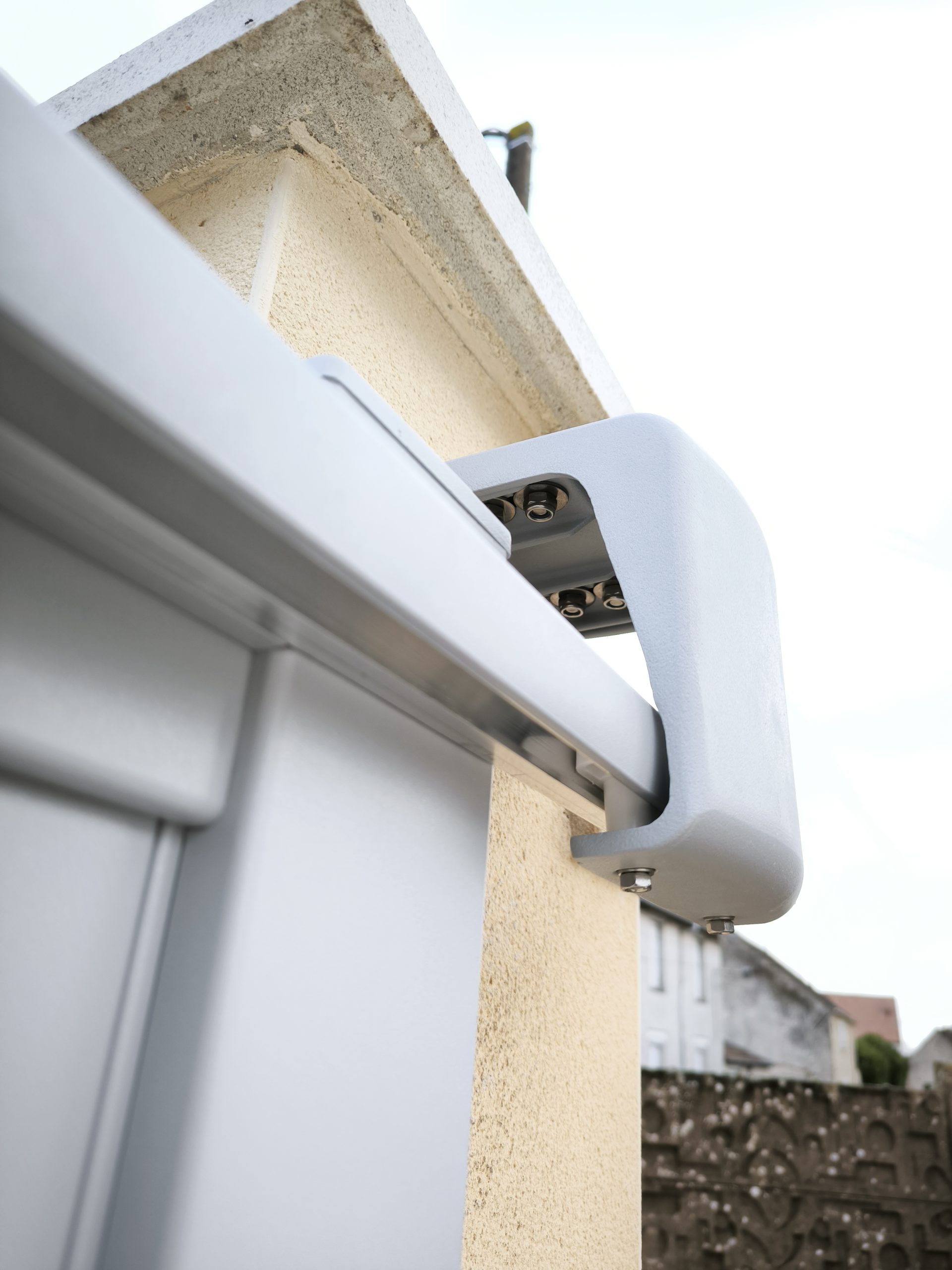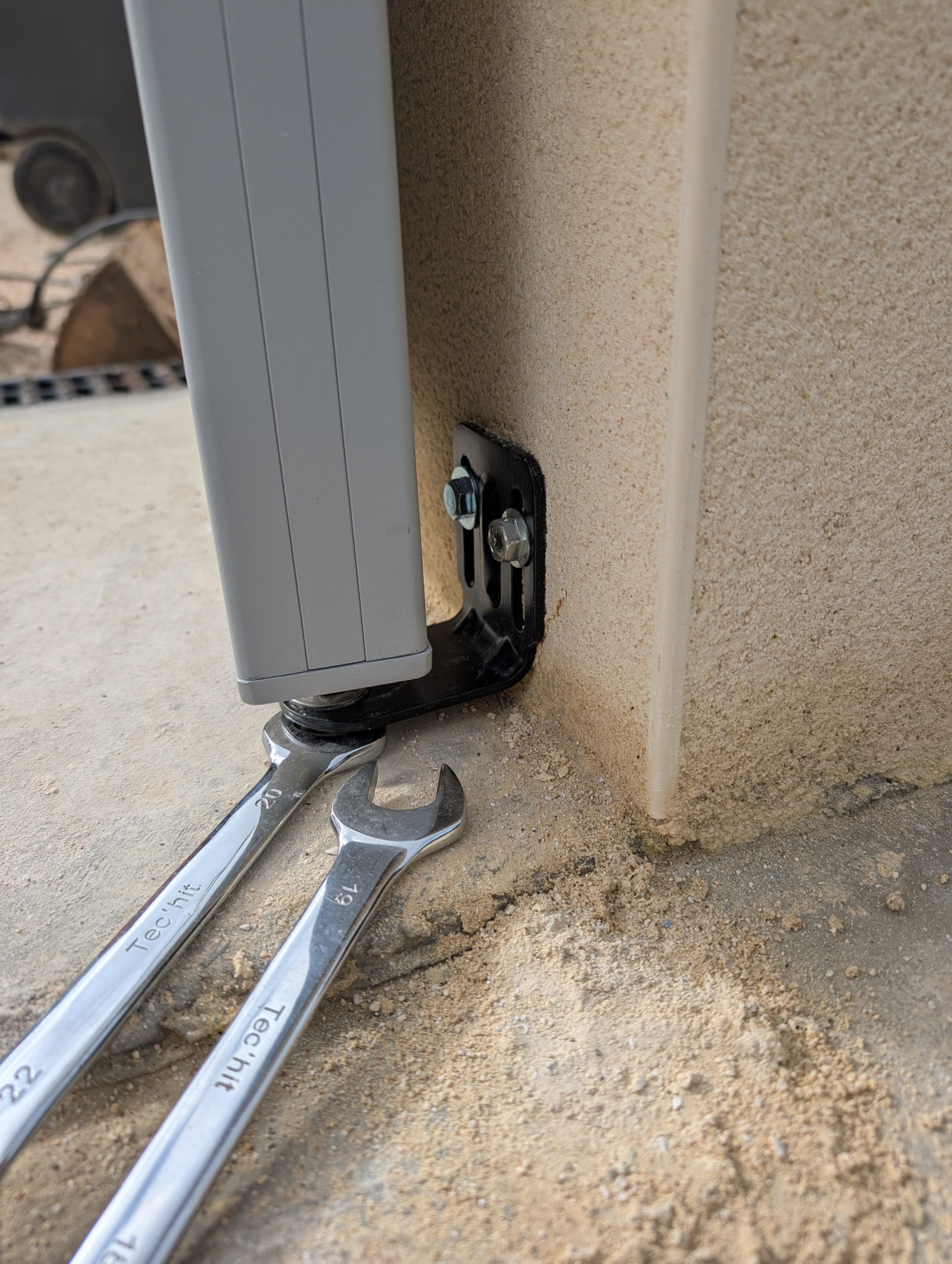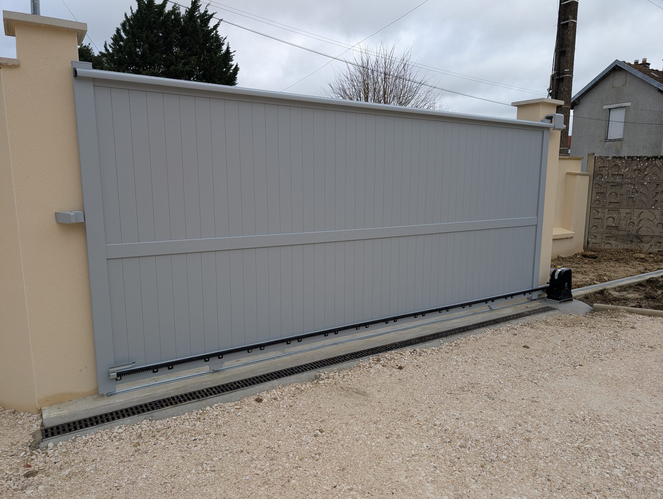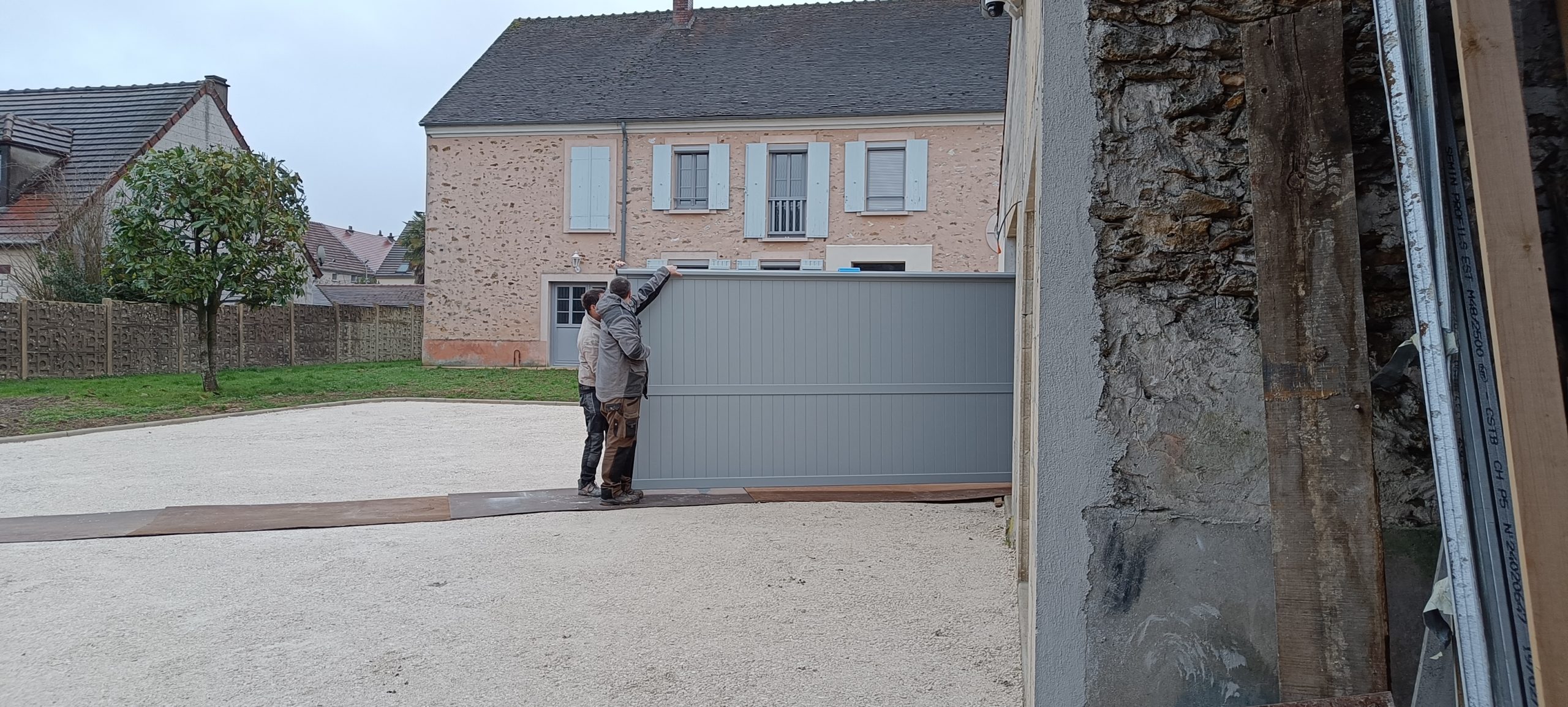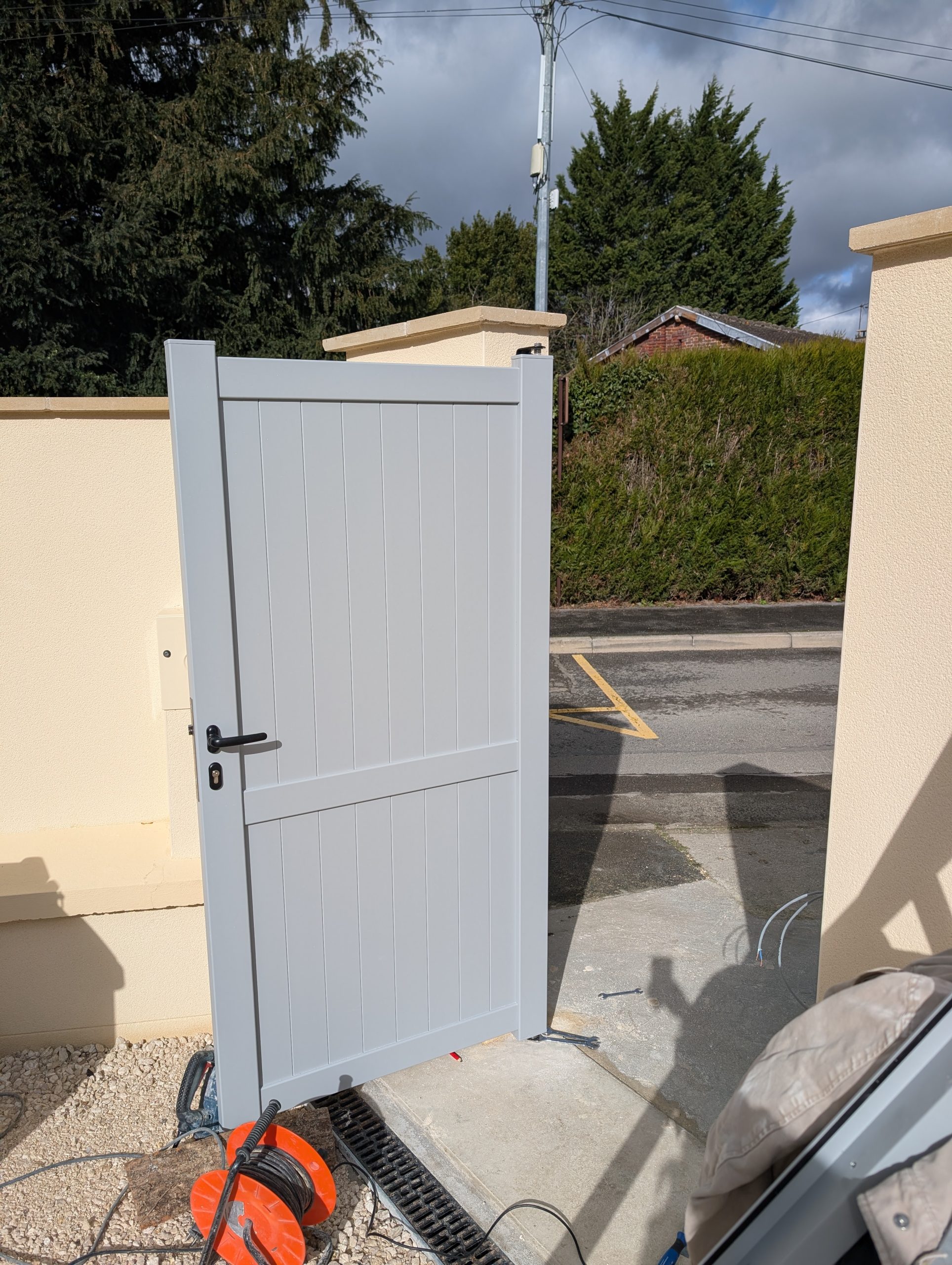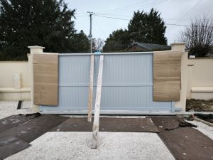 La pose du portail est assez simple. Le plus compliqué est de le sortir du garage et de le positionner à sa place. On l’a fait à trois en 10 minutes le matin puis j’ai passé le reste de la journée à le fixer.