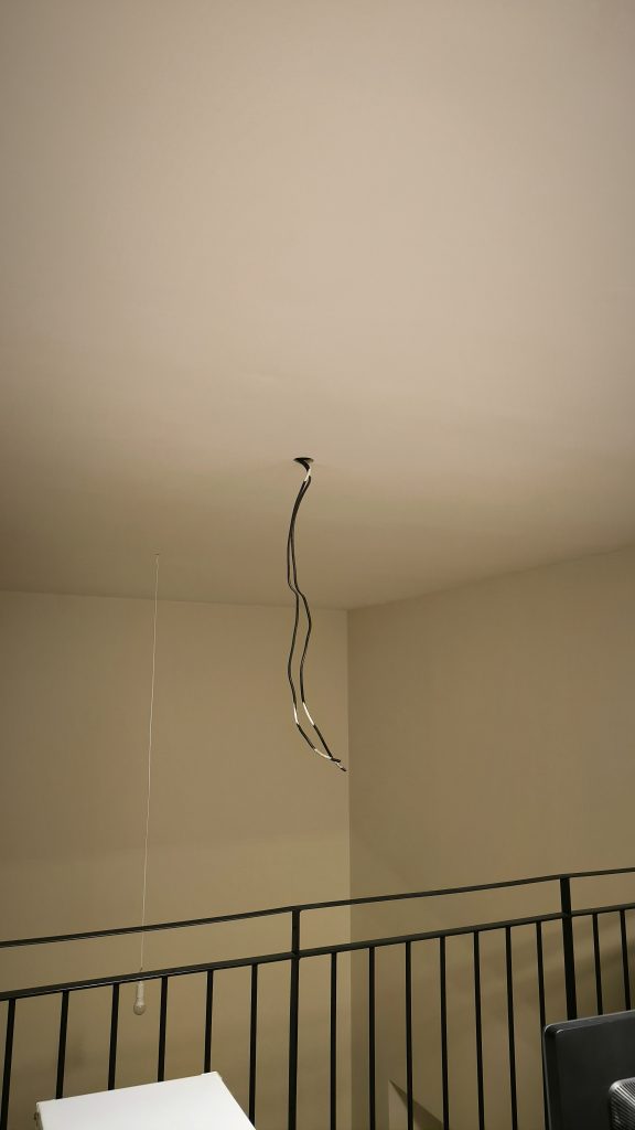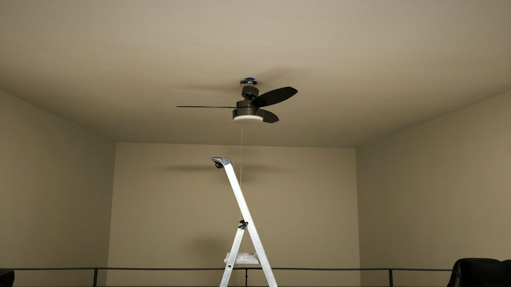 Dès le début j’avais prévu de mettre un ventilateur de plafond au niveau de la mezzanine à l’aplomb de la balustrade. Tout le monde nous a dit « Attention vous allez crever de chaud la haut et il fera froid en bas ». Ok donc pour brasser l’air il faut… un brasseur d’air donc autant prévoir une prise au plafond.