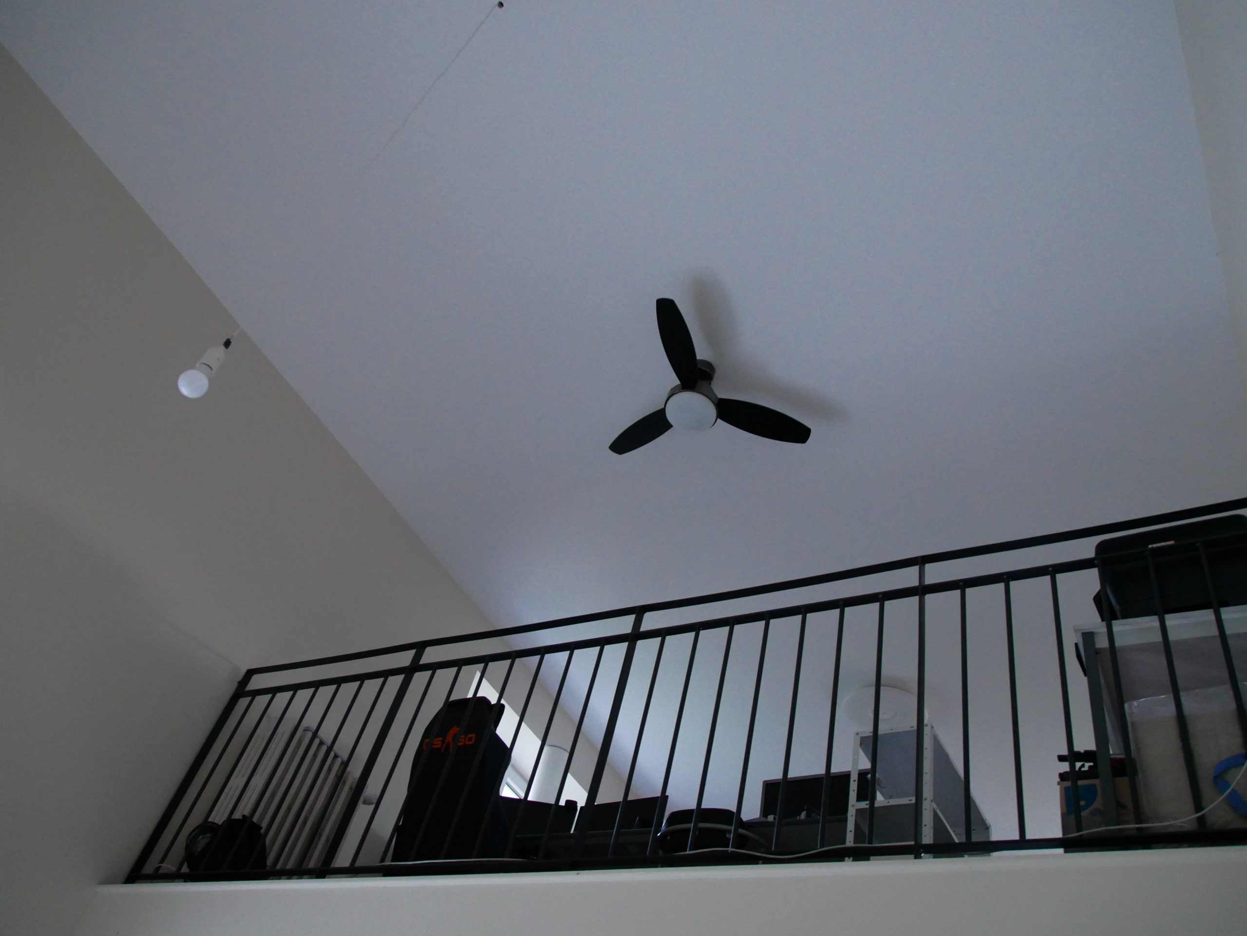Dès le début j’avais prévu de mettre un ventilateur de plafond au niveau de la mezzanine à l’aplomb de la balustrade. Tout le monde nous a dit « Attention vous allez crever de chaud la haut et il fera froid en bas ». Ok donc pour brasser l’air il faut… un brasseur d’air donc autant prévoir une prise au plafond.