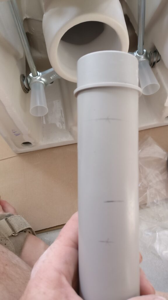 La technique est simple. Mettre le tuyau à recouper dans le wc et avec une règle faire un trait sur ce dernier au ras du wc. retourner le tuyau et faire de même côté bâti. Il y a maintenant 2 traits sur le tube. Il faut recouper le tube de la longueur entre ces deux traits + 3mm.