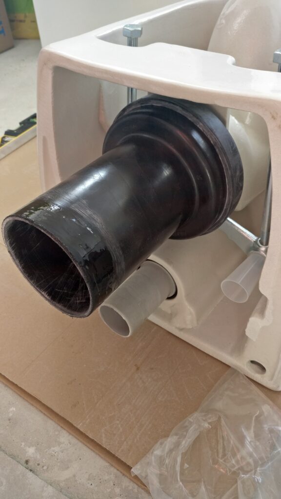 La technique utilisée ici est très classique. Précédemment j’ai recouvert le bâti de carrelage et maintenant il me faut y fixer le wc. Le seul point à voir est en gros comment couper les tuyaux pour la chasse et l’évacuation.