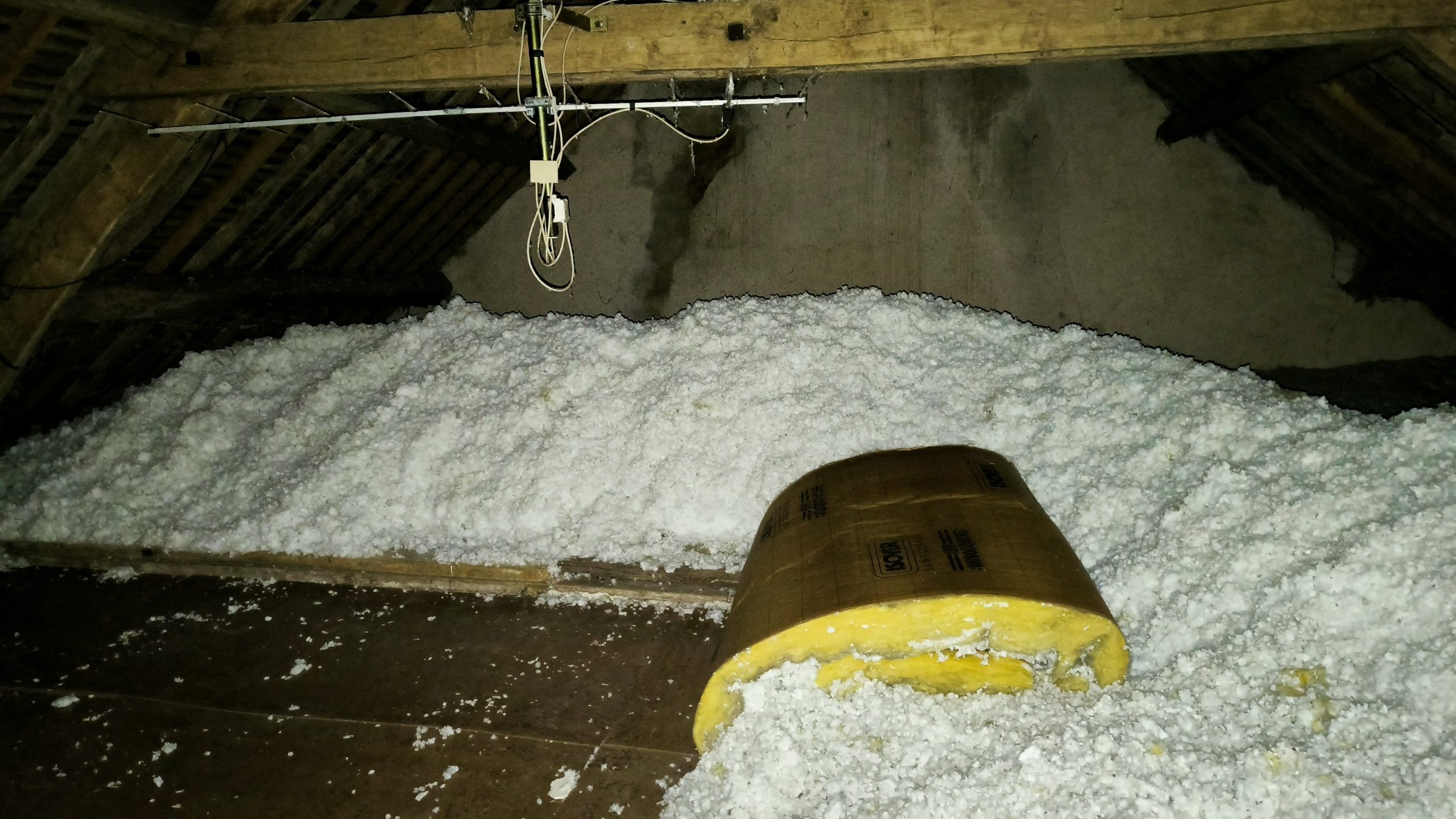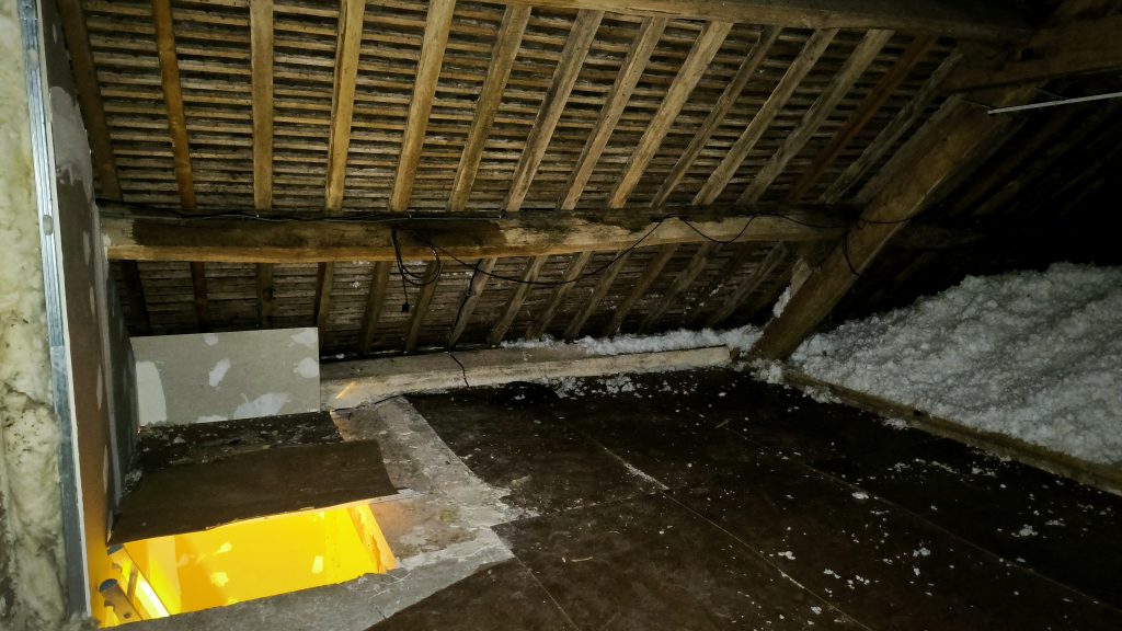 Cette semaine un artisan passe pour faire un sas dans le grenier au dessus du futur escalier. Ce dimanche j’ai donc fait place net en retirant toute la laine de verre projetée ainsi que les rouleaux de laines étalés sur le sol. J’ai aussi retiré l’ancien vase d’expansion du chauffage.