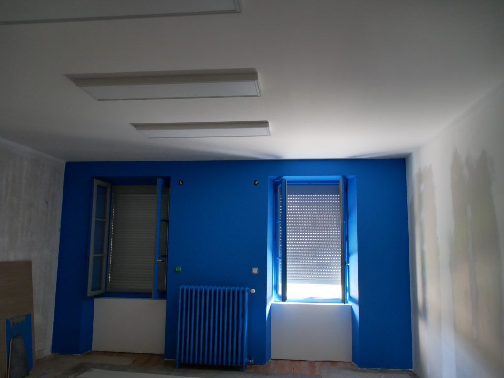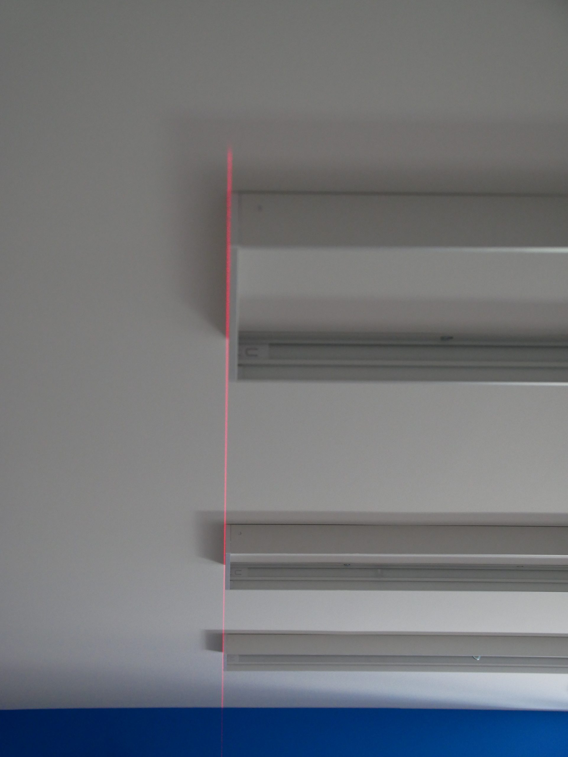 Réinstallation lumière bureau 4 novembre 2023 / Construction / Bureau commun Le peintre a fini il y a quelques jours de faire la peinture du mur du fond du bureau mais aussi du plafond. Je peux remettre les luminaires : 3 grandes dalles lumineuses à aligner au laser et à répartir dans la pièce. Au laser