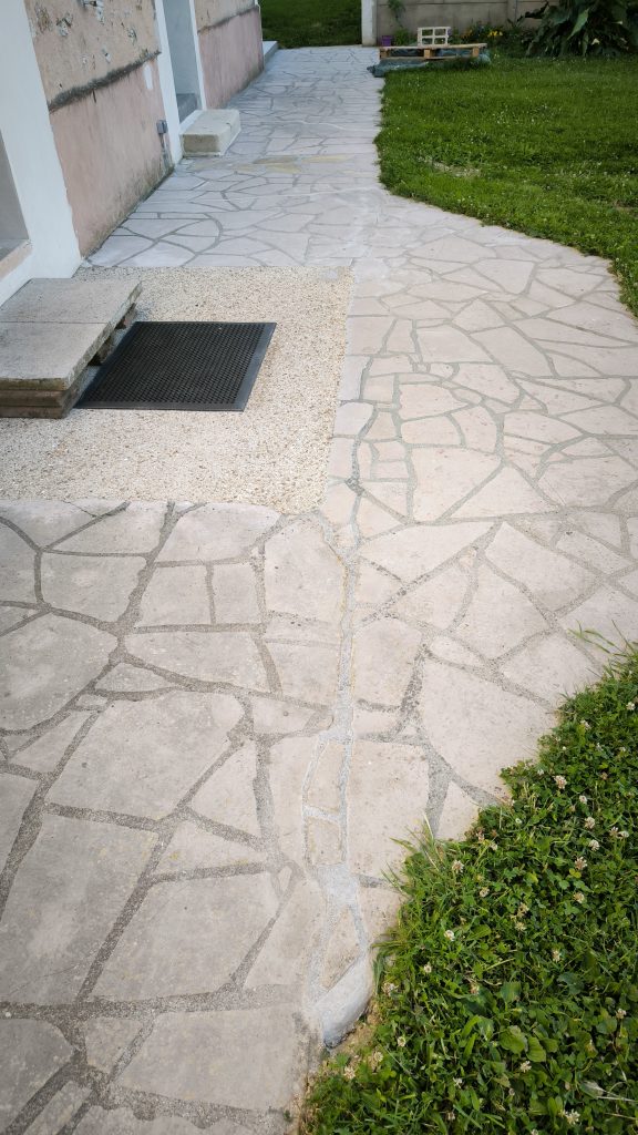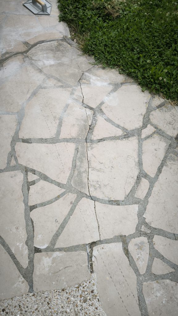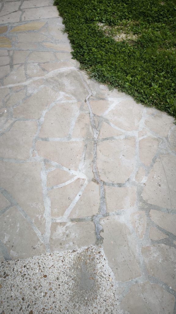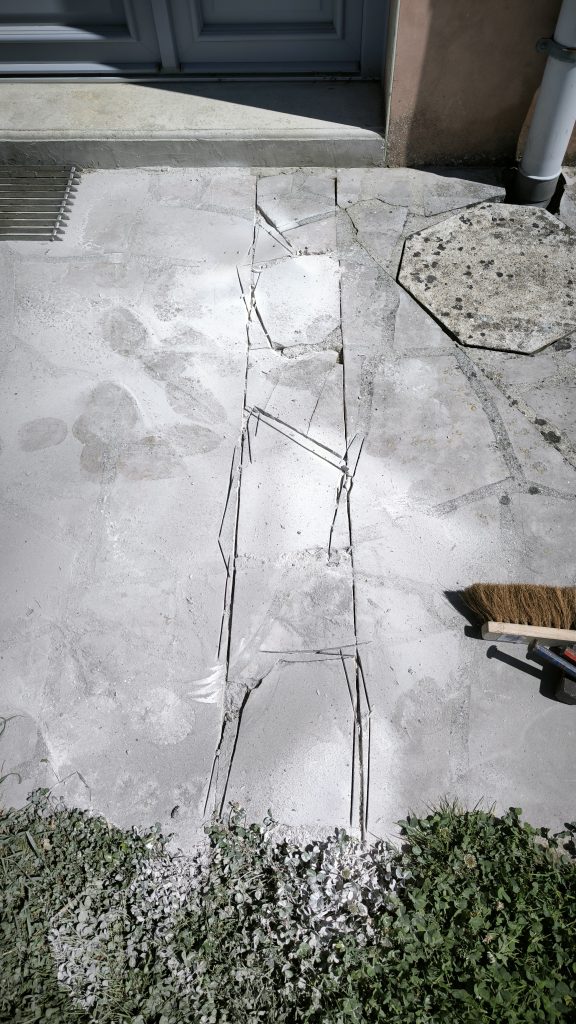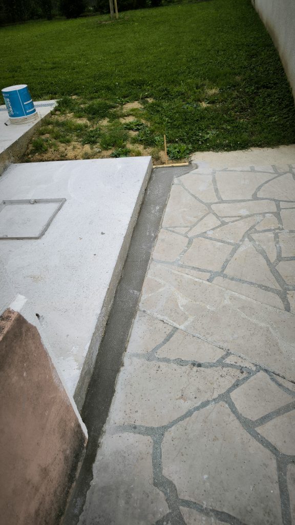 Comme je le disais dans le précédent article j’avais un peu de ciment à faire entre le comblanchien et la marche… alors pourquoi ne pas en profiter pour réparer les fissures ? il y en a pas mal…