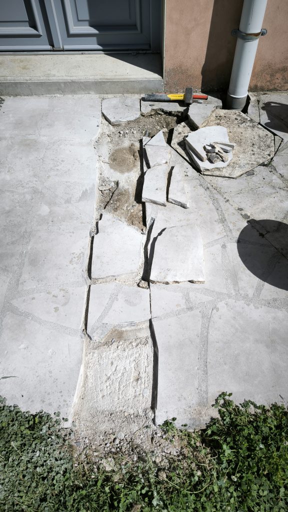J’ai commencé par les ouvrir au début au marteau… pour finir à la meuleuse : nettement plus rapide. j’ai pu aussi changer un peu la forme des fissures pour éviter d’avoir un gros joint tout droit. et au passage une mauvaise surprise sur la réalisation du maçon il y a 1 ou 2 ans… aucune pierre ne tenait tout est parti quand j’ai commencé à disquer. Il faut dire que j’ai bien trouvé le sable mais pas beaucoup de ciment…