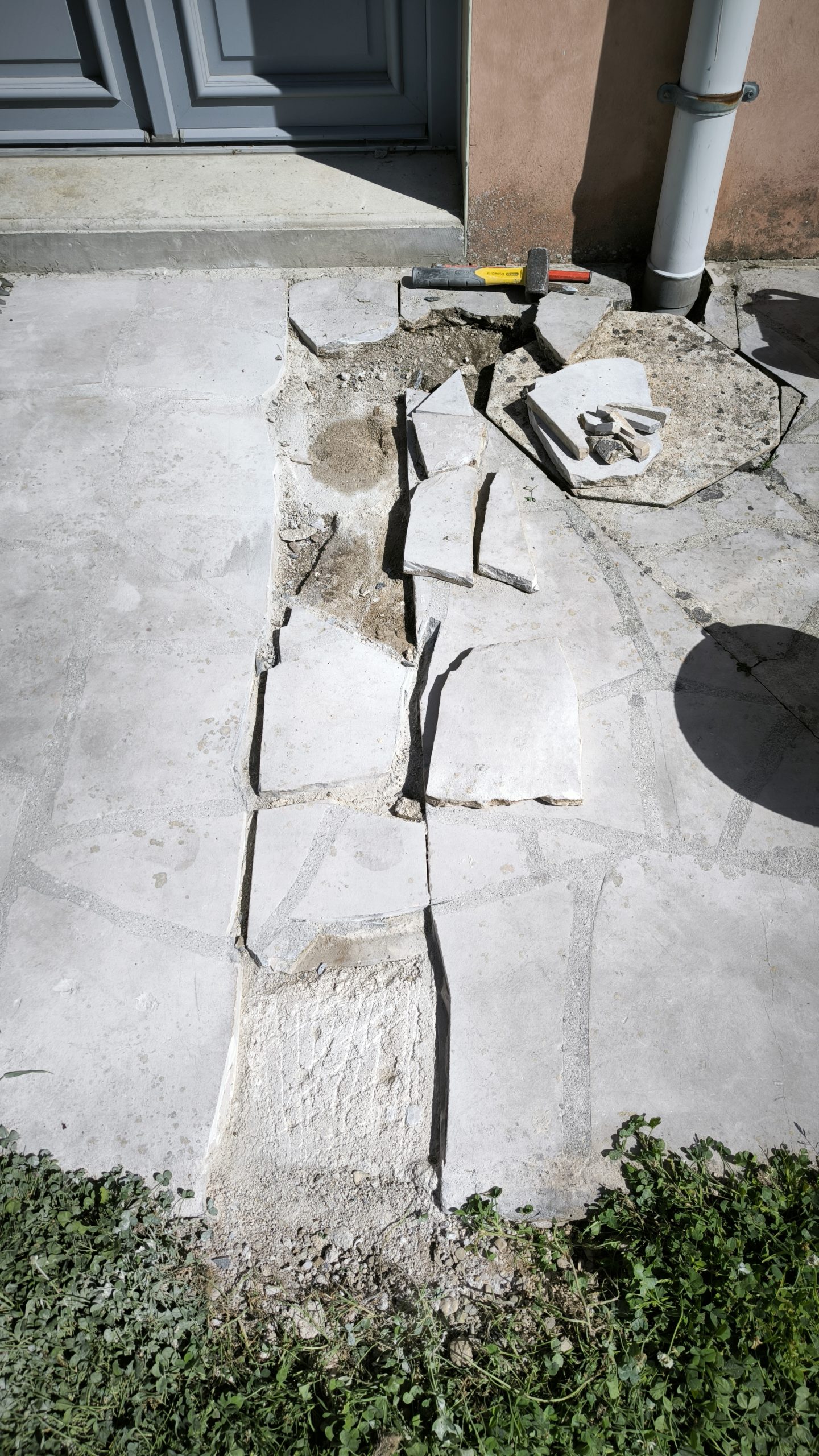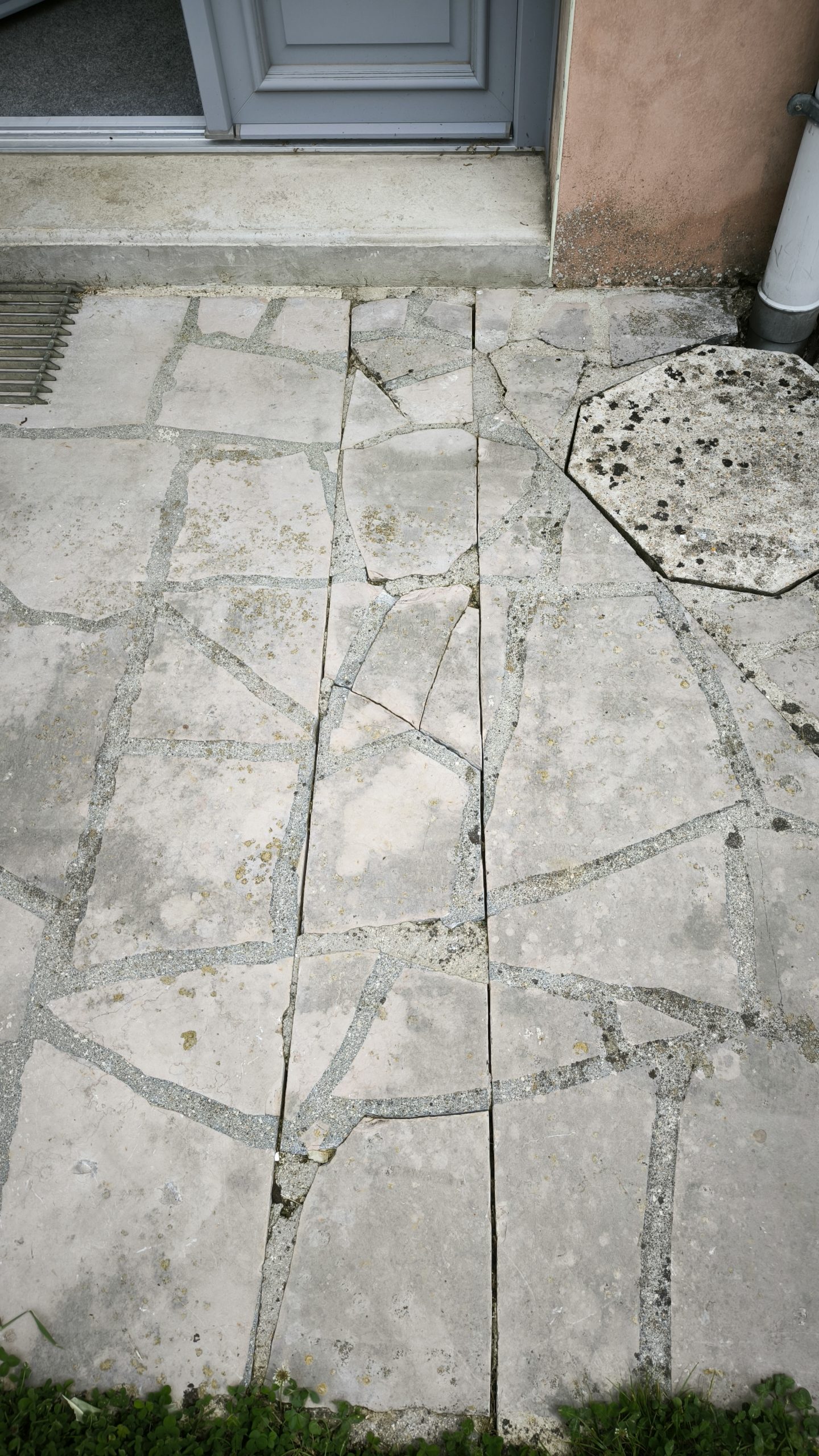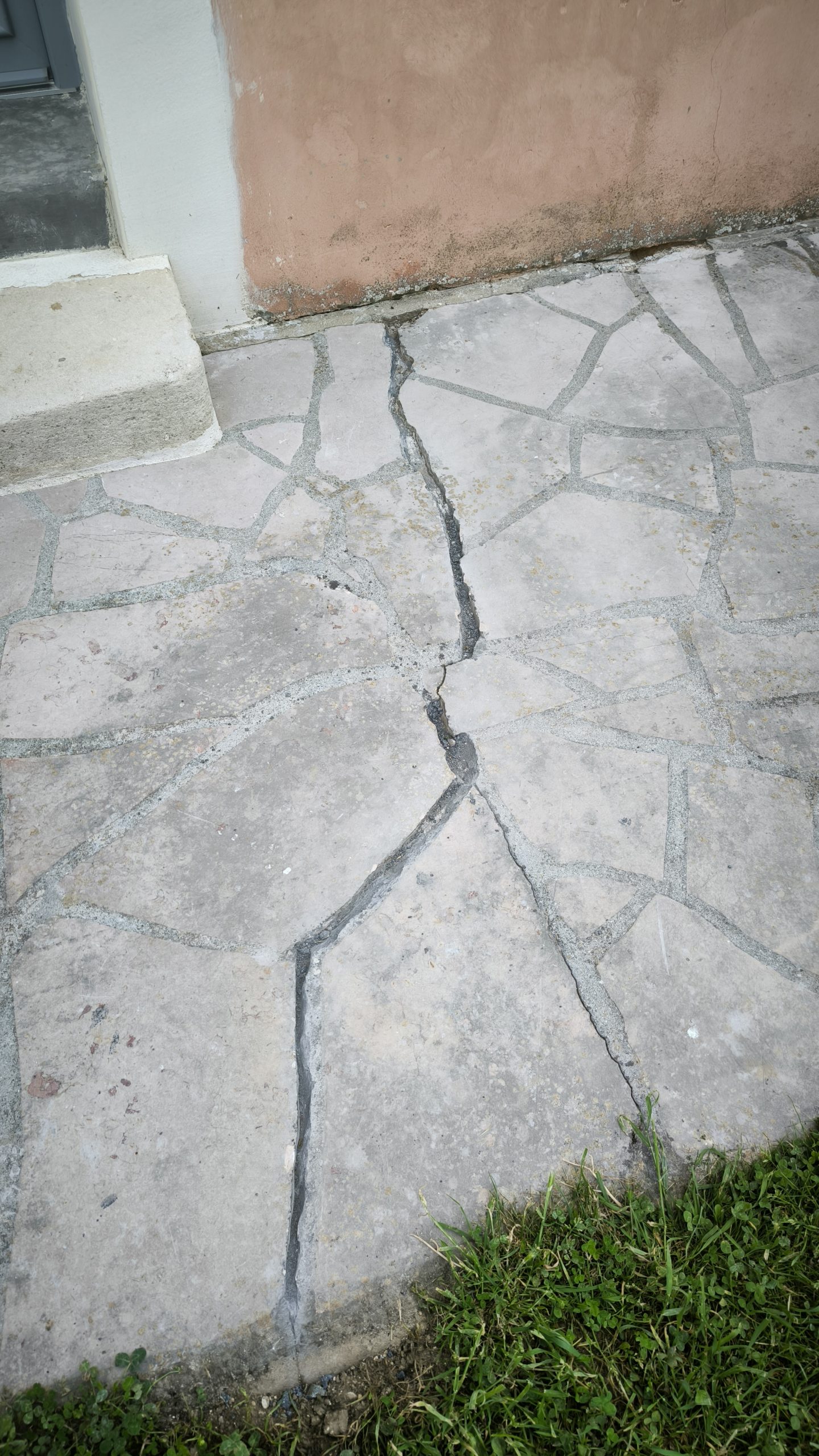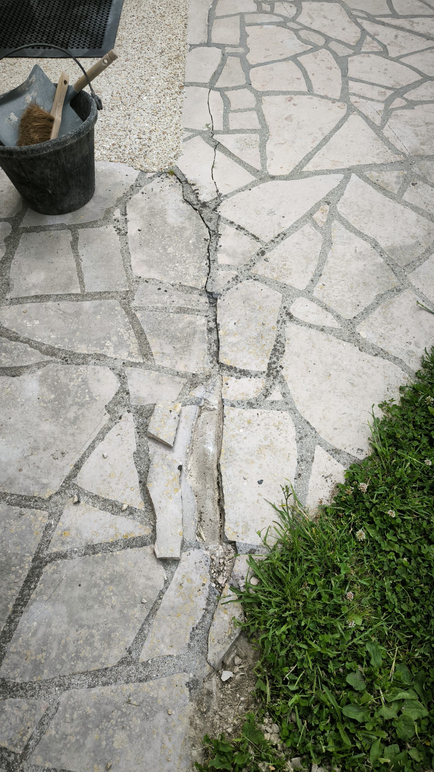 Comme je le disais dans le précédent article j’avais un peu de ciment à faire entre le comblanchien et la marche… alors pourquoi ne pas en profiter pour réparer les fissures ? il y en a pas mal…