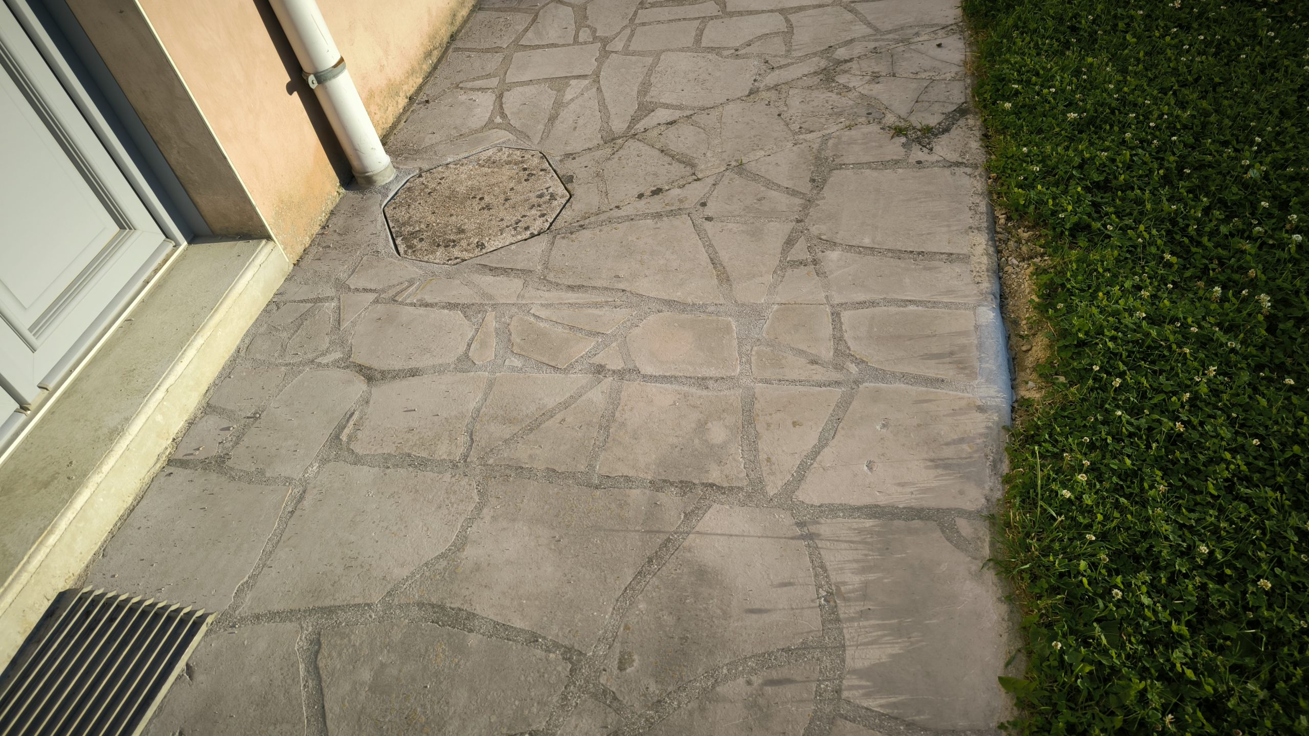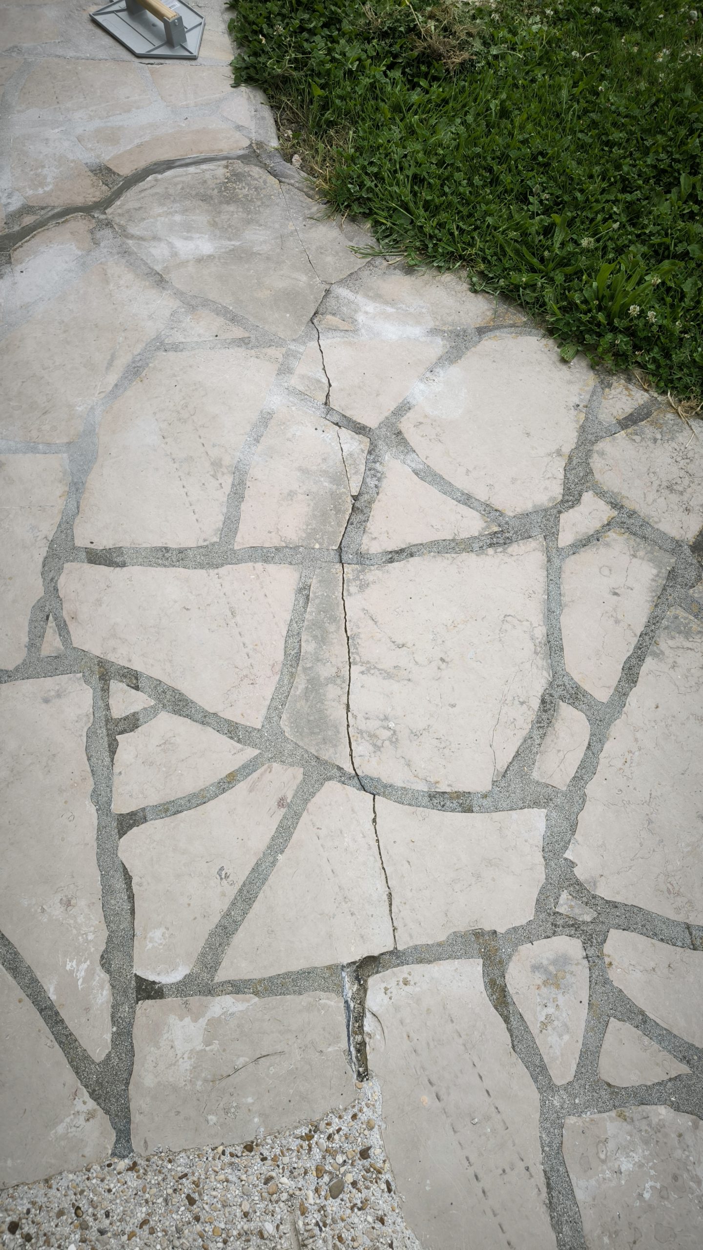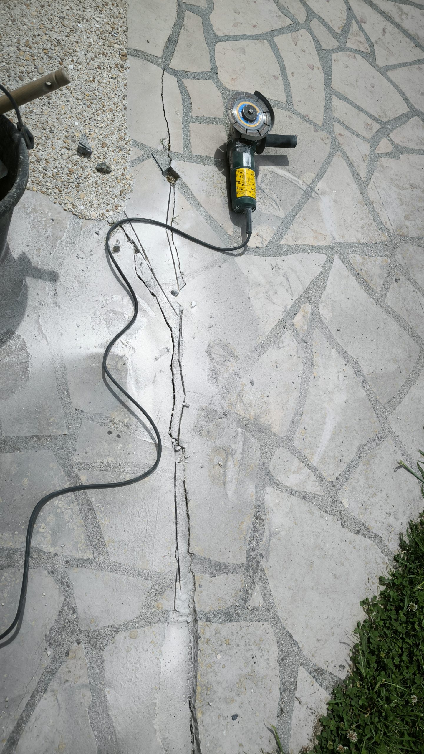 J’ai commencé par les ouvrir au début au marteau… pour finir à la meuleuse : nettement plus rapide. j’ai pu aussi changer un peu la forme des fissures pour éviter d’avoir un gros joint tout droit. et au passage une mauvaise surprise sur la réalisation du maçon il y a 1 ou 2 ans… aucune pierre ne tenait tout est parti quand j’ai commencé à disquer. Il faut dire que j’ai bien trouvé le sable mais pas beaucoup de ciment…