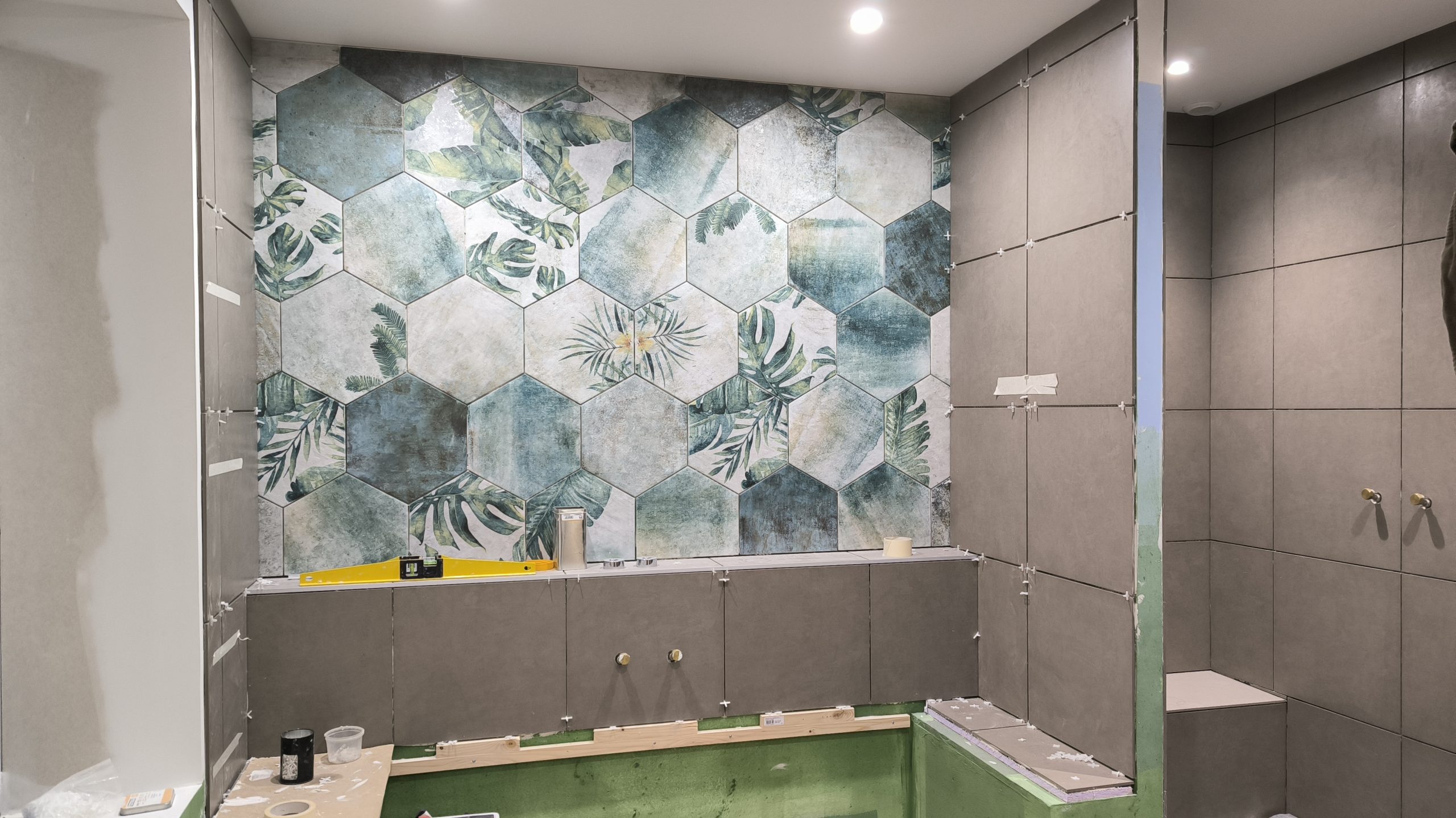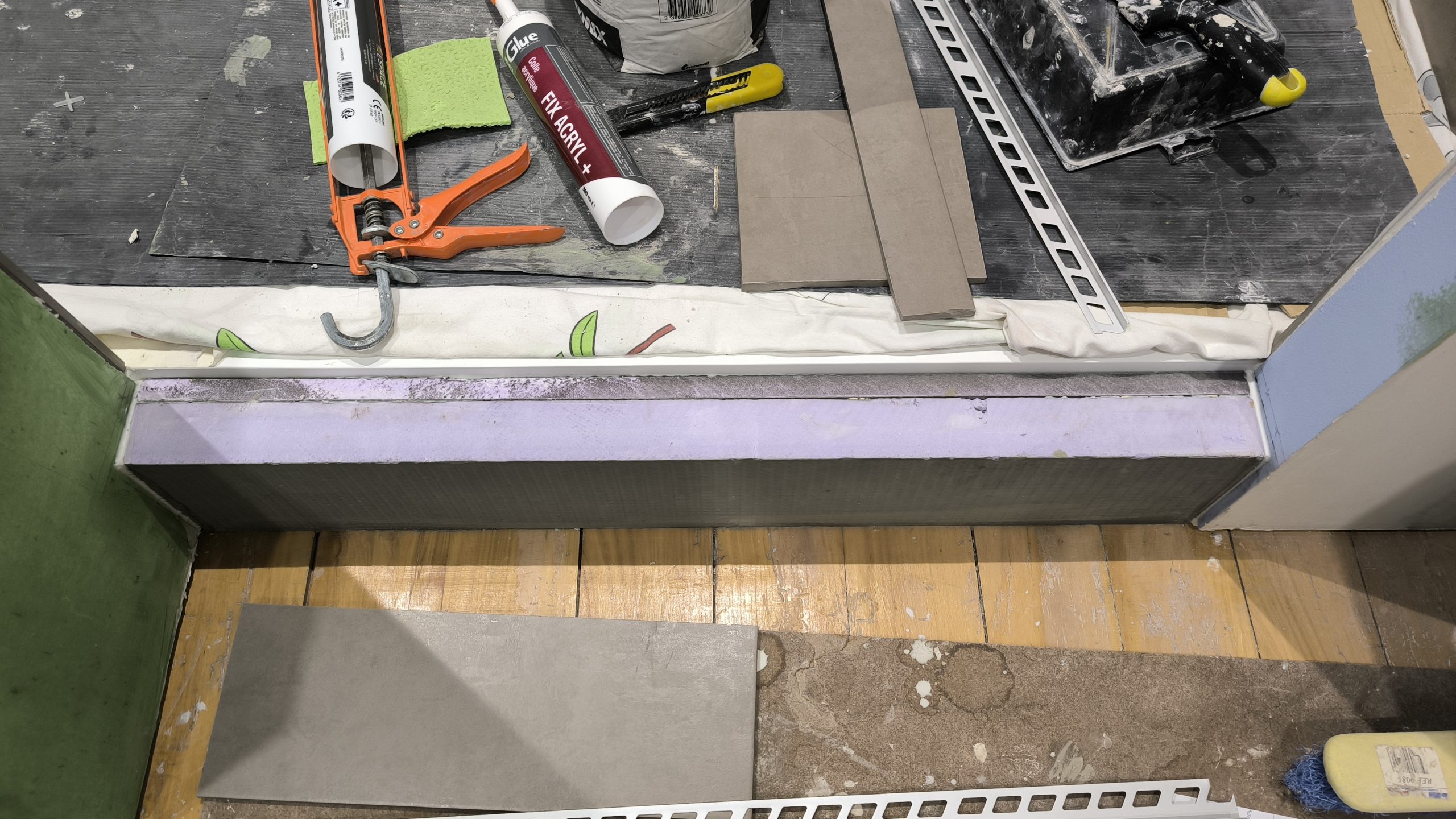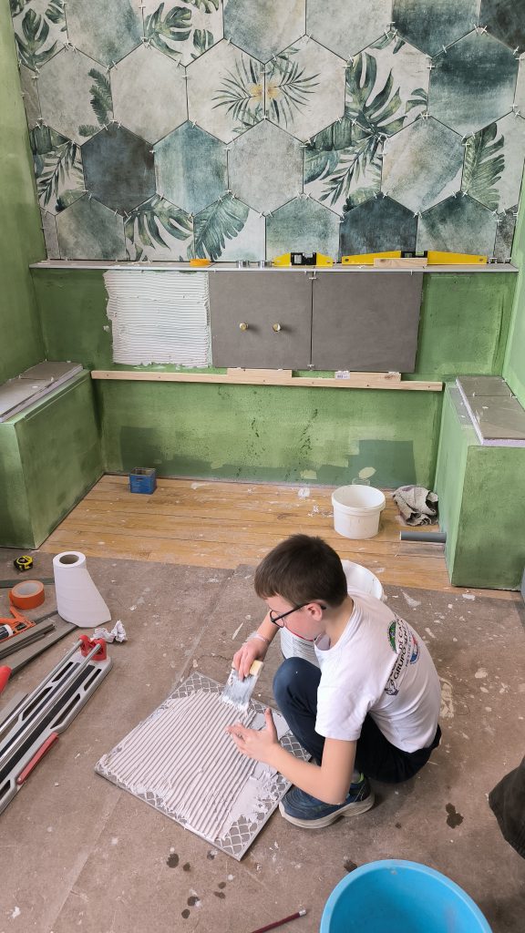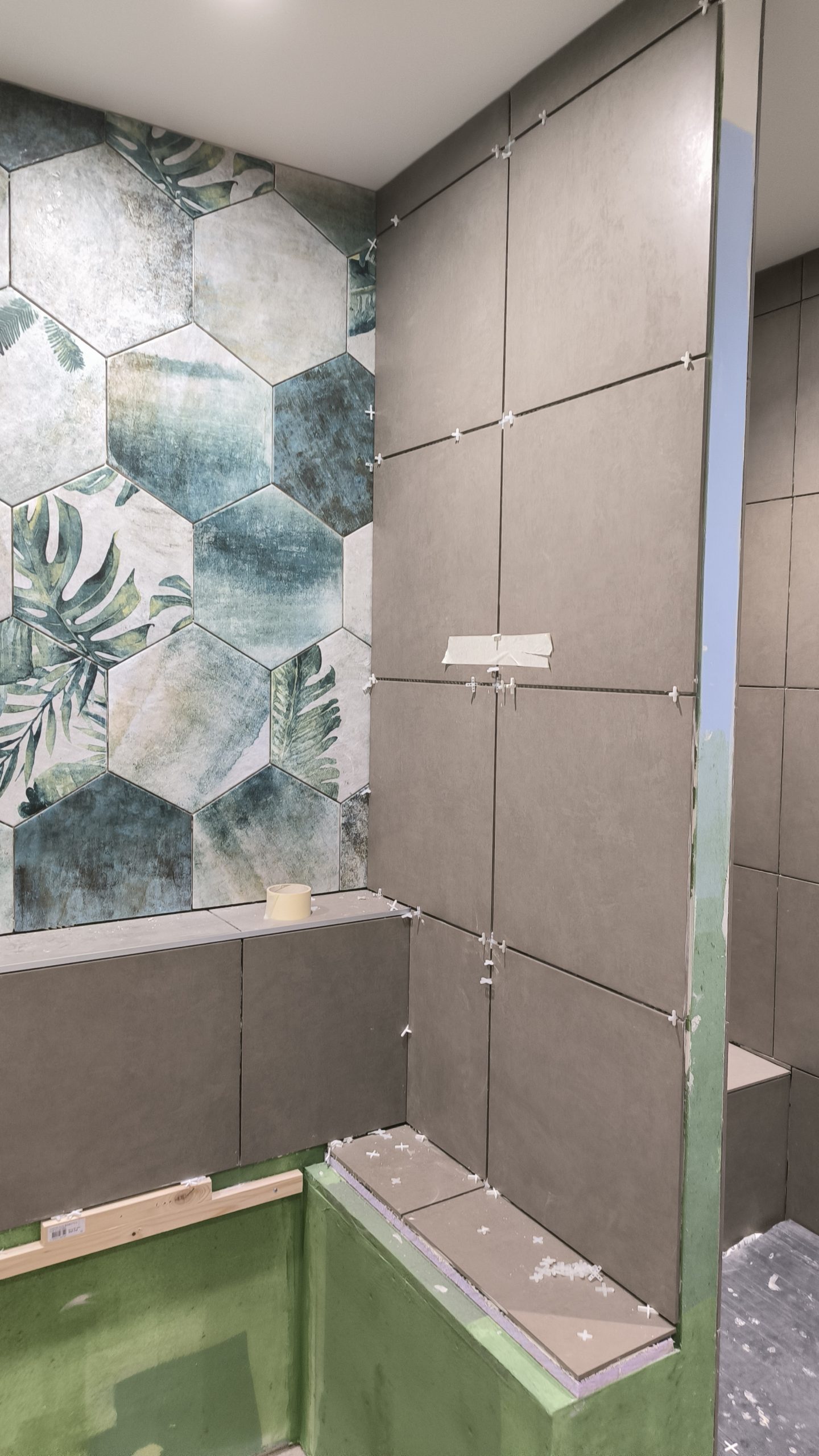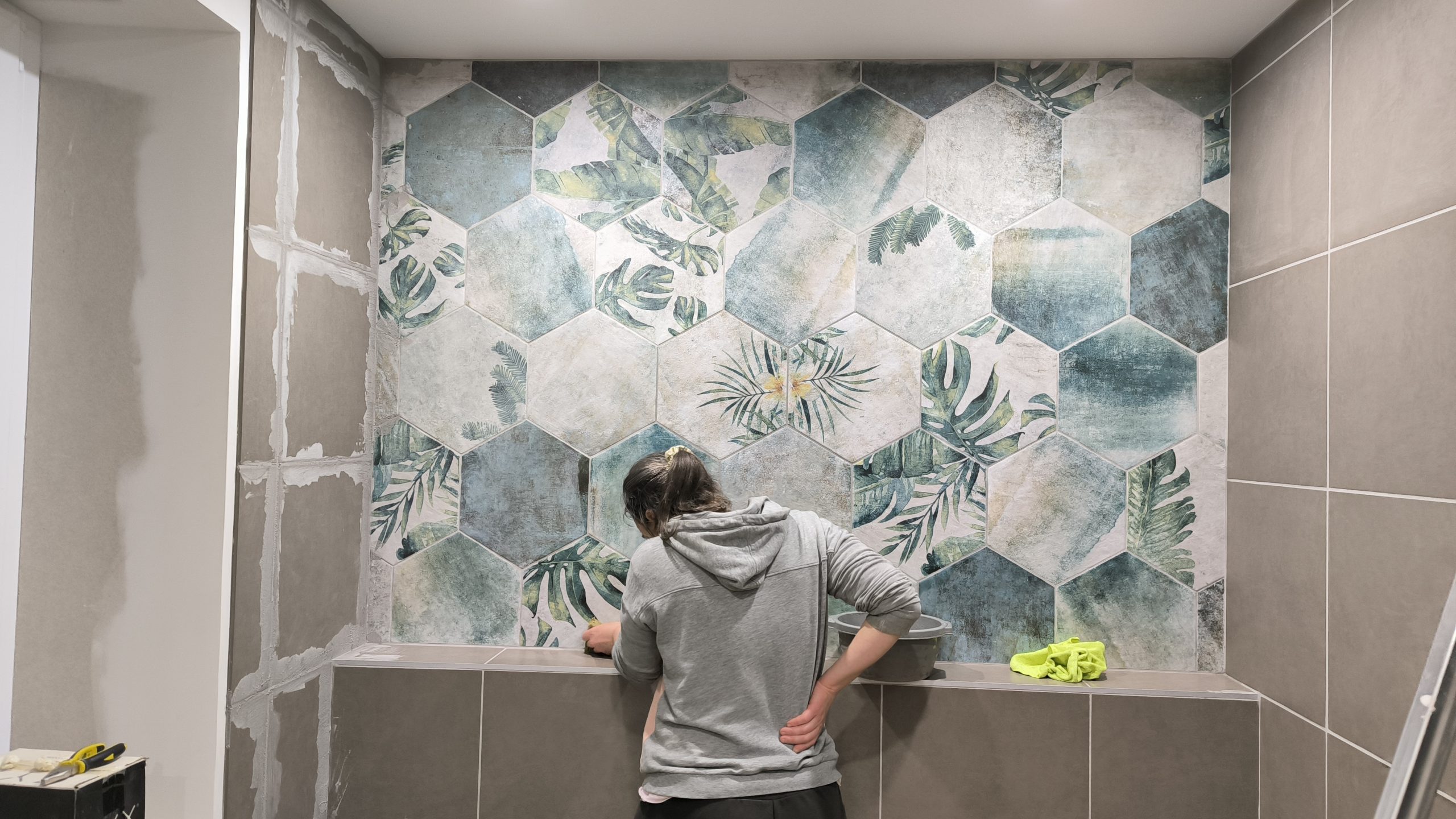 Sans faiblir, pose du carrelage sur la marche pour entrer dans la douche :