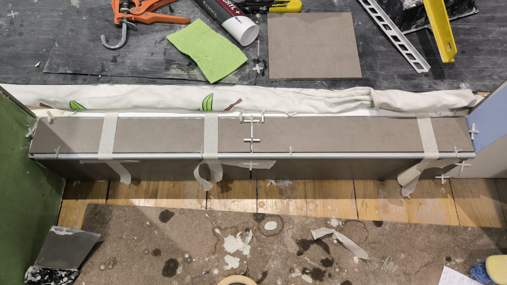 J’ai posé la baignoire et tracé au mur son emplacement. Je peux maintenant mettre le carrelage en respectant un espace tout autour pour le futur joint. J’en profite aussi pour prendre les mesures pour les découpes du robinet :