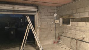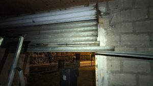 – Démontage du rideau métallique (super lourd à ouvrir, on va le changer).