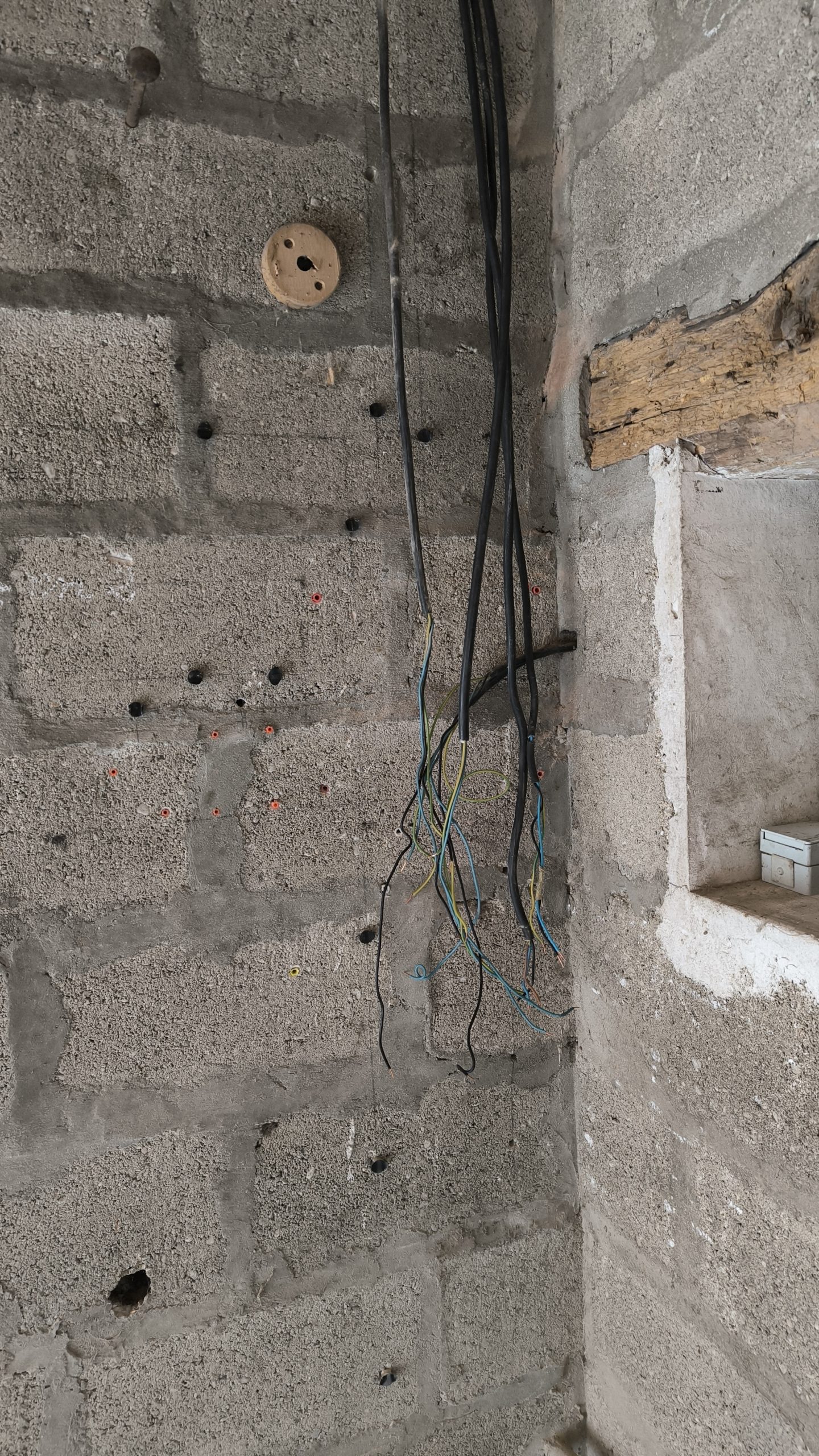 – L’arrivée électrique et le tableau de disjoncteur à l’entrée (comme actuellement mais déplacé sur le mur à côté)