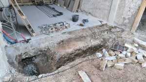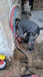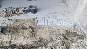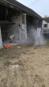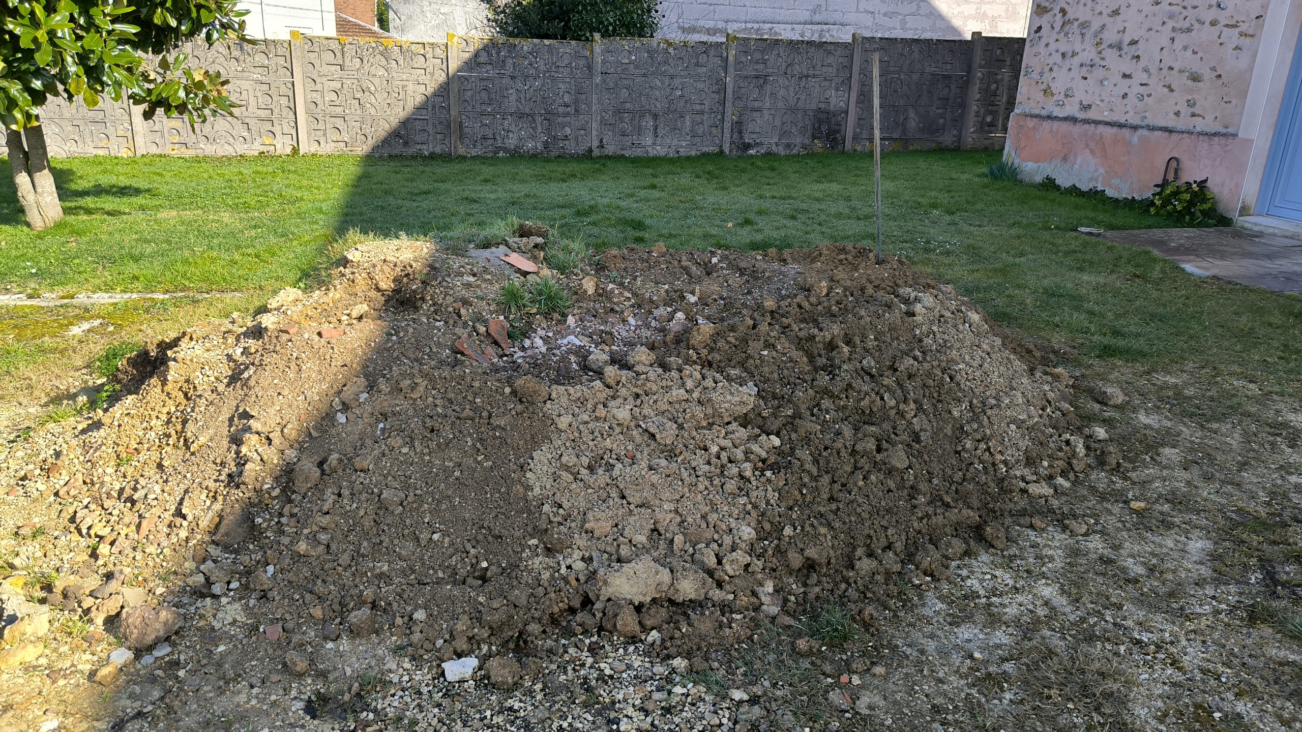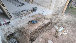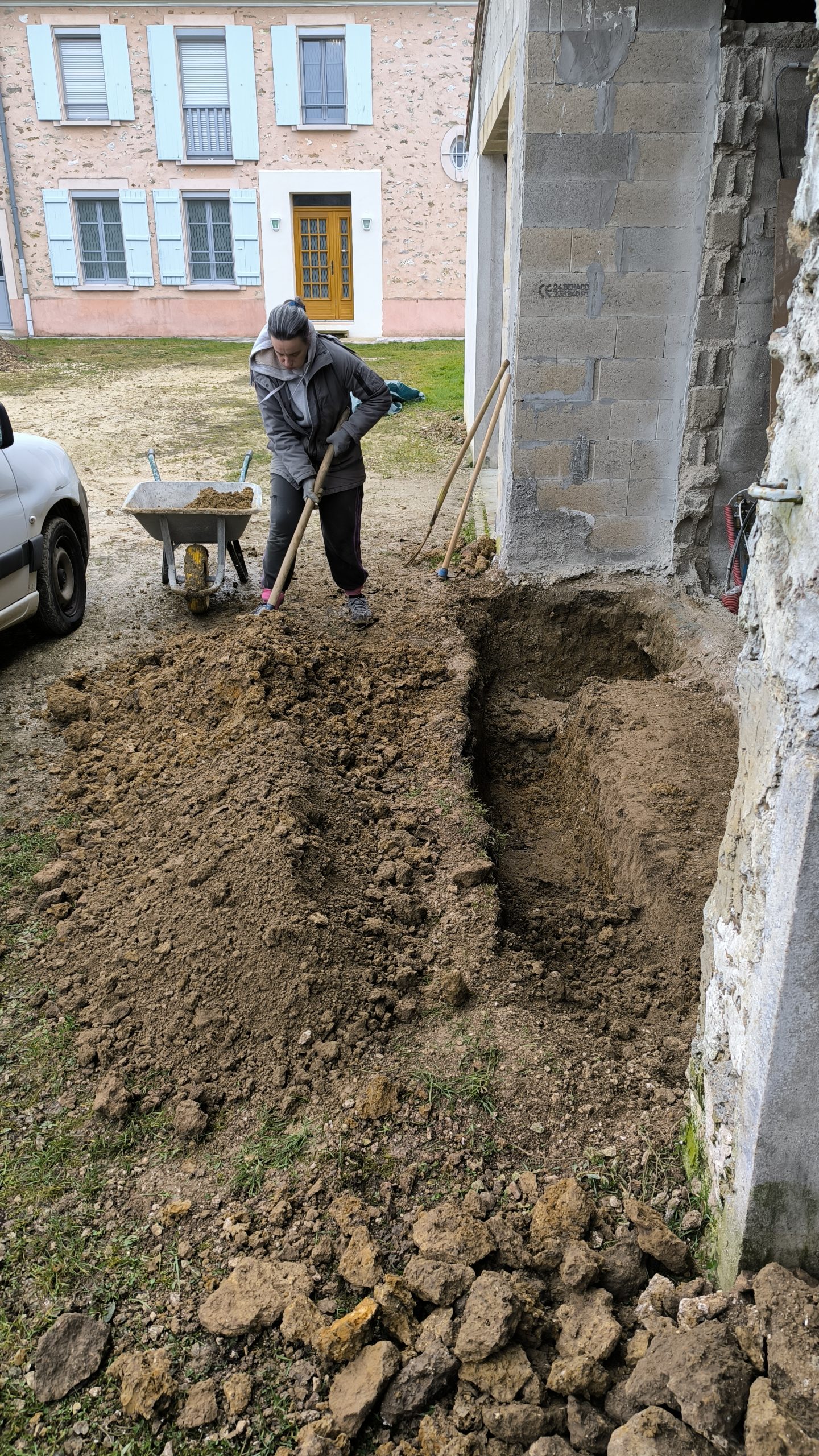 Je m’attaque à creuser les fondations du futur mur : le maçon m’a dit 40cm de large et 60cm de profondeur. On se met à deux le soir et le week-end pour le faire (un qui creuse l’autre qui met sur le tas de terre qui existe déjà dans la cours). Je supprime aussi l’ancien seuil de porte incliné qui se retrouverait au milieu du garage et plus à l’entrée.