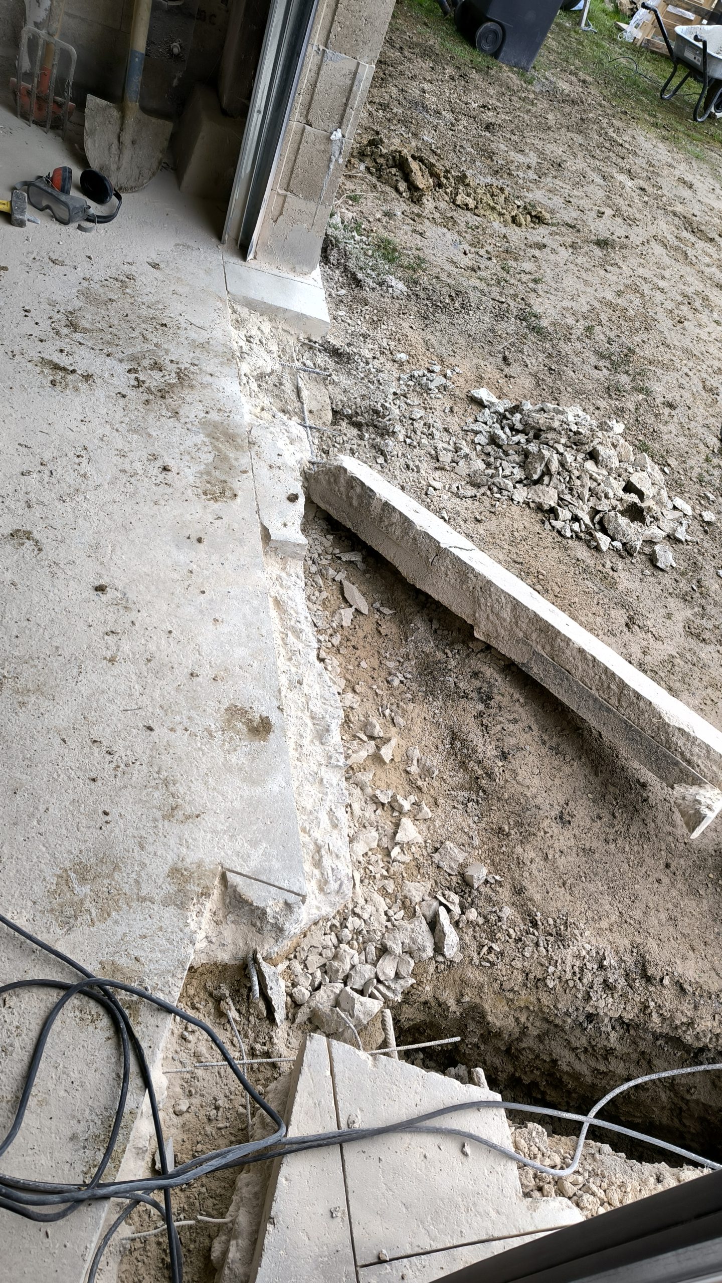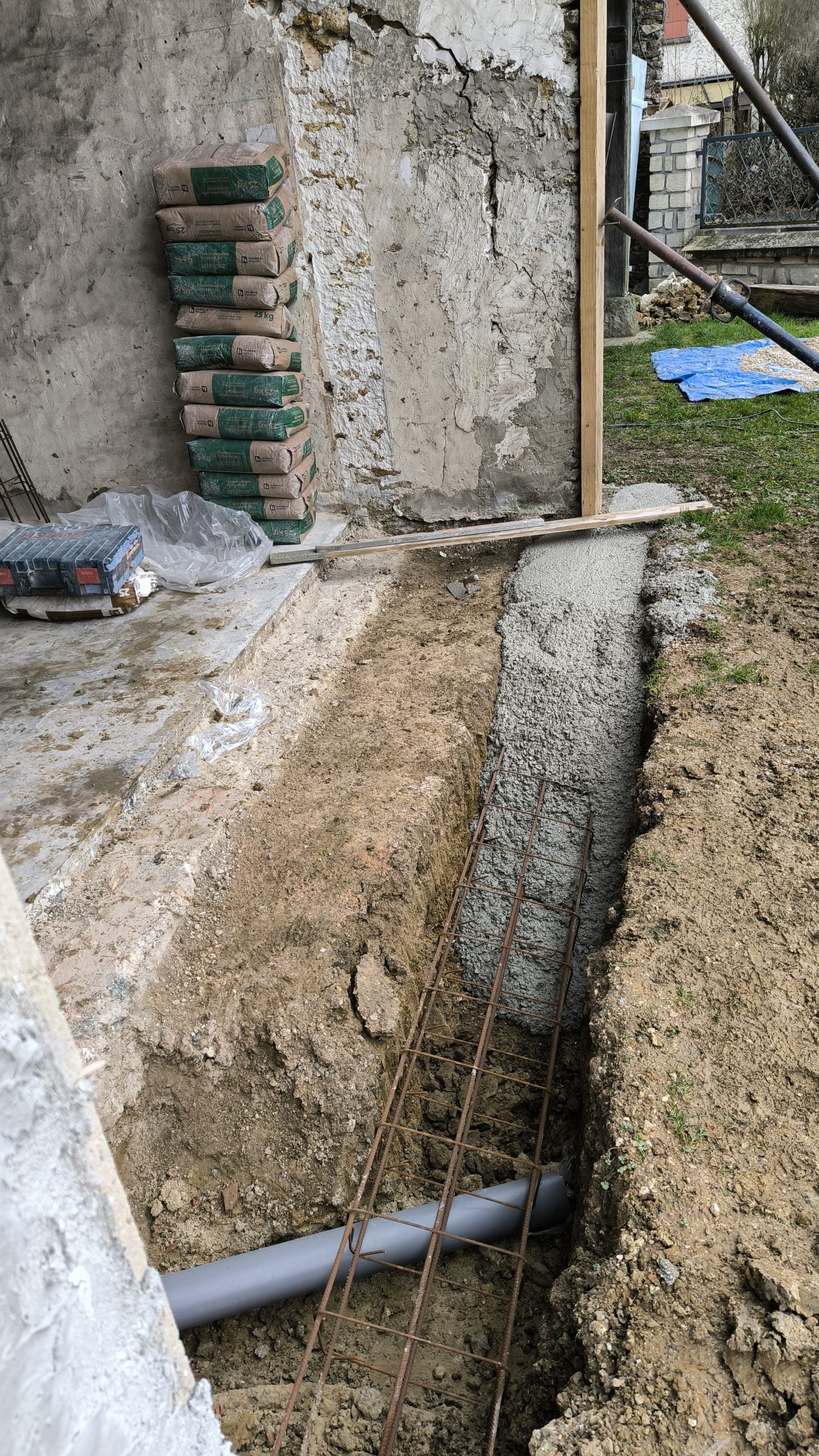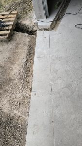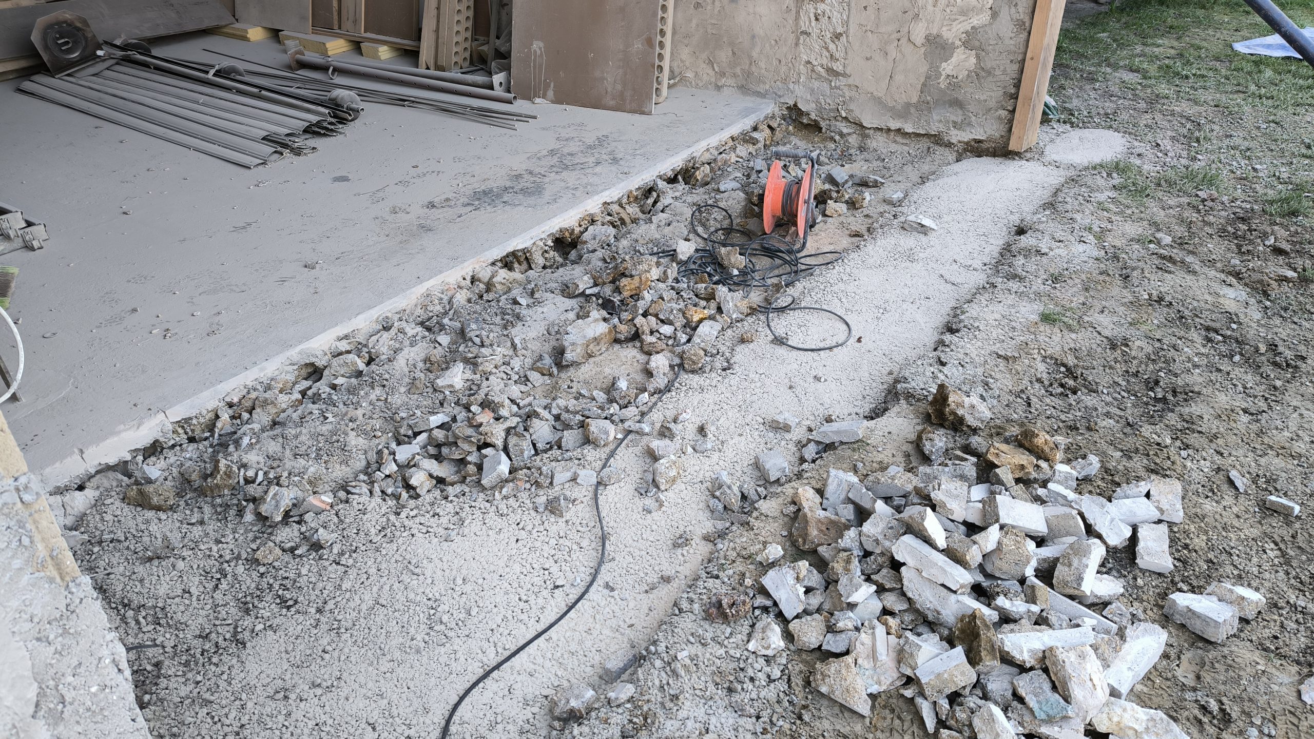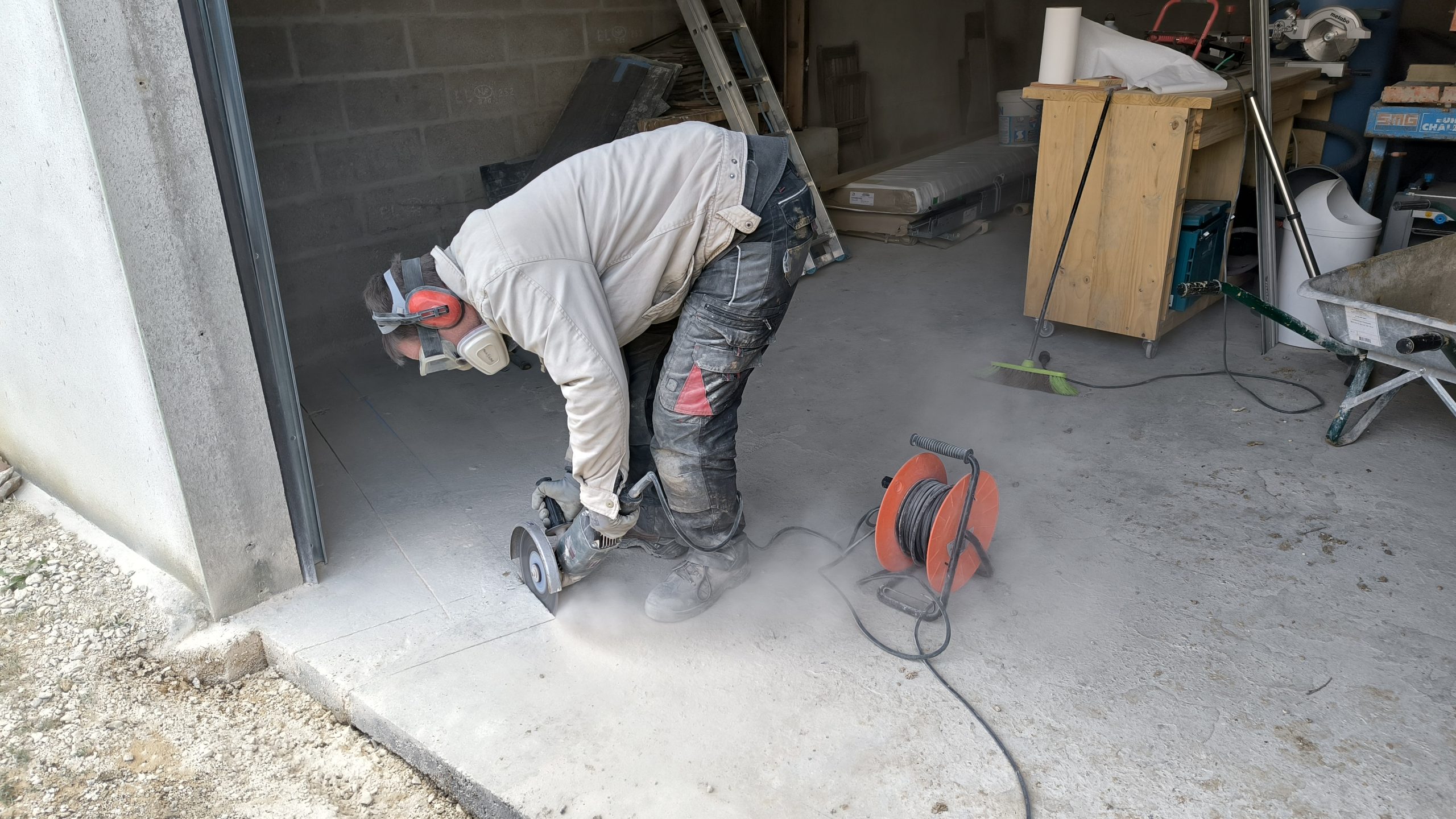 Le maçon est arrivé entre temps et a coulé la fondation dans le trou que j’avais préparé en février. Par contre il en a.profité pour me dire que je n’avais pas assez découpé la dalle du second garage… je ressors donc la disqueuse en attendant que sa fondation sèche :