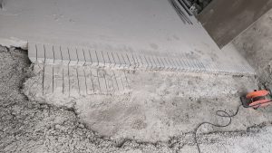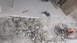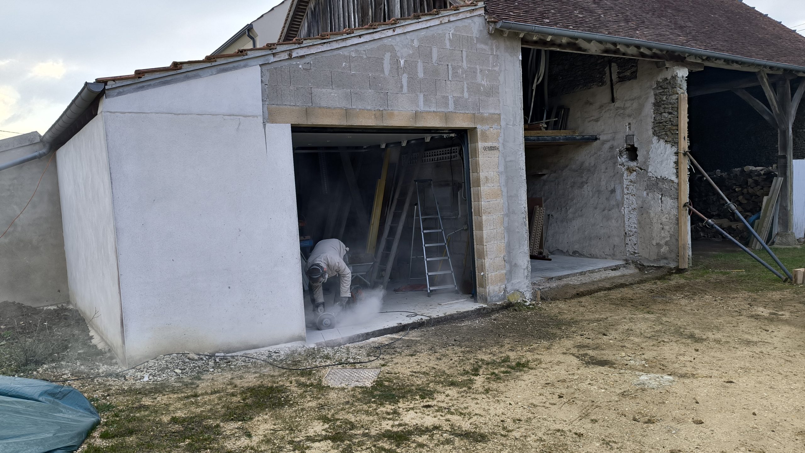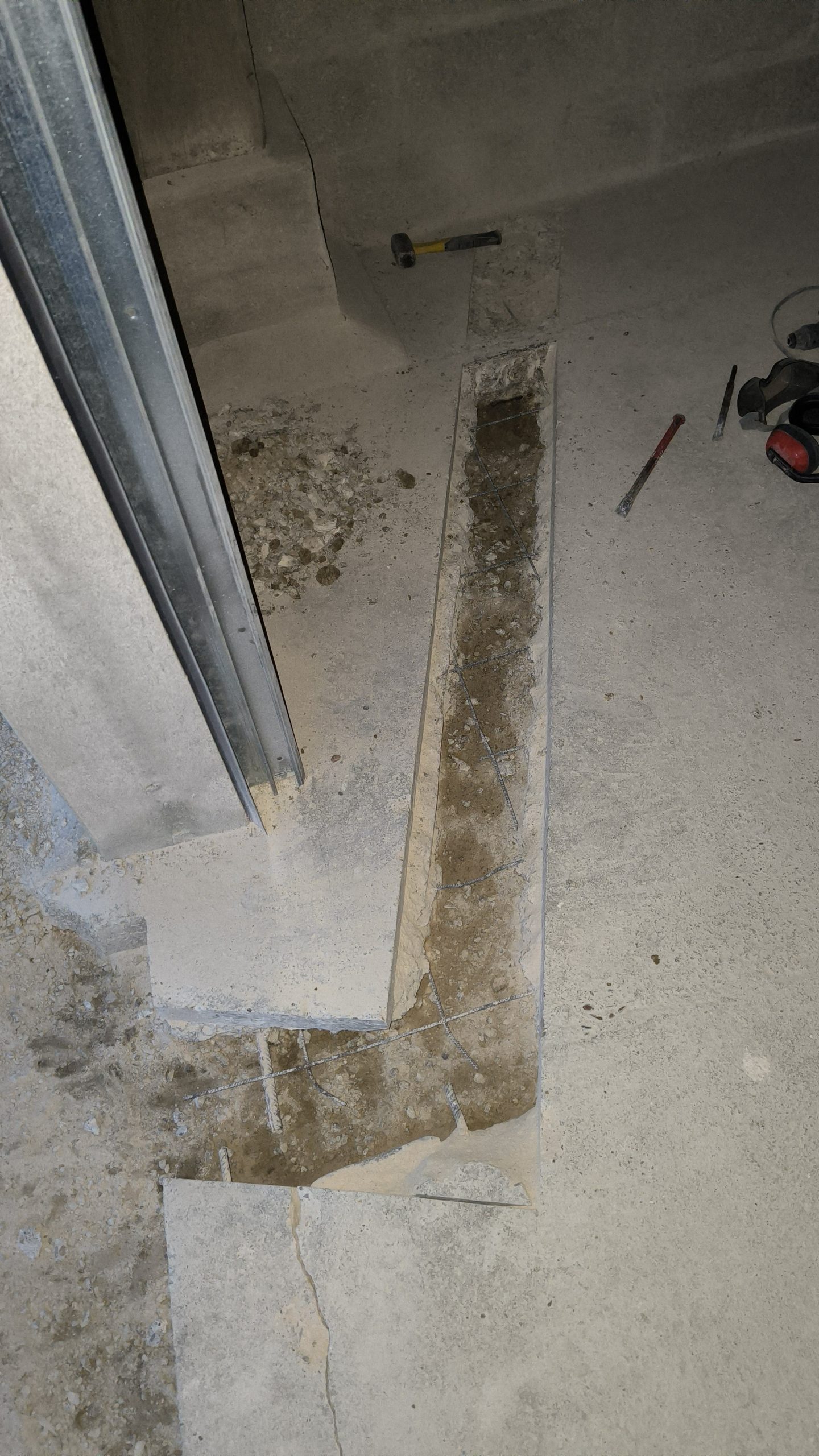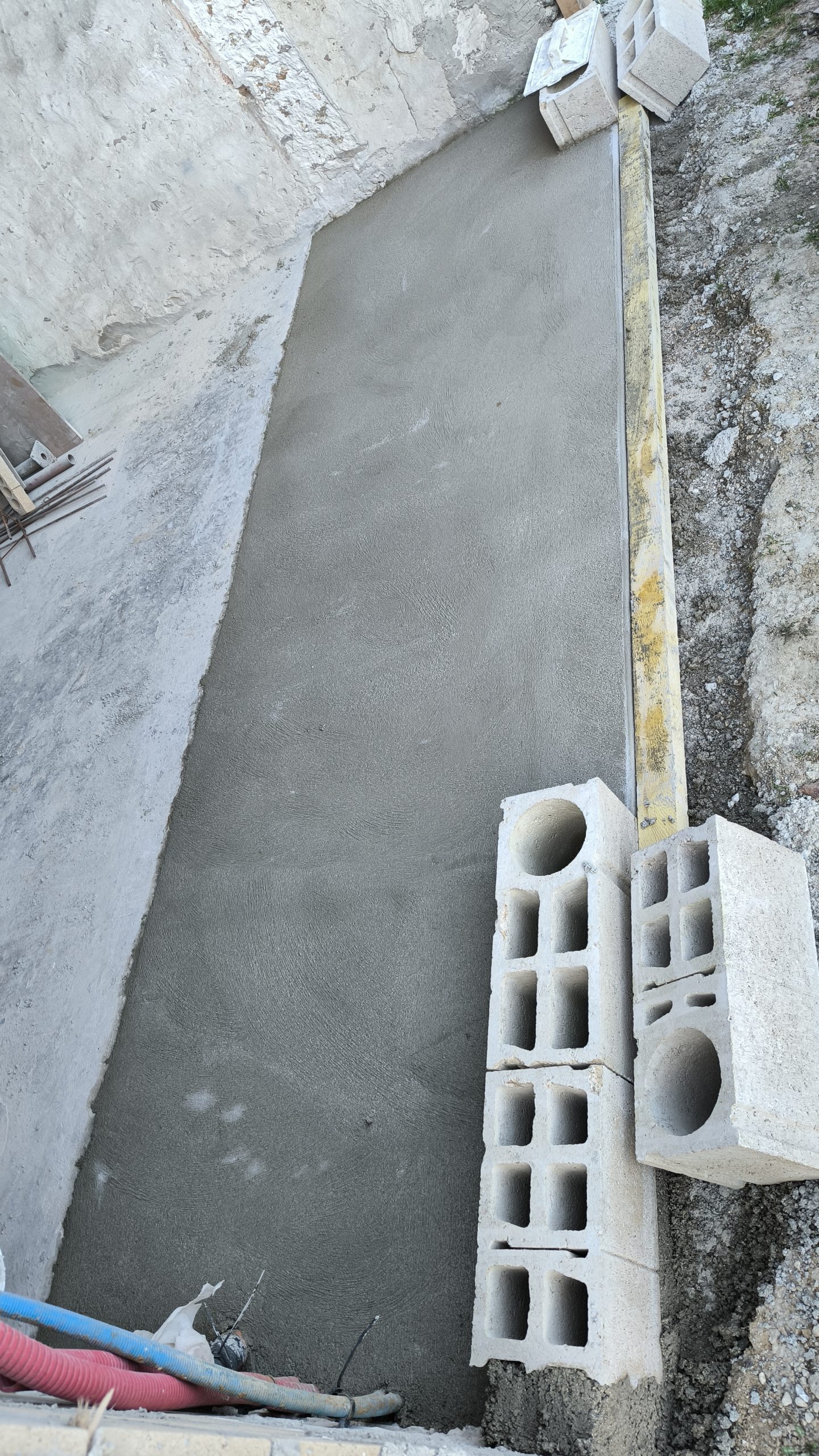 Le maçon est arrivé entre temps et a coulé la fondation dans le trou que j’avais préparé en février. Par contre il en a.profité pour me dire que je n’avais pas assez découpé la dalle du second garage… je ressors donc la disqueuse en attendant que sa fondation sèche :