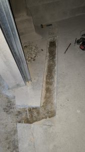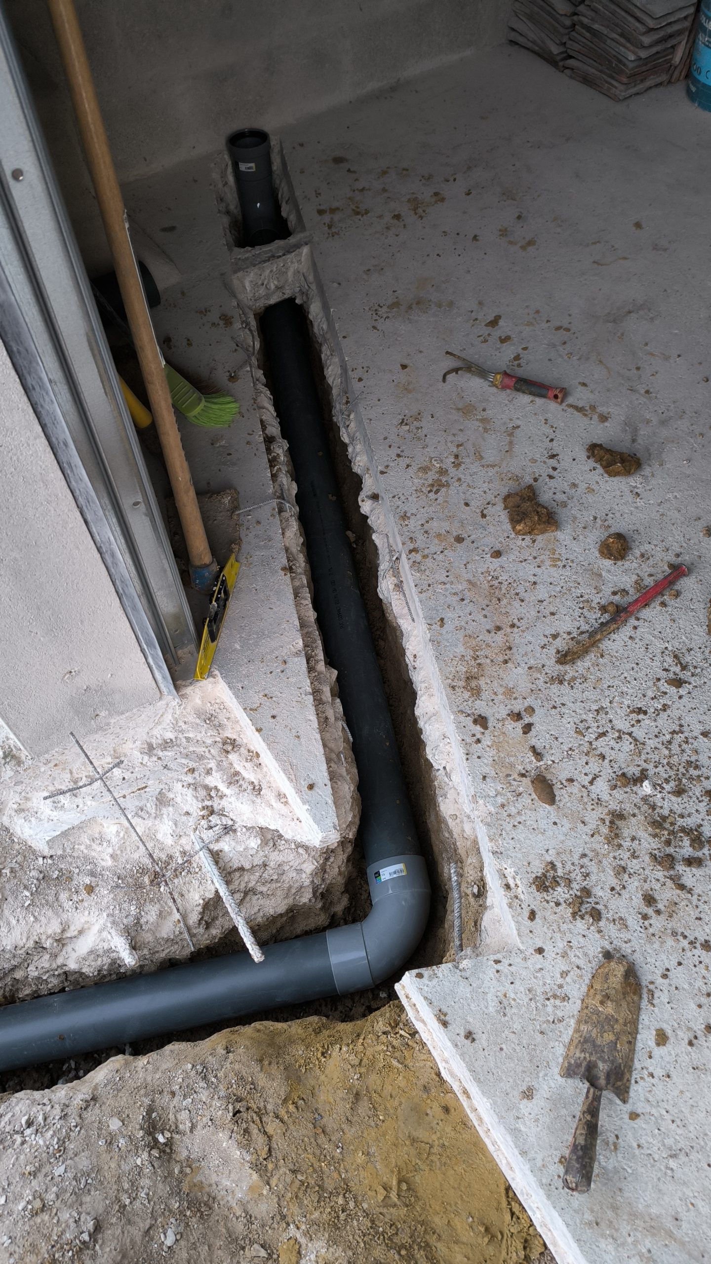 Nous avons décidé de profiter de la réfection des seuils de portes pour passer une évacuation dans le premier garage (celui du haut). Elle servira pour y mettre un évier et pourquoi pas si besoin un WC.