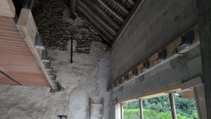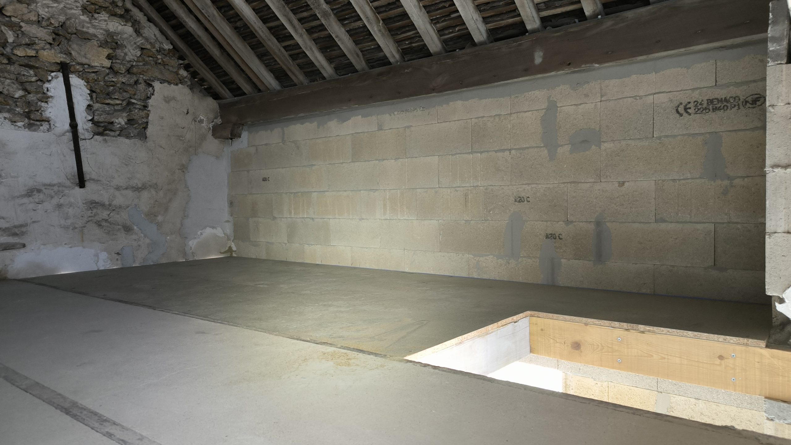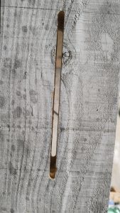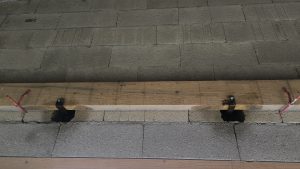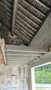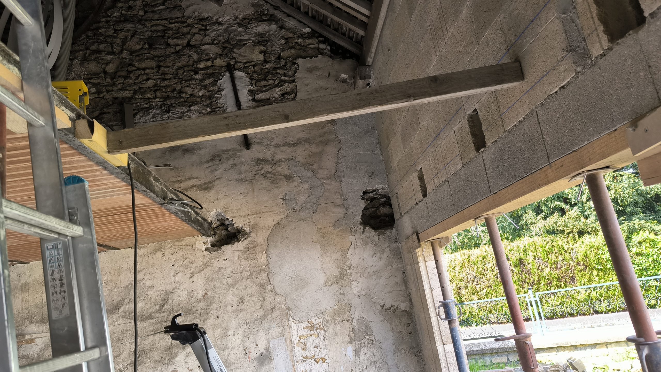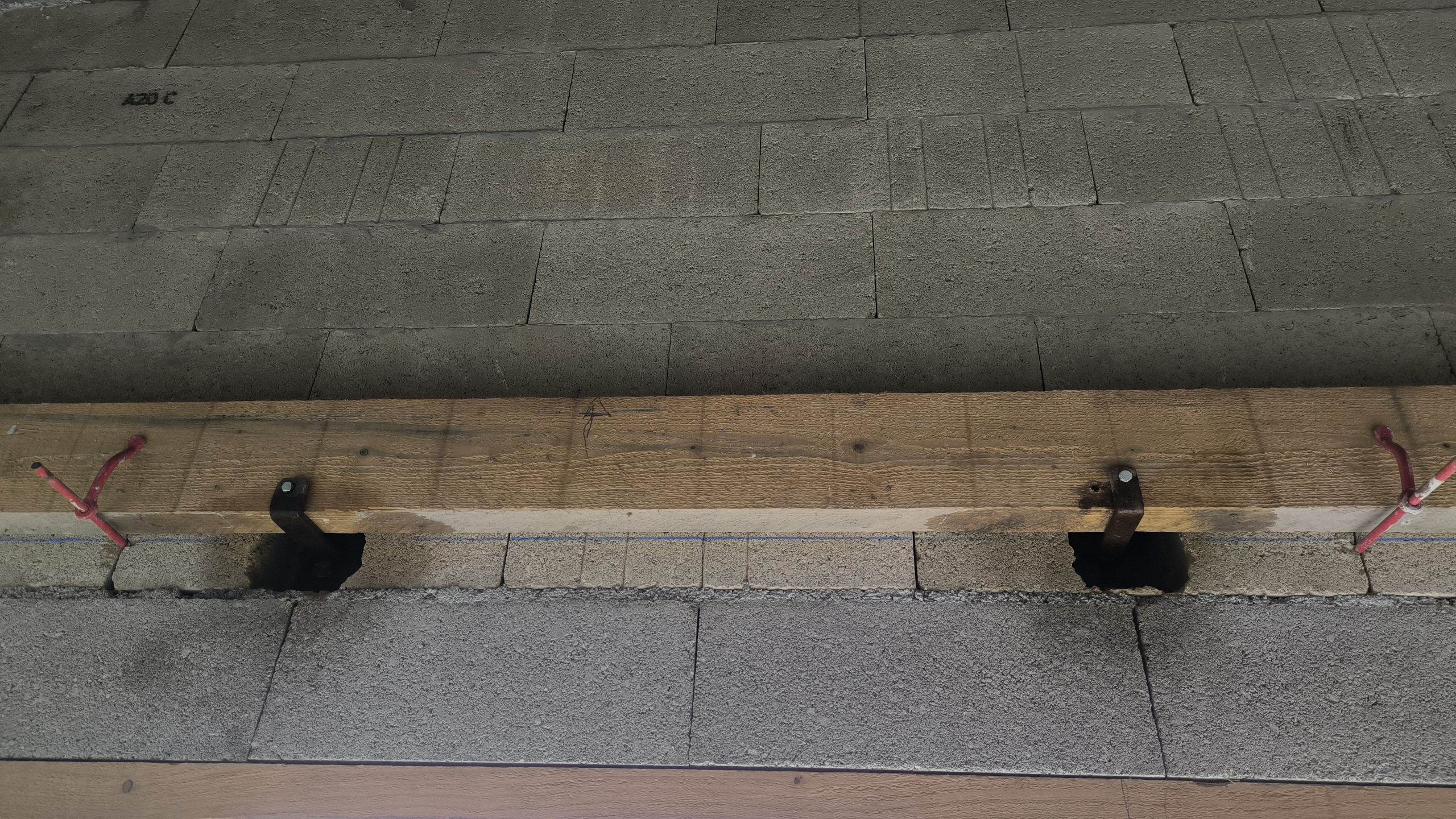 Etape 2 : Fixation des bastaings. Côté nouveau mur pas de soucis il faut couper le bois à la bonne longueur, l’enquiller dans le trou du mur et le positionner à la bonne hauteur et le tenir avec des chevillettes. Reste ensuite à reboucher les trous. Une fois sec retirer les chevillettes.