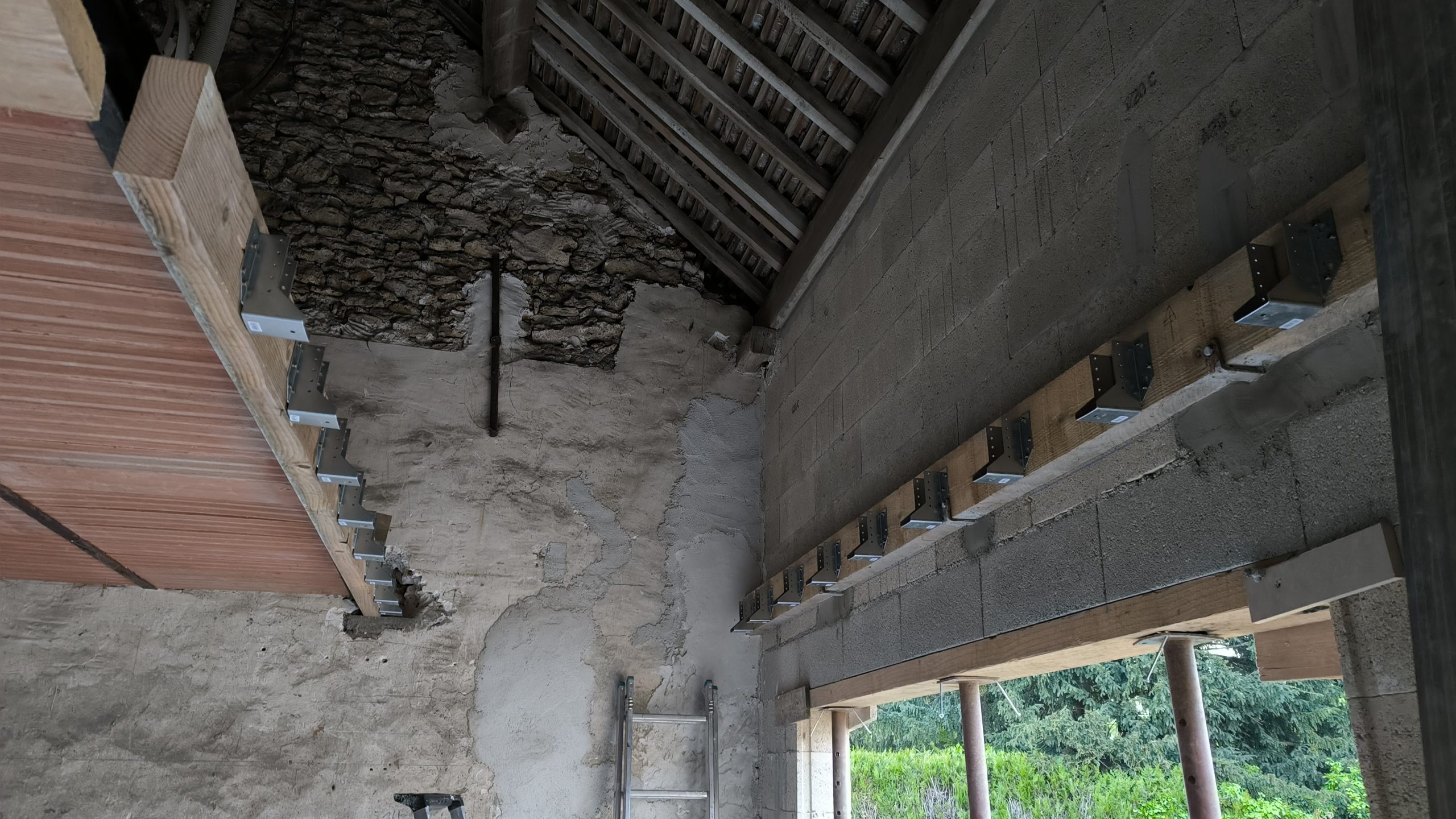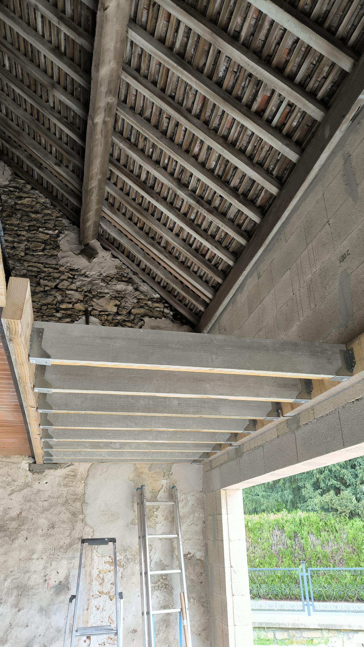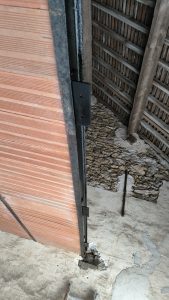 Côté grange c’est donc 2 trous dans le mur. Dans le nouveau mur de façade du garage c’est trois trou dans le parpaing pour y insérer des corbeaux (pièces en métal courbées) et du côté de l’ancien plafond j’ai demandé à mon beau-frère de souder 3 grosses équerres (20cm de long et 7mm d’épaisseur). J’ai ensuite peint tout ce qui était métal en noir
