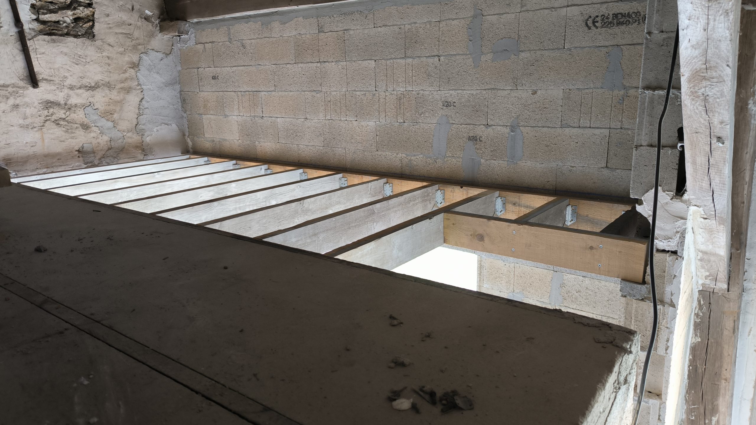 Comme promis reprise des travaux dans le garage pour créer un plancher à la place du plafond que j’ai détruit. Je profite des moments de pluie pour faire ça en parallèle de la pose du carrelage de la terrasse.
