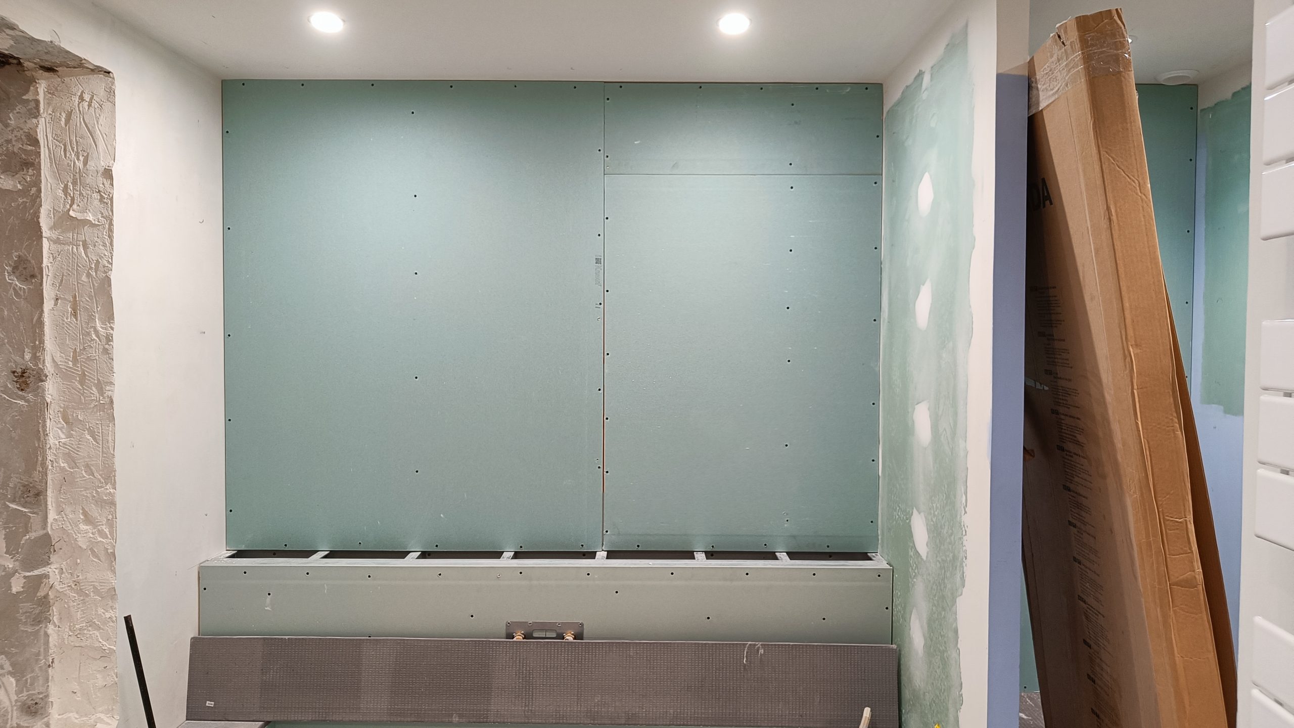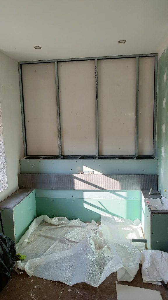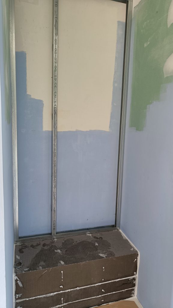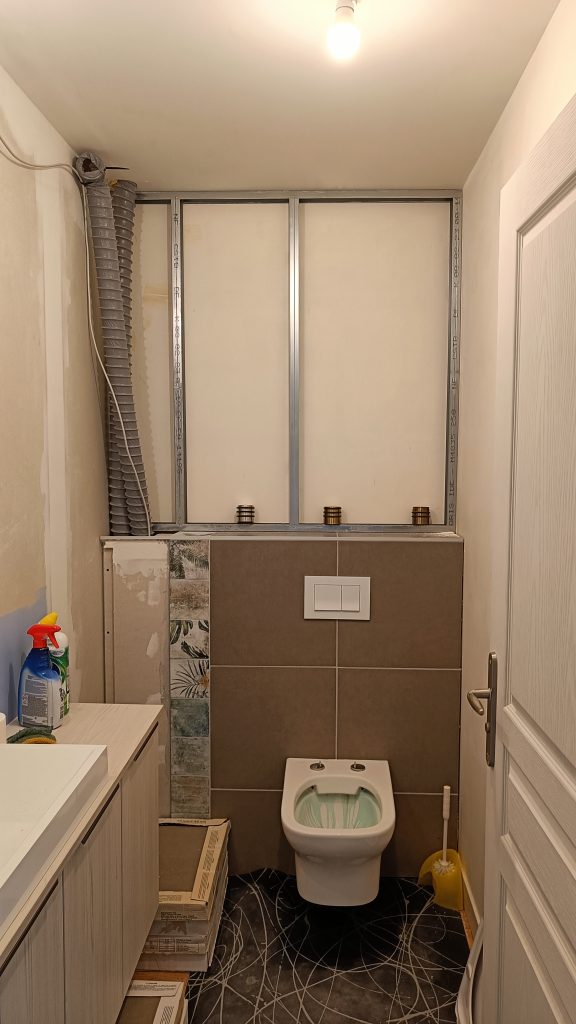 Après avoir isolé le mur nord dans la chambre enfant il y a quelques jours, j’ai continué à faire de même dans les pièces adjacentes : salle de bain, douche et wc.