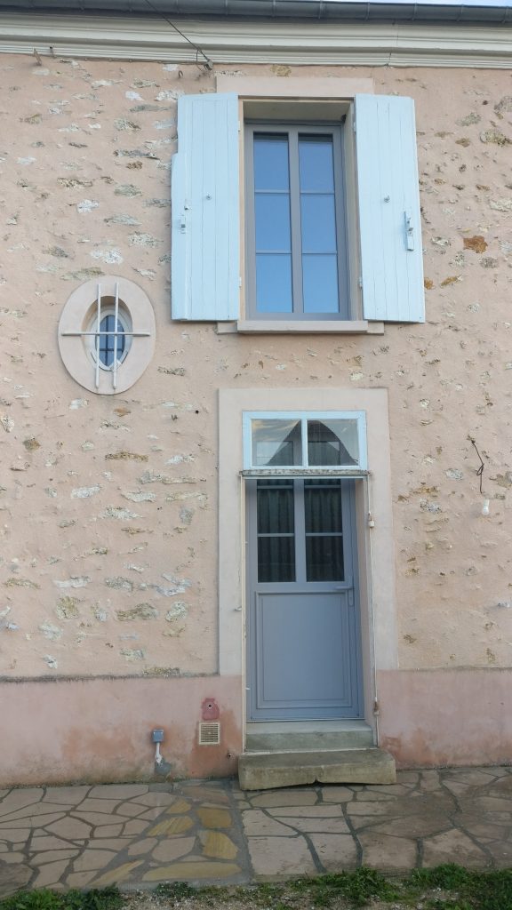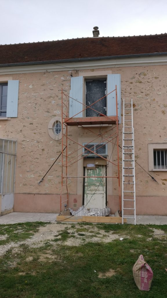La façade de la maison est en bon état, par contre, je ne sais pas trop pourquoi, les tableaux de deux fenêtres n’ont pas été faits… enfin, la feuillure du volet a été faite avec des baguettes et du crépis plat, mais les tableaux en eux-mêmes sont restés en plâtre. Une hypothèse est que comme les pièces derrières était utilisées en stockage, pas besoin de faire propre… maintenant il le faut le faire.. et assez rapidement car on a décidé de mettre des volets roulants sur toutes les fenêtres de la façade.