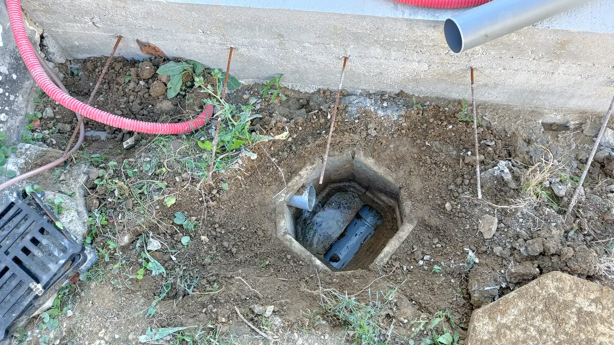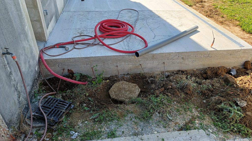 Sur le devant pour poser des dalles en attendant de faire la nouvelle marche… ou le nouveau tour de maison plus haut ce qui évitera la marche. J’ai aussi l’évacuation du caniveau à faire. J’ai commencé par lui et là, la tuile, en retirant la terre, quelques centimètres plus bas et 10cm à côté de la tranchée de la mini-pelle pour faire les fondations je suis tombé sur…. un regard… du coup pour le moment je suis bloqué. Ce regard sert pour l’eau usée de la cuisine. Je ne peux donc pas le reboucher. Par contre avoir un regard en plein milieu du passage vers la terrasse ne me tente pas du tout! Il faut que je me renseigne sur ce qu’il est possible de faire (le supprimer et le remplacer par un coude PVC ?).