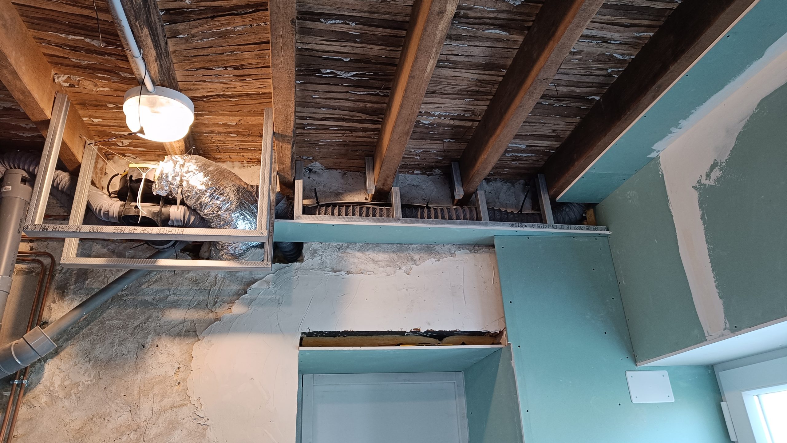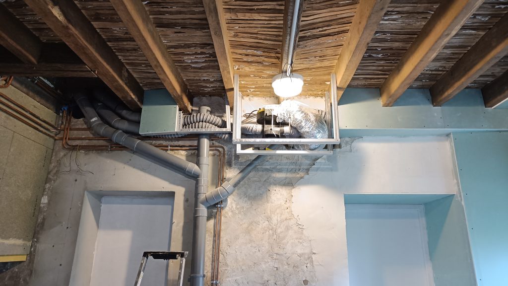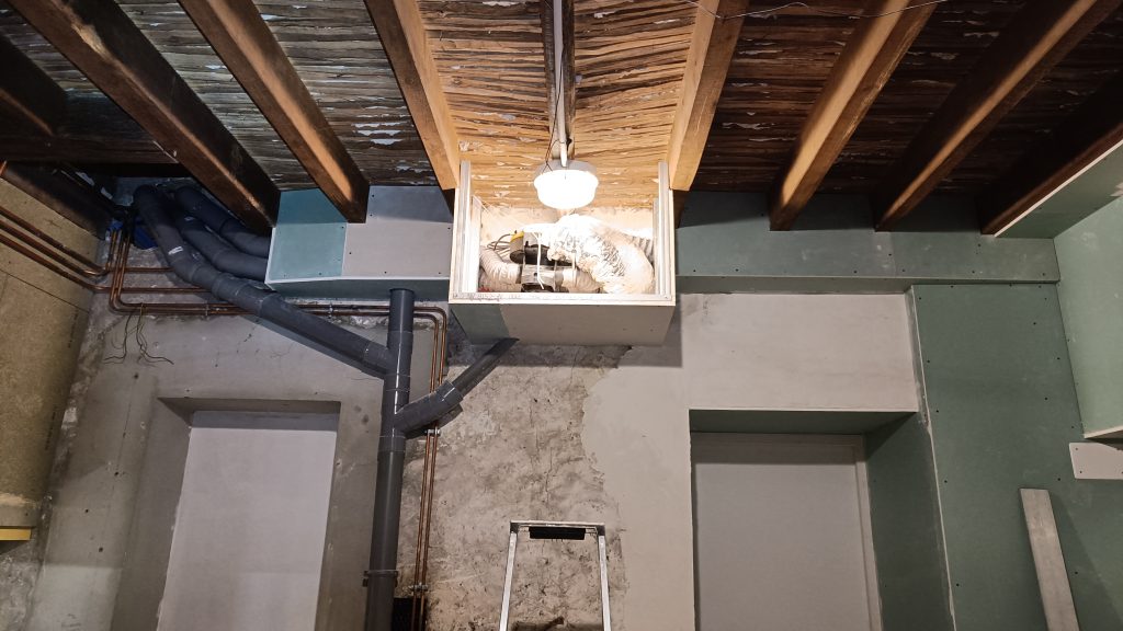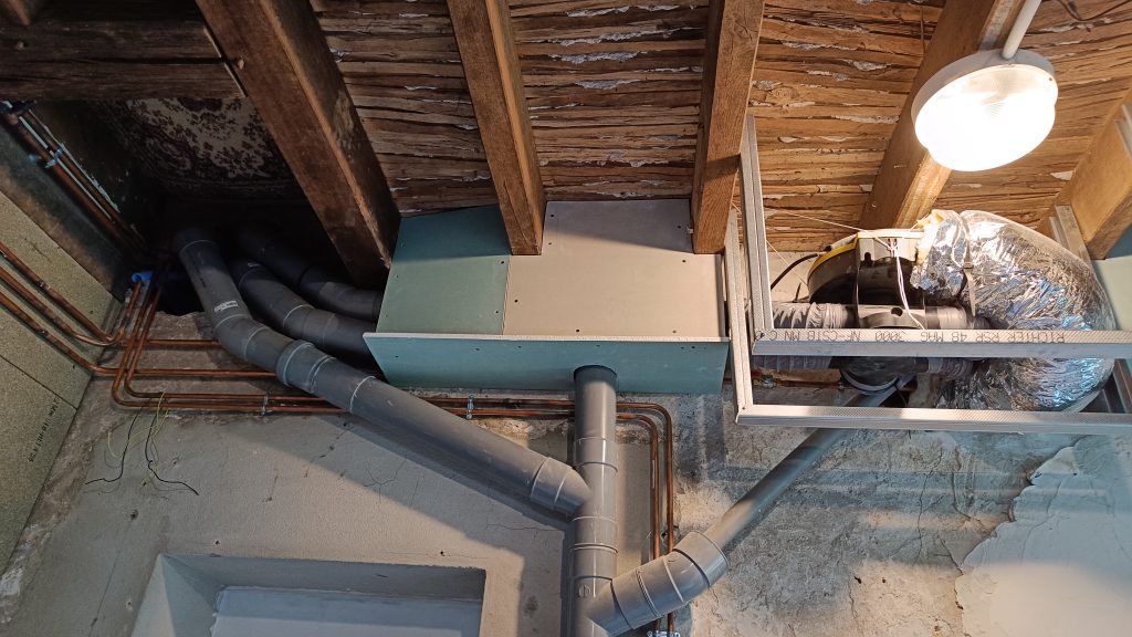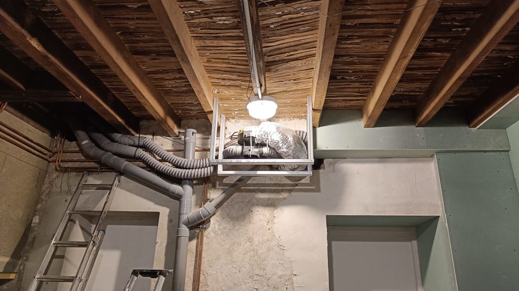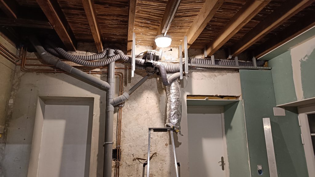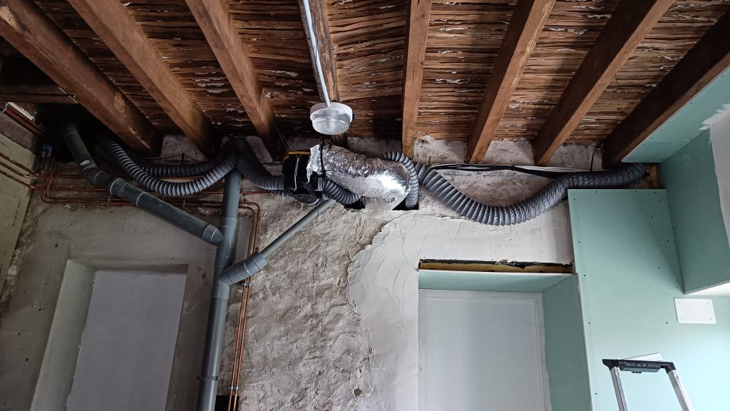 Nous souhaitons garder une parie du mur apparent, à l’ancienne… hé oui ça sera le seul endroit de la maison que nous aurons pas plaqué.. avec la cave. Du coup je vais faire un petit coffrage à gauche et a droite du bloc VMC, et un cube un peu plus gros pour la VMC. A gauche, au niveau du passage dans le mur pour aller au premier, il y a une trappe qui permet d’accéder à la pièce vide située au dessus du cellier. Je ne peux pas laisser les gaines en souple. Je vais donc les faire passer dans deux tubes PVC diamètre 100, puis je comblerai le trou (un autre jour).